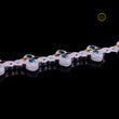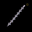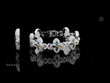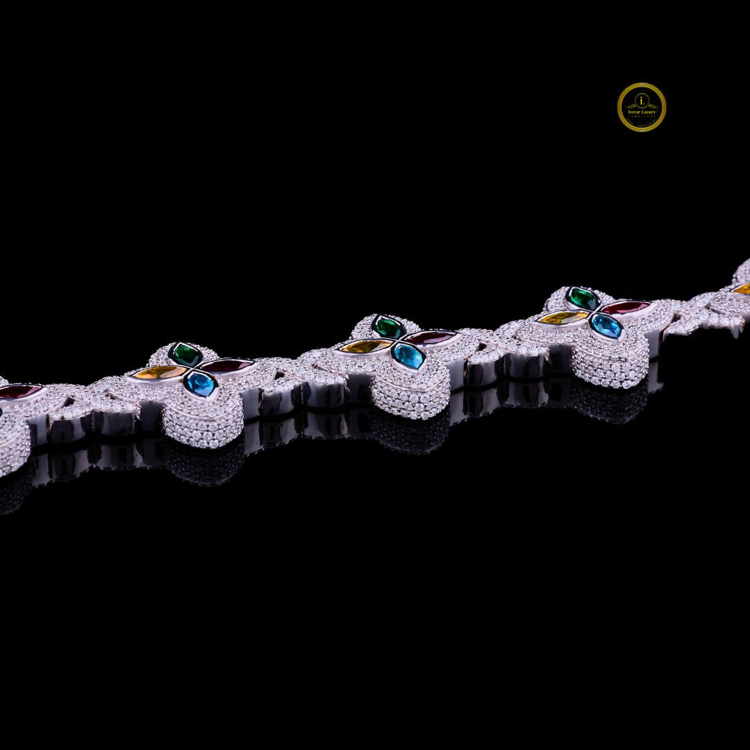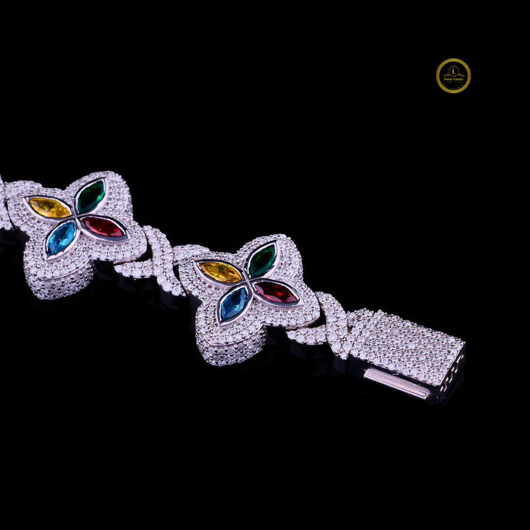 The design features raised, recurring floral shapes that are themselves entirely paved with small moissanite stones, giving the bracelet a highly textured and luxurious "iced-out" appearance. It utilizes a white/silver-toned metal which enhances the brilliance of the moissanite. The bangle is a substantial piece, designed to make a dramatic statement with its continuous pattern and dense diamond coverage, combining a classic floral design with modern, high-volume sparkle.