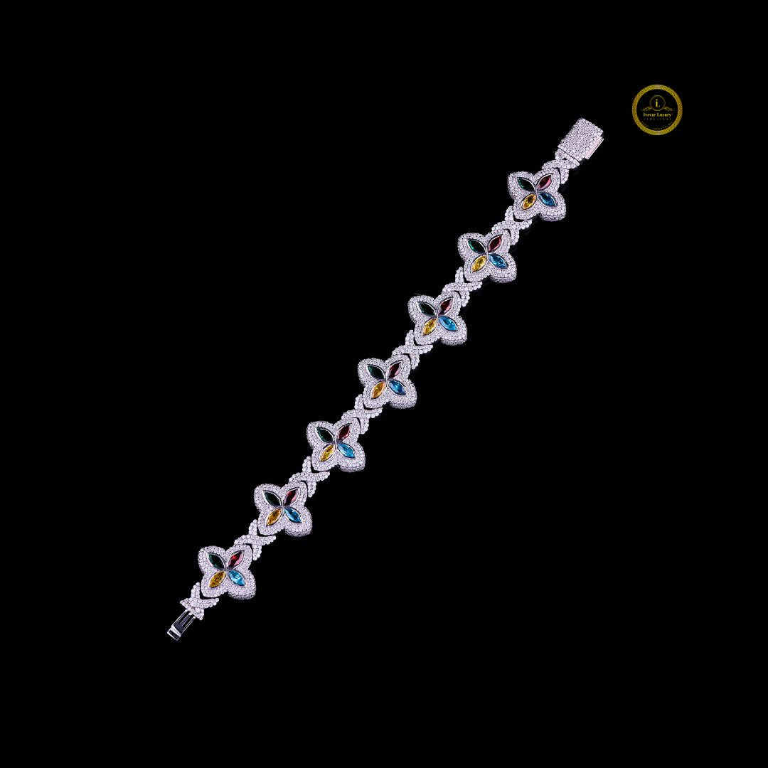 This is a striking, bold bangle bracelet from Ivevar Luxury, distinguished by its intricate floral/quatrefoil motif. The solid metal bangle is covered in paved, brilliant-cut moissanite diamonds for maximum sparkle.