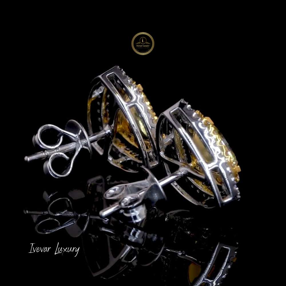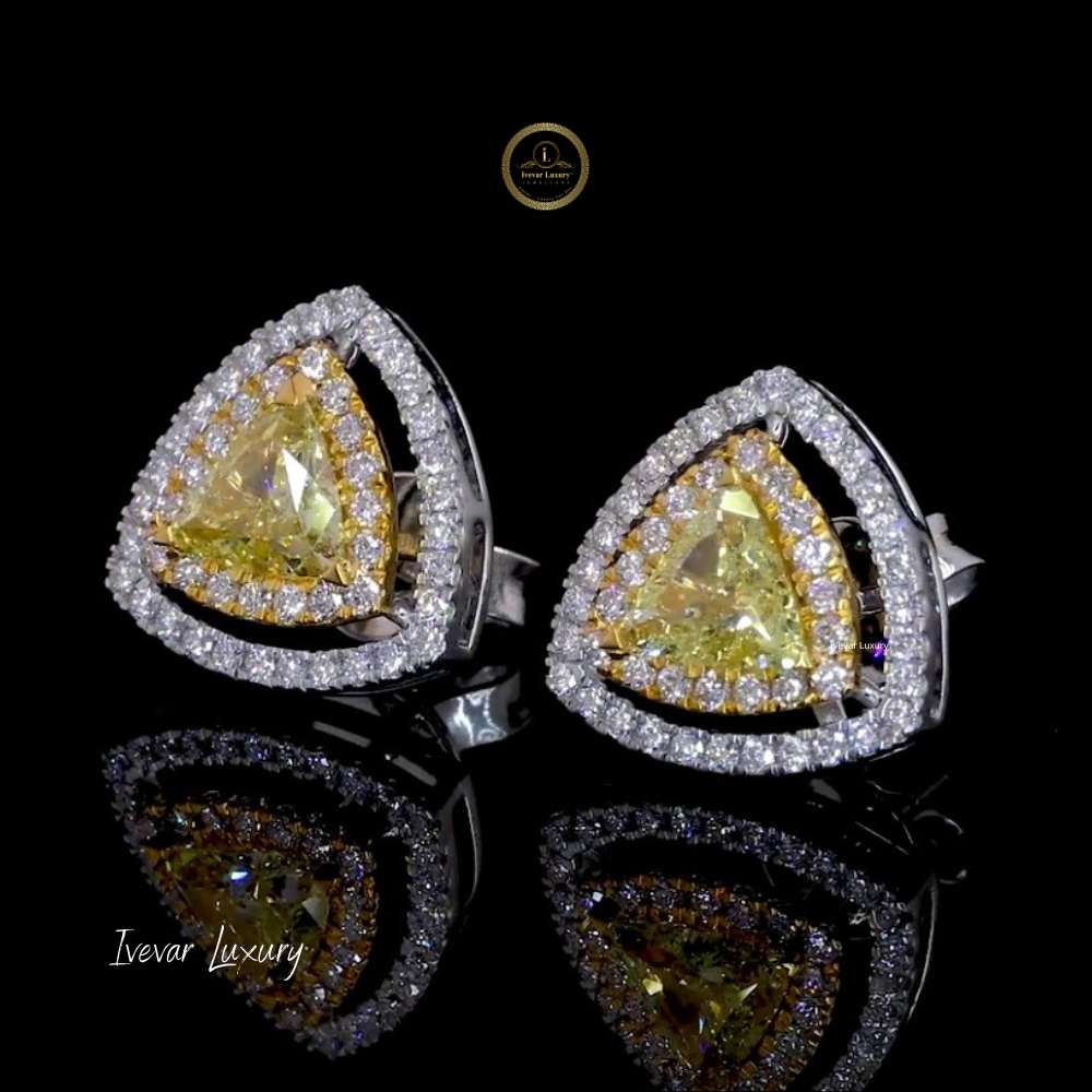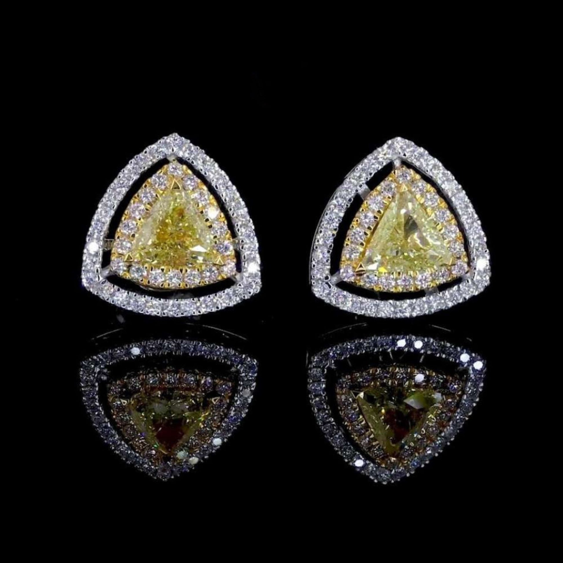 This striking pair of earrings is crafted in 14k white gold and features a bold, triangular design. The centerpiece of each earring is a vivid yellow natural diamond cut in a trillion shape, which is immediately eye-catching. This central stone is then surrounded by a magnificent double halo of smaller, brilliant white diamonds, amplifying the overall size and brilliance. The combination of the warm yellow diamond and the contrasting cool white gold and white diamonds creates a highly luxurious and dramatic look. These earrings are a powerful statement piece, blending unique stone color and modern geometry with classic diamond elegance.