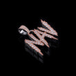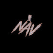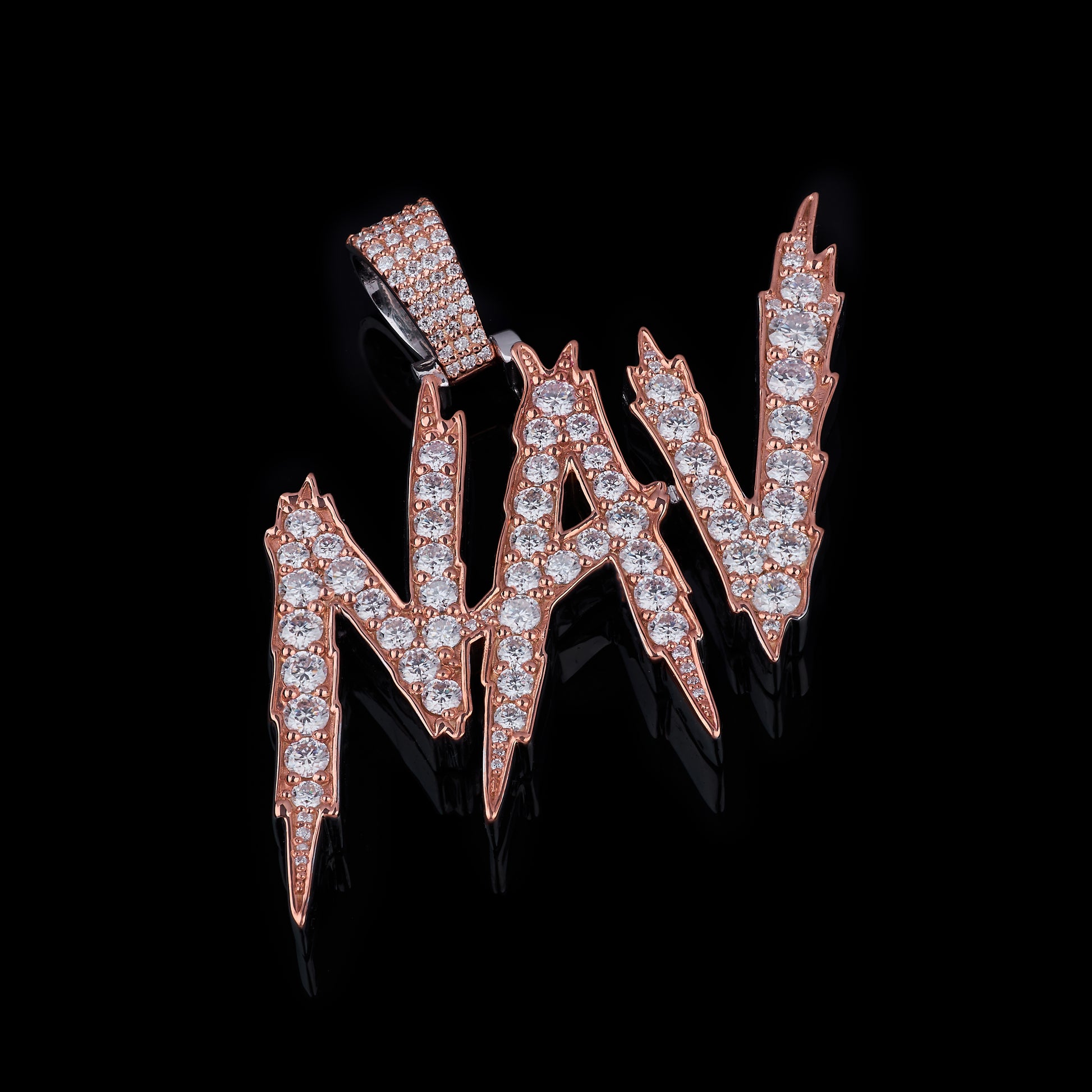 The pendant spells out the name "NAV" in a jagged, electrifying script, giving it a high-energy look. The entire piece is fully "iced out" with brilliant, pave-set Lab Grown diamonds that highlight the sharp, zig-zagging edges of the letters. It appears to be set in a rose gold tone, providing a warm metallic contrast to the cool white sparkle of the Lab Grown . The small, rectangular bail is also iced out, completing the custom, luxurious, and edgy statement piece