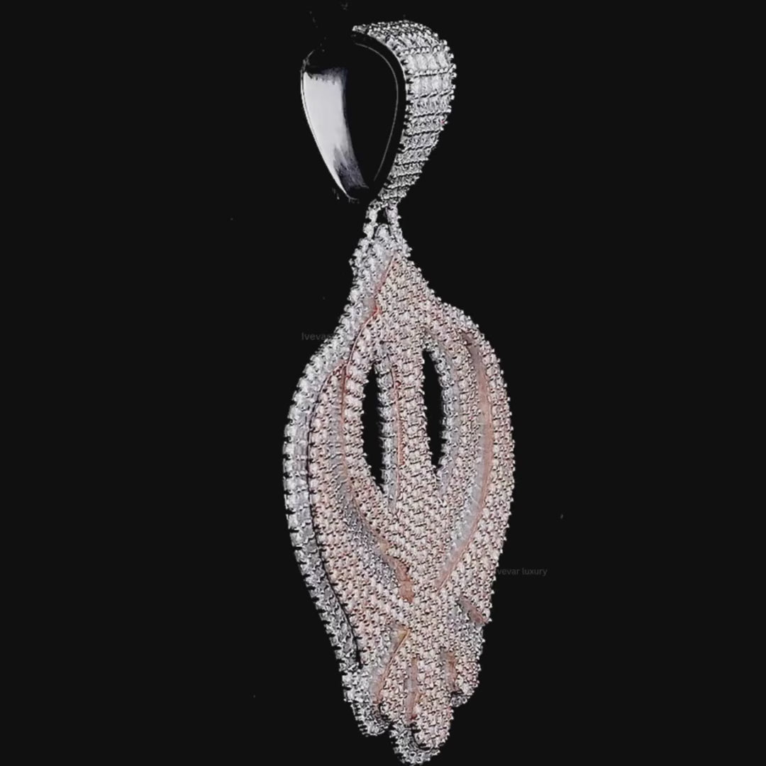 The pendant is very substantial and uses a striking two-tone design with white metal and a contrasting rose gold color. The entire surface is heavily "iced out" with brilliant moissanite diamonds. The white moissanite contrasts beautifully with the un-iced rose gold sections, highlighting the outline of the crossed swords and central circle. The piece's size and the intricate detailing on the large, baguette-set bail make this a powerful, luxurious statement of faith or identity.