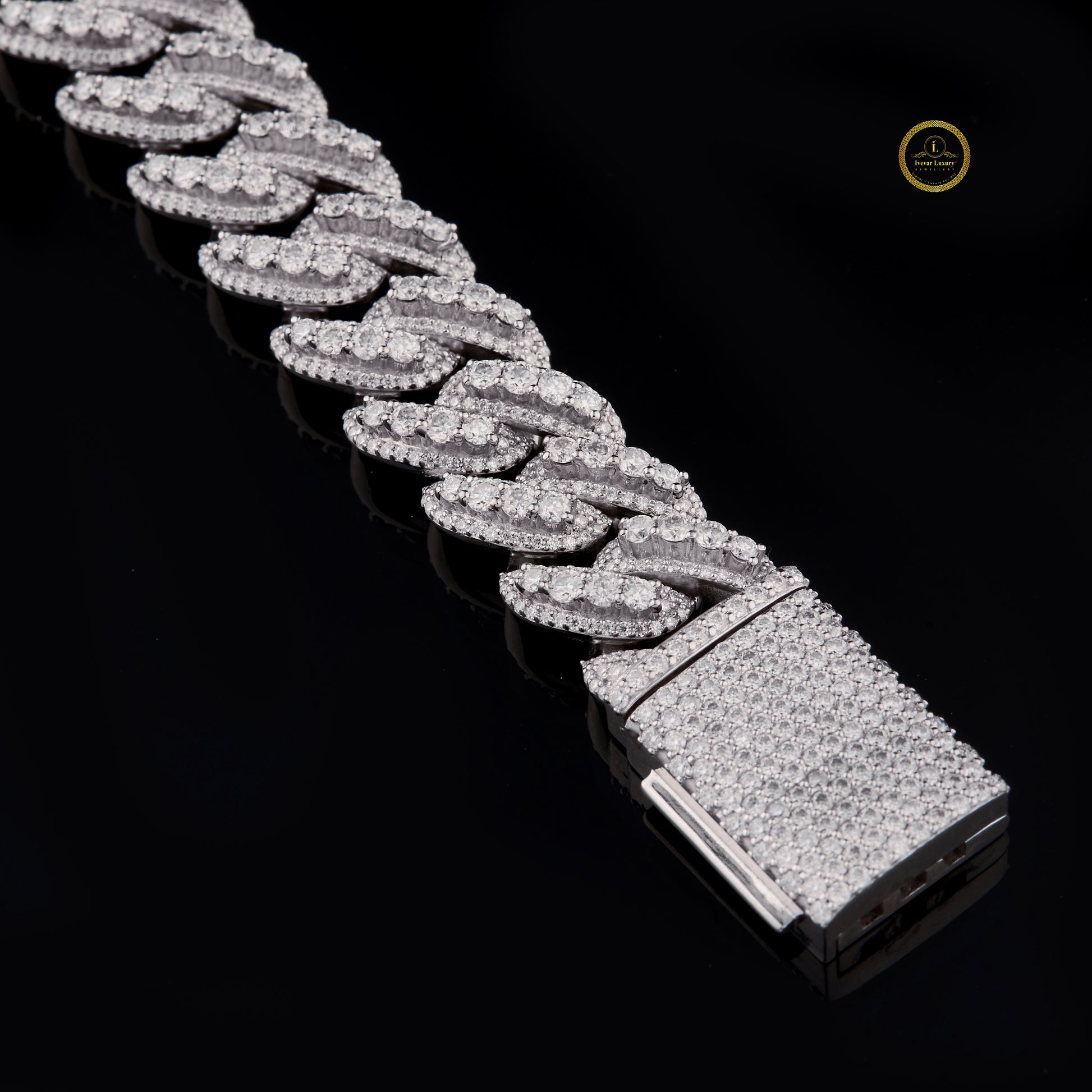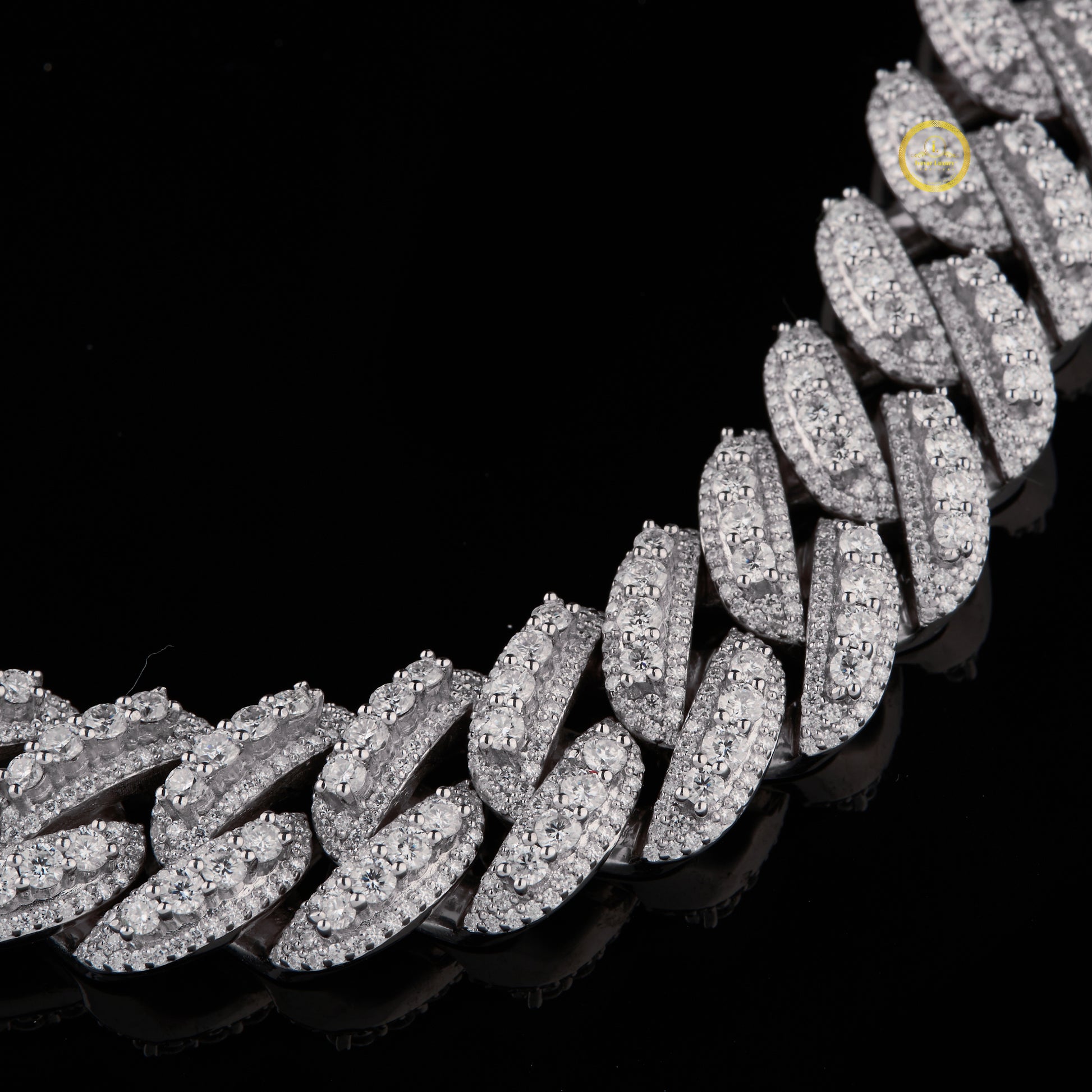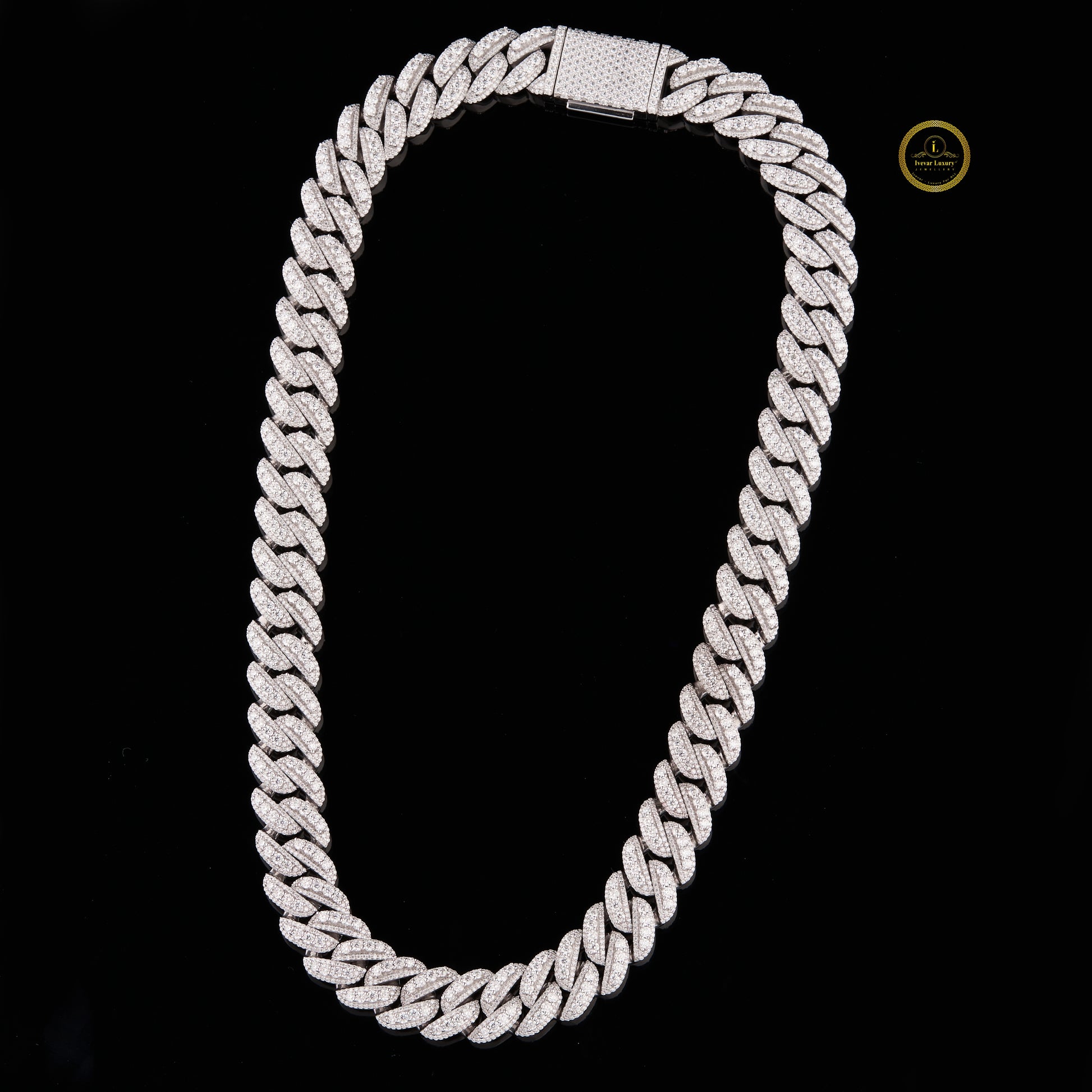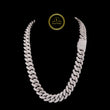 This striking piece is a Cuban link chain, characterized by its thick, interlocking, and often curved links. This particular design features moissanite "diamonds" pave-set across every link, providing a brilliant, high-shine, iced-out aesthetic that is popular in luxury and street fashion. Moissanite is a durable, ethically sourced gemstone known for its exceptional brilliance and fire, often surpassing that of natural diamonds, while offering a more accessible price point. The chain appears to have a secure box clasp also fully iced-out with stones. The heavy, articulated structure makes it a bold statement piece, ideal for standalone wear or layering. It's a modern take on a classic jewelry silhouette, blending timeless design with contemporary sparkle.