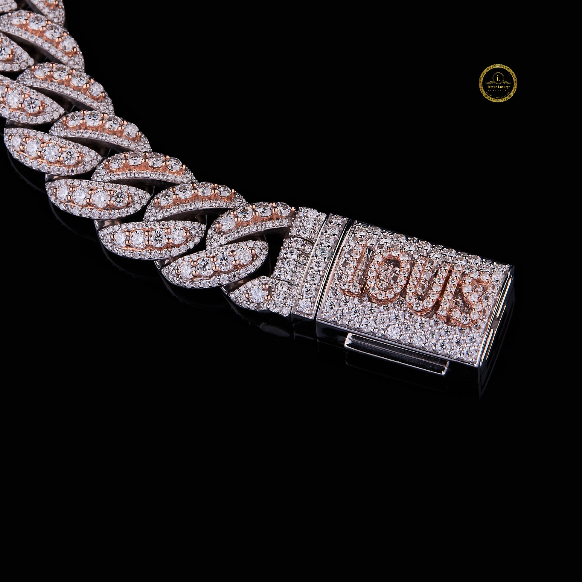 The piece is personalized with an integrated box clasp that reads "LOUIS" in a contrasting metal, likely rose gold, providing a distinct and customized signature element. The continuous curve of the links gives the chain a sleek, polished, and substantial look, while the use of lab-grown diamonds ensures an ethical and visually stunning alternative to natural diamonds. This chain is a bold, individualized statement piece that perfectly blends classic jewelry design with modern ethical luxury.