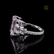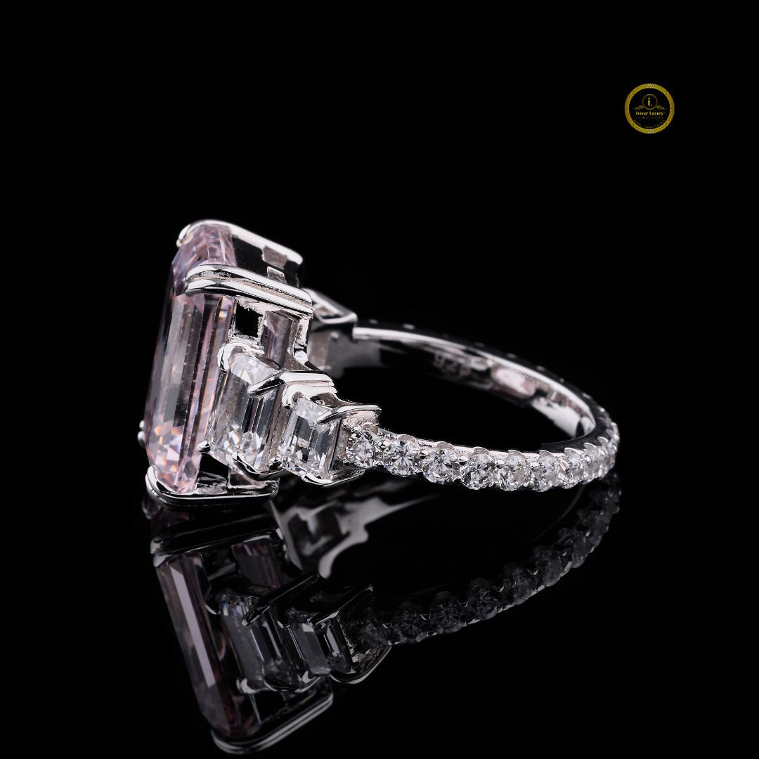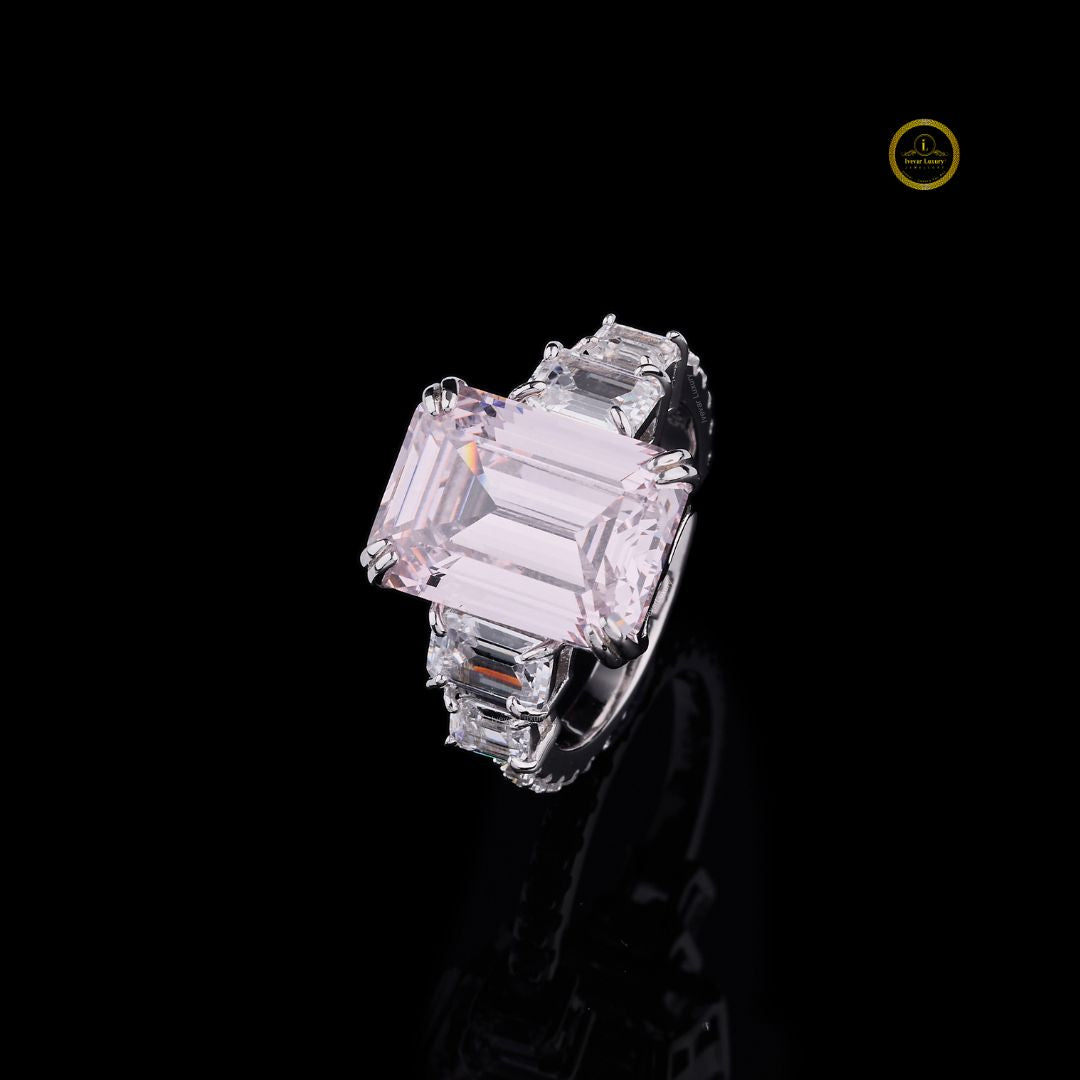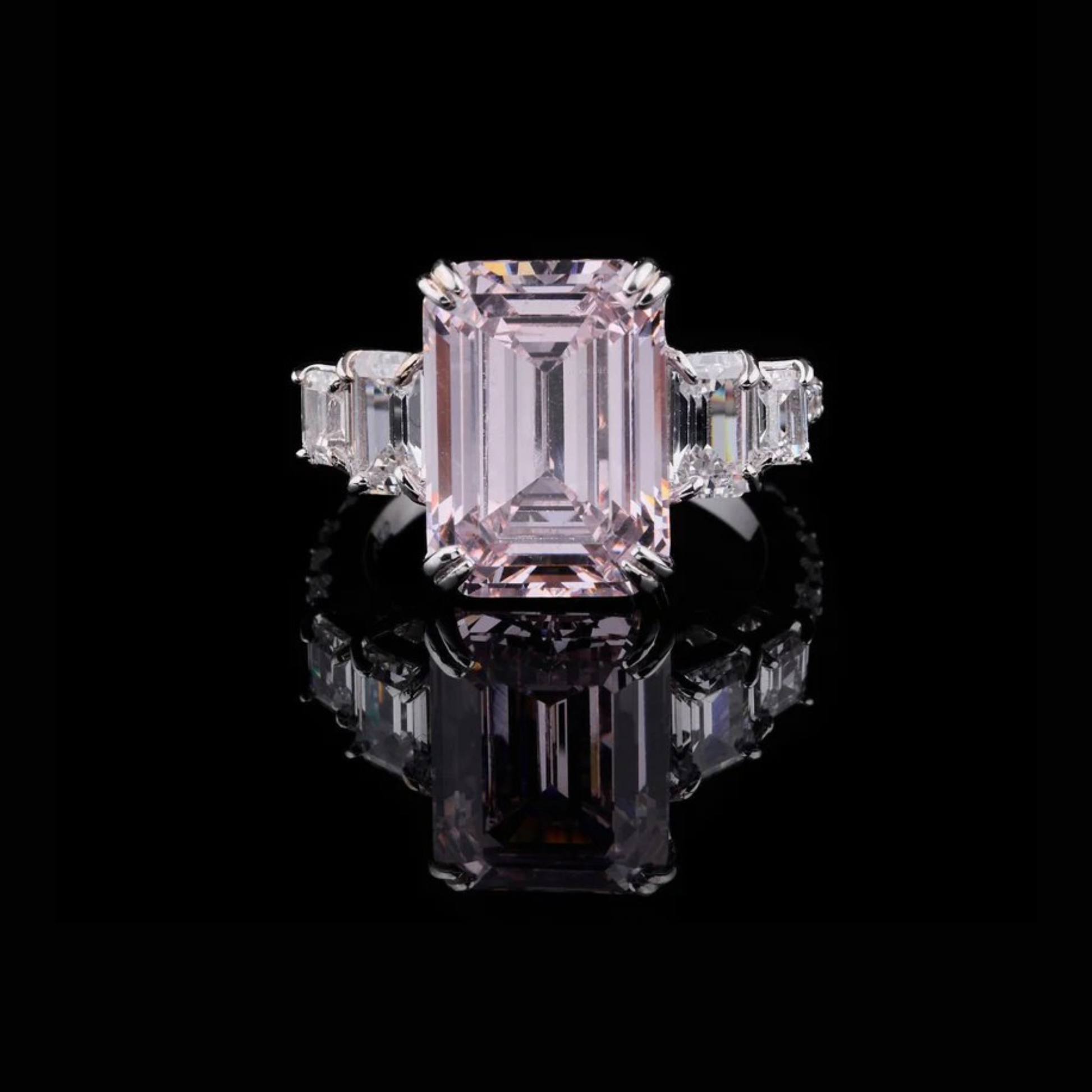Indulge in the allure of refined elegance with this magnificent emerald-cut pink diamond ring, masterfully set in luminous platinum. The center stone—an exquisite pastel pink diamond—radiates with flawless precision, its crisp step-cut facets Flanked by perfectly matched round-cut diamonds on each side, the design balances symmetry, sophistication, and striking visual depth. This luxurious composition exudes timeless glamour, making it an extraordinary statement piece for collectors, connoisseurs, and those who appreciate rare, high-jewelry craftsmanship.