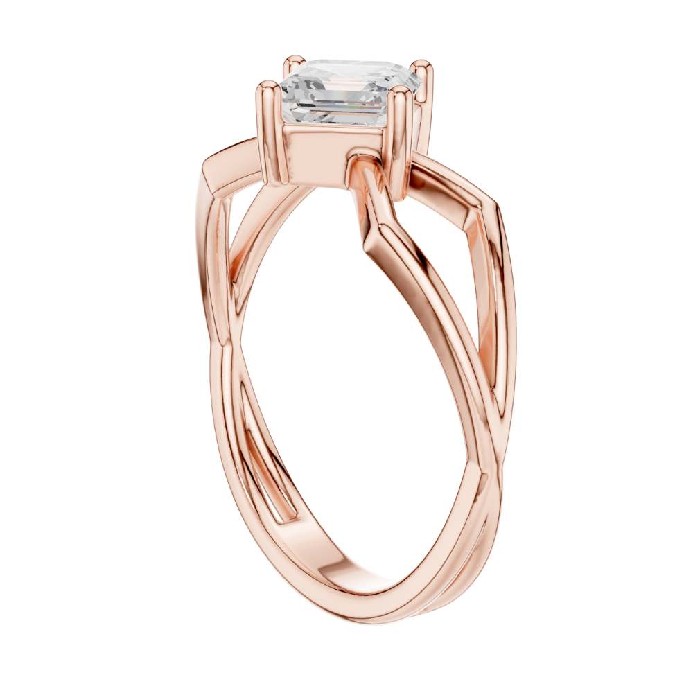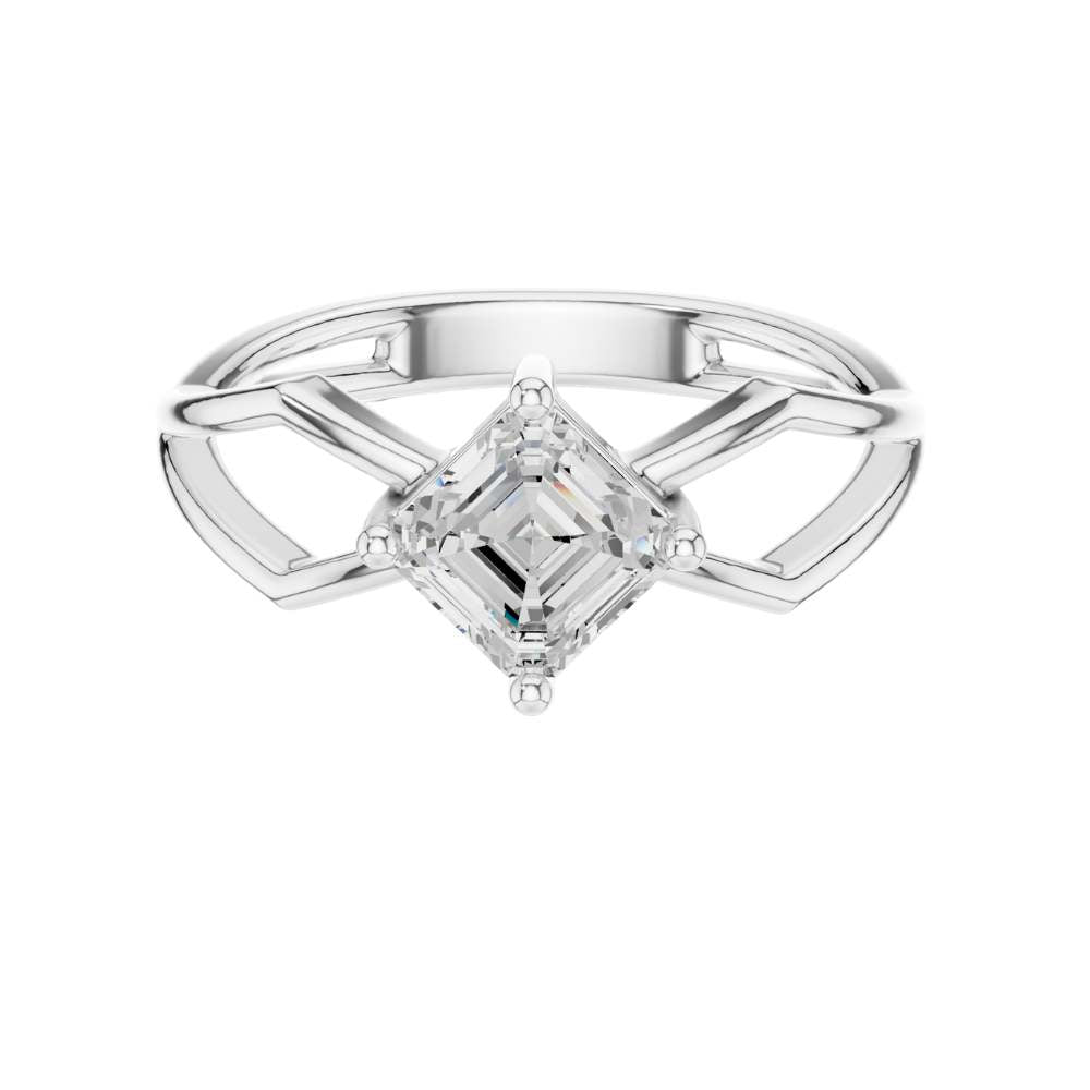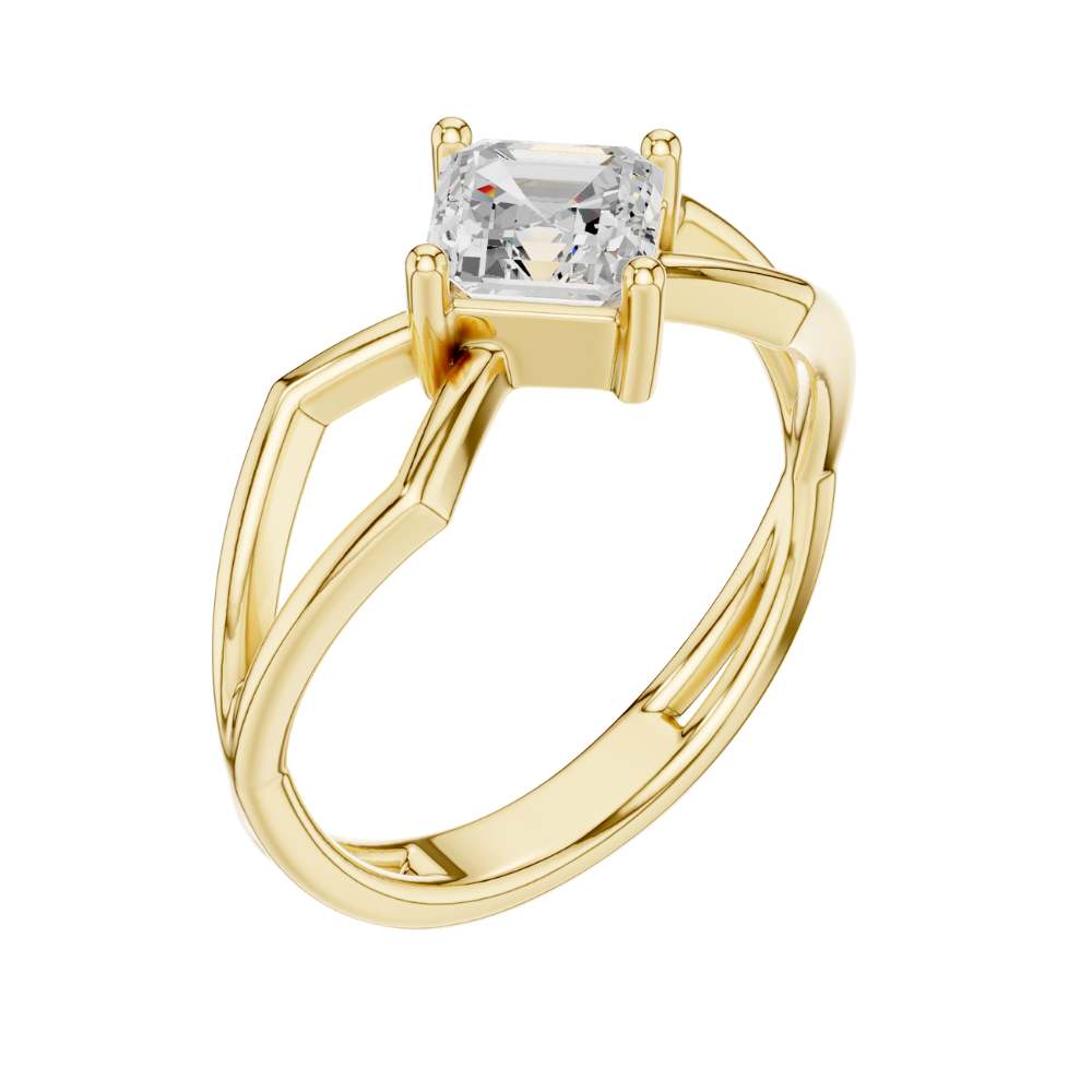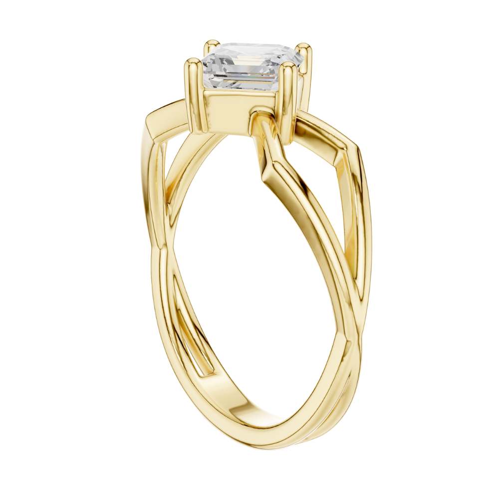 This striking engagement ring features a beautifully faceted emerald square-cut diamond set on an intricate open split-shank band crafted in polished gold. The geometric design surrounding the center stone creates a bold architectural look, enhancing the diamond’s depth, symmetry, and captivating hall-of-mirrors effect. Modern yet timeless, this ring blends elegance with artistic structure, making it a standout piece for someone who appreciates unique, contemporary design by Ivevar.