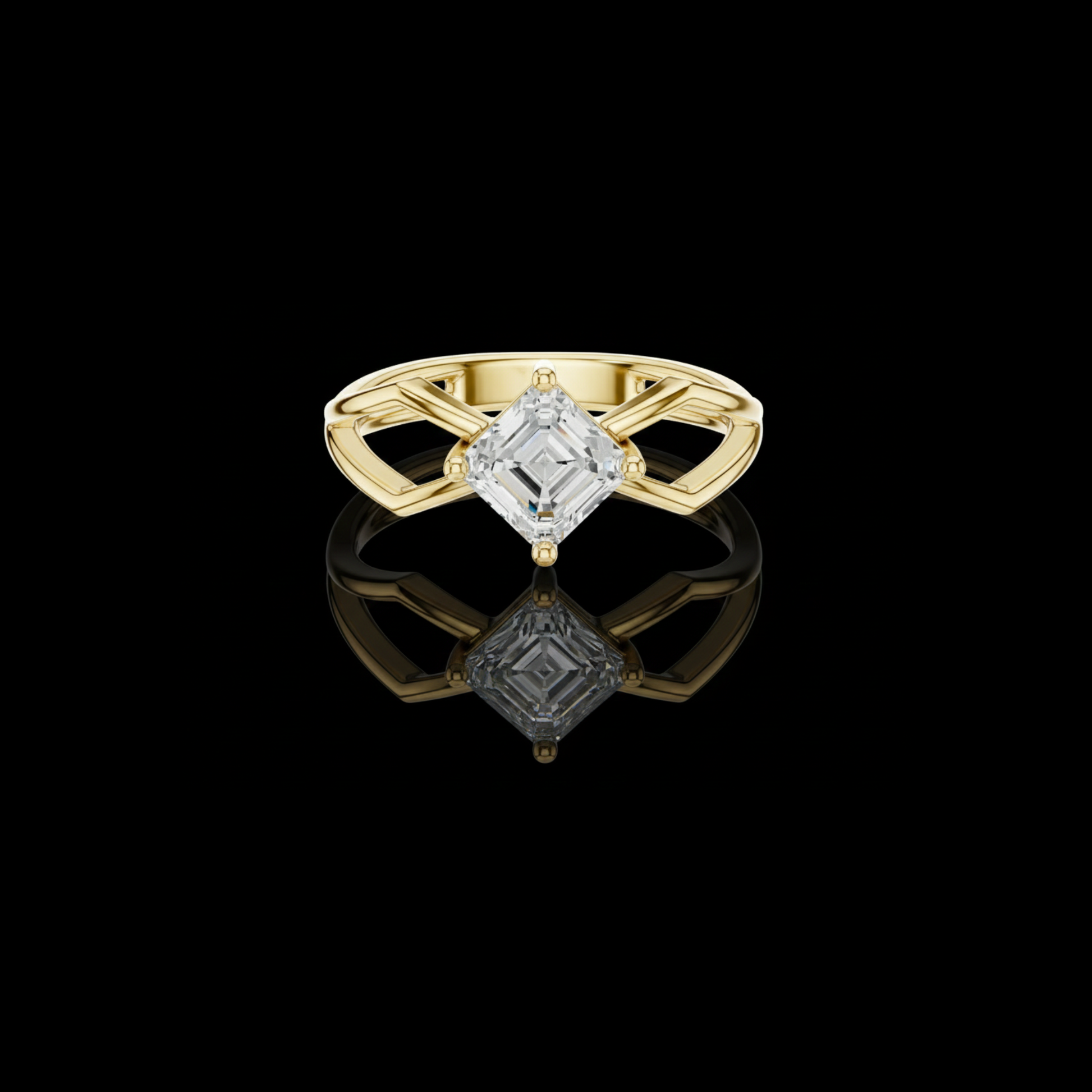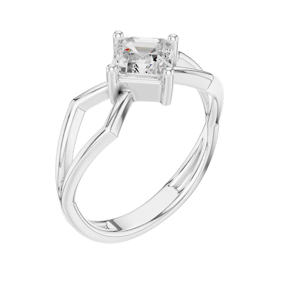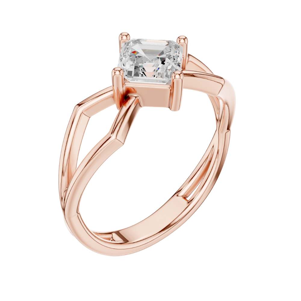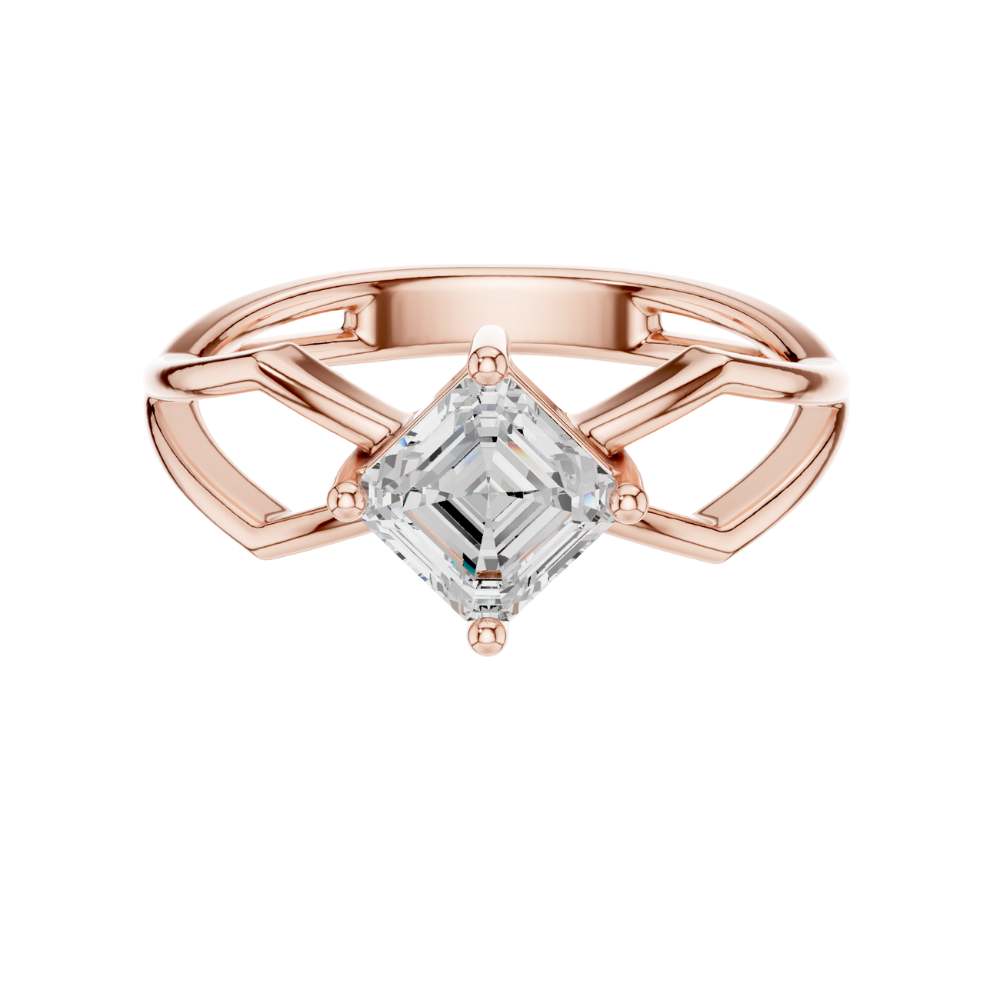 This striking engagement ring features a beautifully faceted emerald square-cut diamond set on an intricate open split-shank band crafted in polished gold. The geometric design surrounding the center stone creates a bold architectural look, enhancing the diamond’s depth, symmetry, and captivating hall-of-mirrors effect. Modern yet timeless, this ring blends elegance with artistic structure, making it a standout piece for someone who appreciates unique, contemporary design by Ivevar.