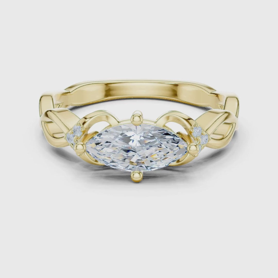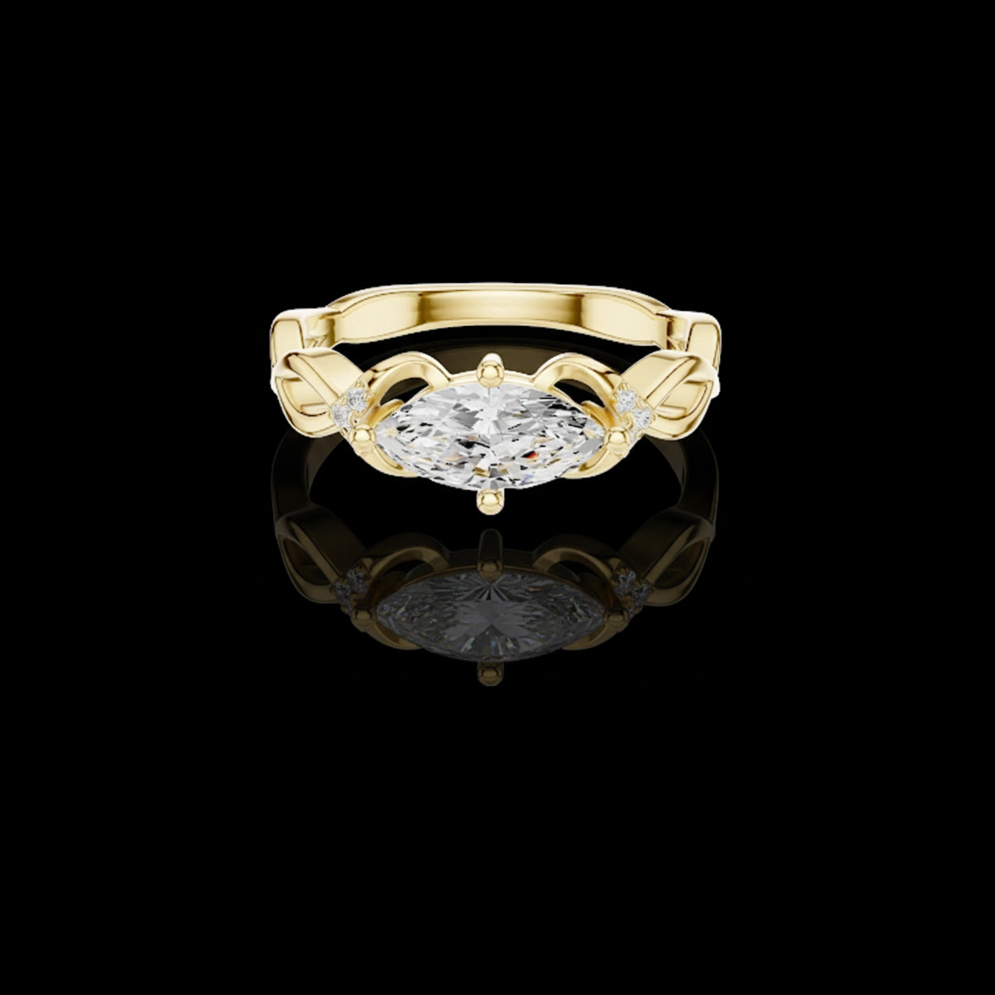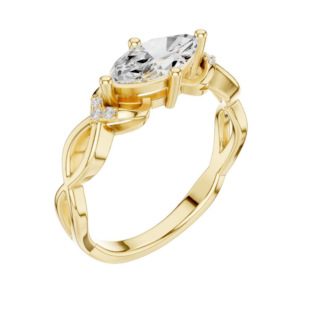 This elegant ring features a brilliant marquise-cut center diamond set in warm gold, framed by delicate accent stones on each side for added sparkle. Its standout feature is the beautifully sculpted twisted band, which creates a graceful, flowing silhouette that enhances the ring’s romantic character. The open, airy setting highlights the diamond’s elongated shape, making this piece both timeless and uniquely expressive—perfect for anyone seeking a refined yet distinctive design by Ivevar.