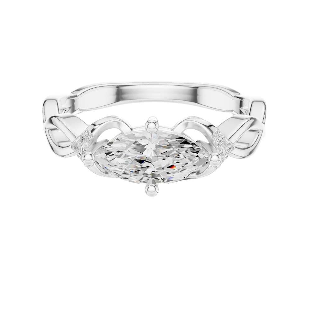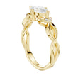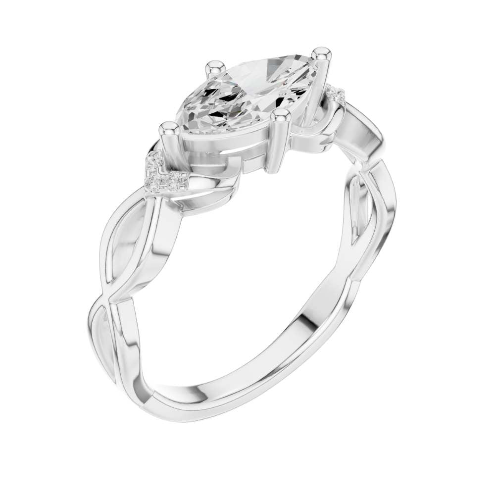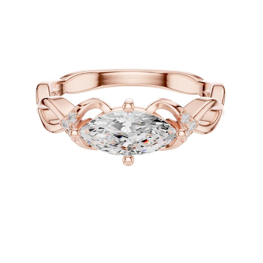 This elegant ring features a brilliant marquise-cut center diamond set in warm gold, framed by delicate accent stones on each side for added sparkle. Its standout feature is the beautifully sculpted twisted band, which creates a graceful, flowing silhouette that enhances the ring’s romantic character. The open, airy setting highlights the diamond’s elongated shape, making this piece both timeless and uniquely expressive—perfect for anyone seeking a refined yet distinctive design by Ivevar.