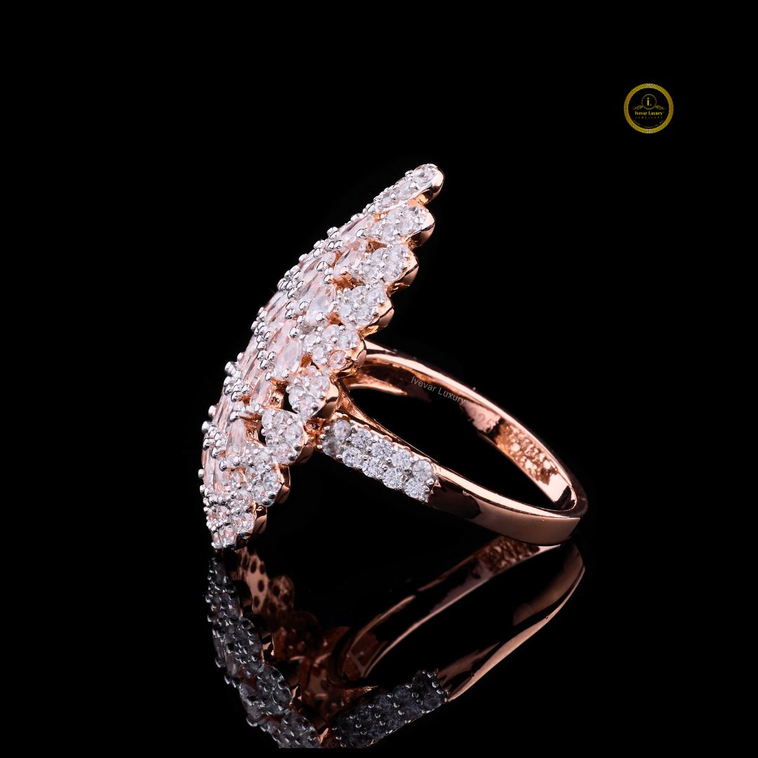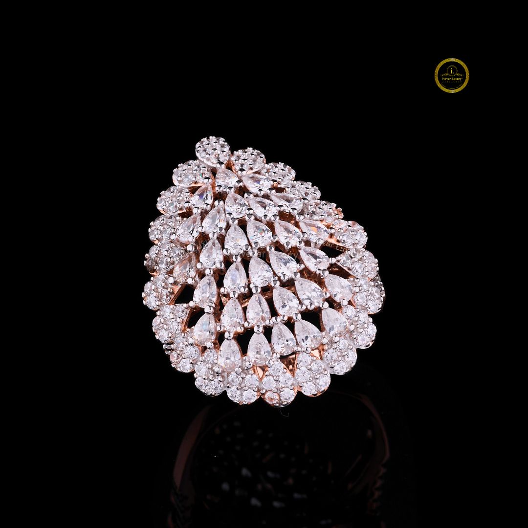 This majestic statement ring dazzles with a breathtaking cluster of pear-shaped diamonds, arranged in a layered teardrop pattern that radiates brilliance from every angle. Set in luxurious rose gold, the intricate design showcases exceptional craftsmanship and timeless elegance. Perfect for special occasions, this piece embodies grandeur, sophistication, and unparalleled sparkle, making it a true centerpiece of luxury jewelry.