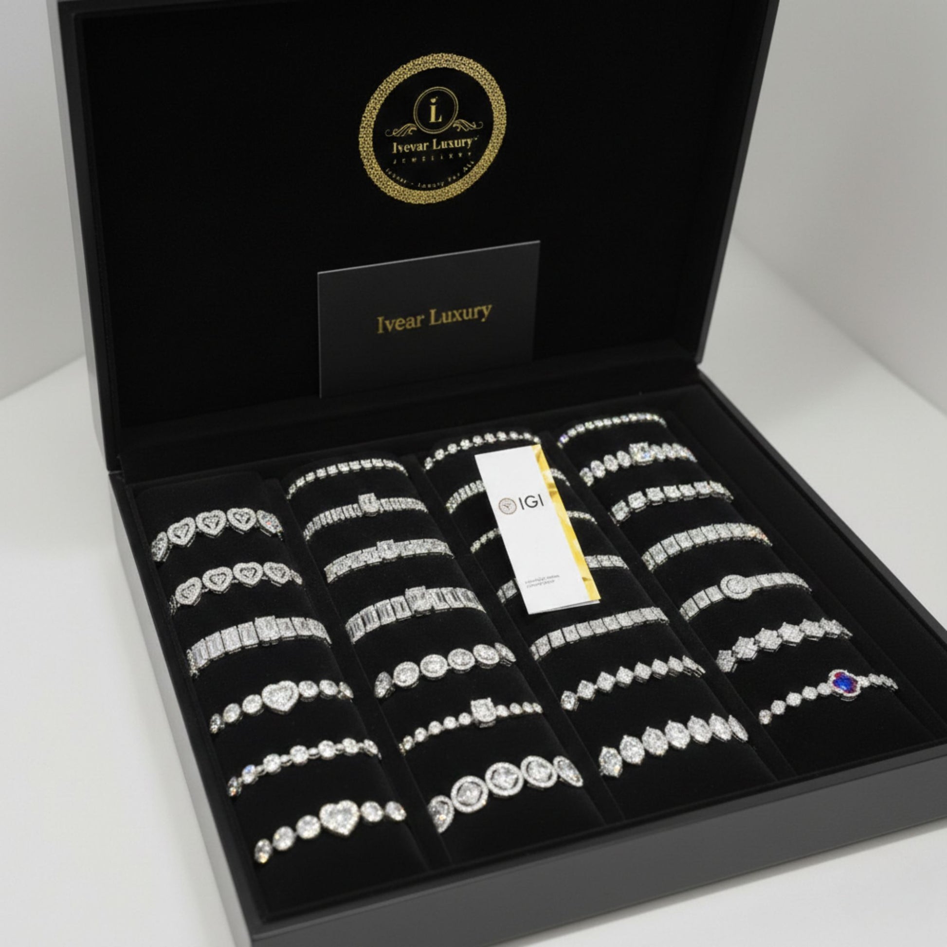 The design is characterized by repeating flower-shaped links, each centered with a contrasting, deep blue stone (likely a sapphire or similar gemstone) which is accented by sparkling lab-grown diamonds. The overall setting appears to be a warm rose gold color, which beautifully complements the dark blue and brilliant white stones. The bracelet is a sophisticated statement piece, suggesting luxury and intricate craftsmanship. As a lab-grown diamond piece, it offers excellent clarity and fire while presenting an ethical and high-quality alternative to traditional fine jewelry. It secures with a sleek clasp, making it suitable for special occasions.