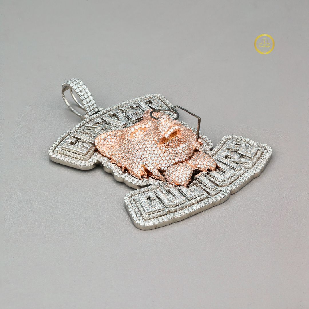 This jewelry piece is a striking example of hip-hop inspired luxury. It features a custom design centered around a distinctive character (appearing to be a stylized dog or wolf head wearing a monocle and bow tie) surrounded by paved settings spelling out a name or phrase, such as "CLEVER" and "WOLF" (though the full words are partially obscured). The pendant showcases a mix of metal colors, with the character in a rose/pink gold tone and the surrounding border in white gold or silver. The dense pave-set moissanite stones cover virtually the entire surface, maximizing the sparkle and making the piece a bold statement accessory. Moissanite is valued for its brilliance, durability, and affordability compared to natural diamonds.