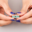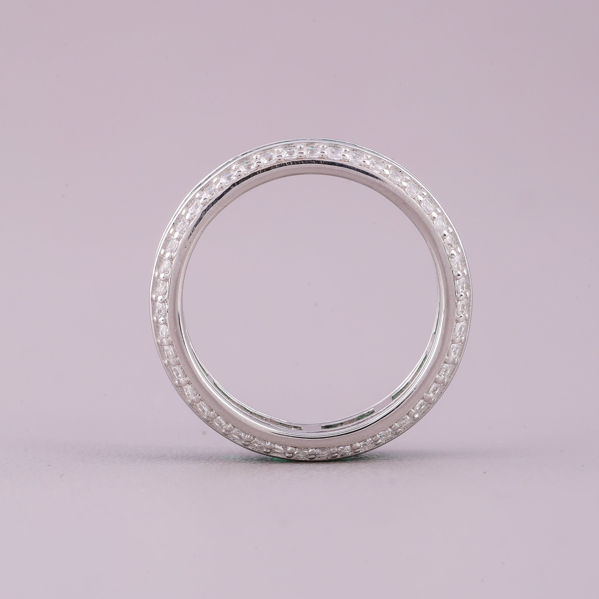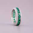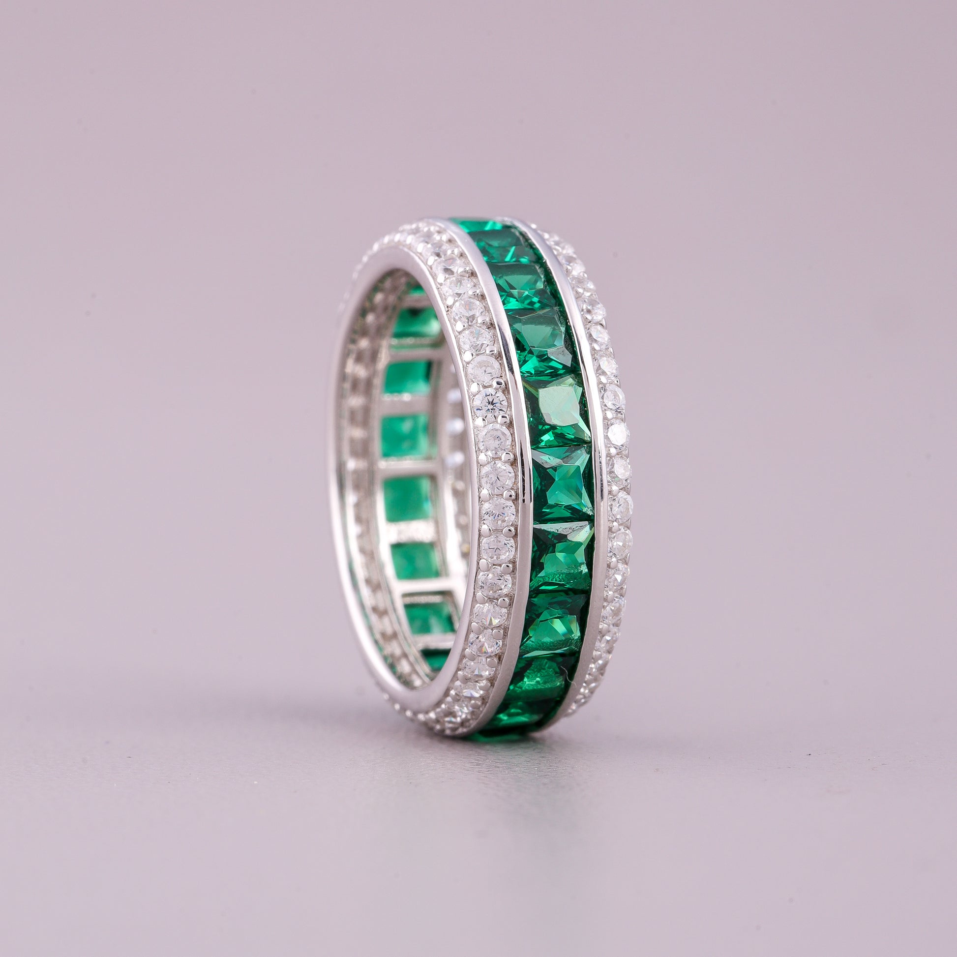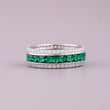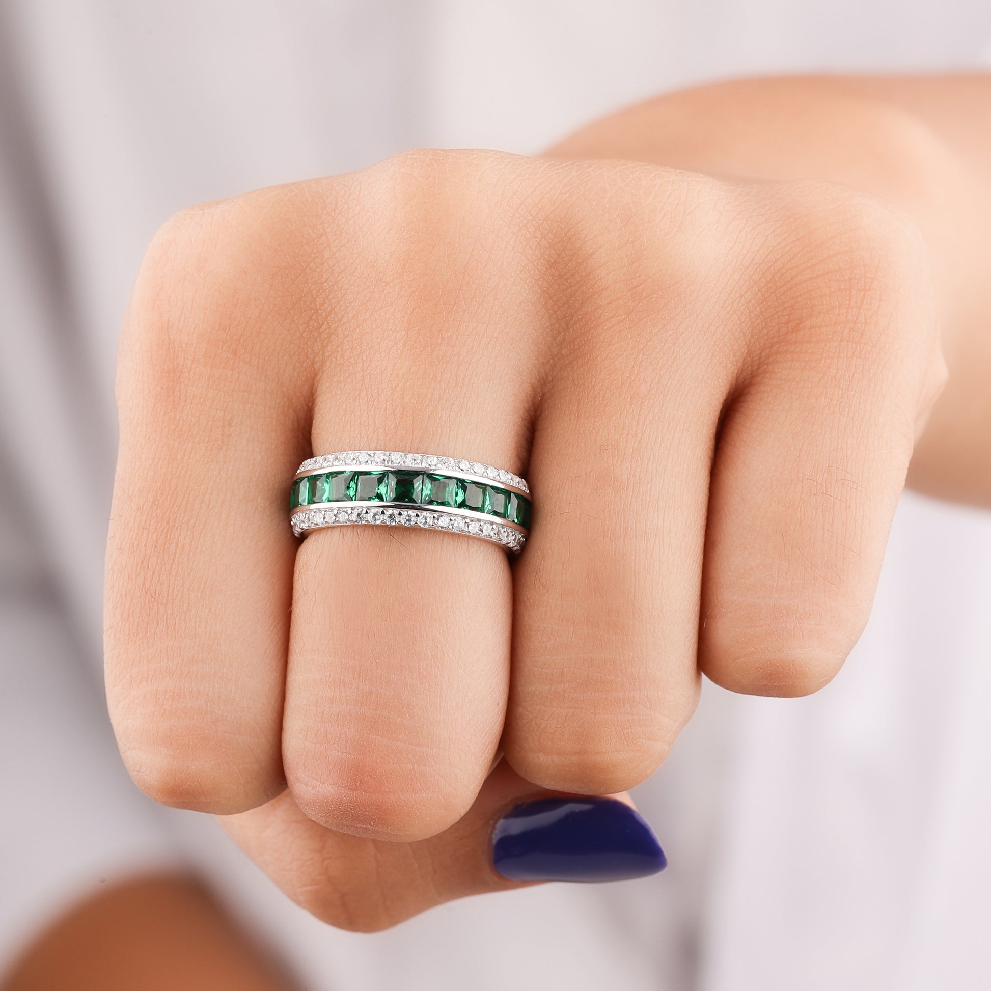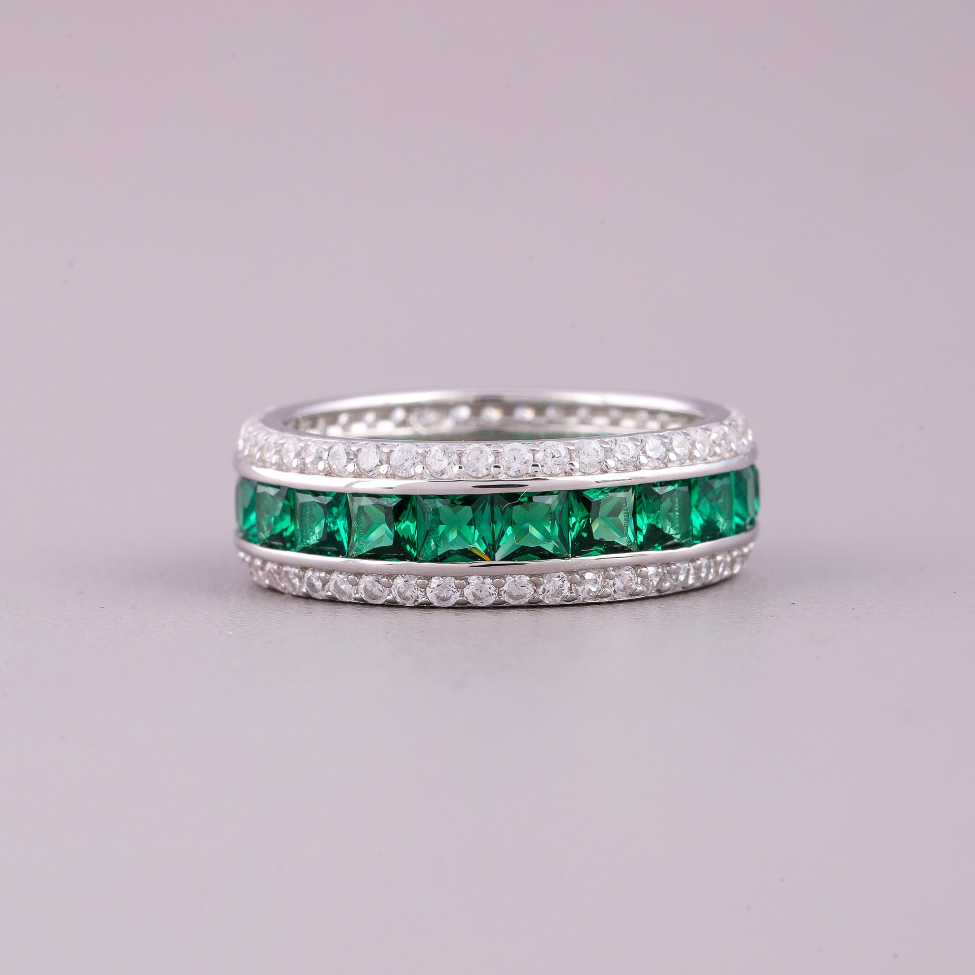This striking, wide eternity band showcases a rich and luxurious three-row design set in polished white metal. The central element is a continuous circle of intensely saturated natural green sapphires, meticulously cut into brilliant square or princess shapes. These emerald-like sapphires are securely channel or prong-set, creating a seamless line of vivid color. This bold green core is elegantly framed by two continuous borders of smaller, dazzling round-cut diamonds, which are pavé-set along the top and bottom edges. The combination of the deep green hue and the surrounding white sparkle creates a high-contrast, glamorous piece, offering a sophisticated and colorful statement perfect for any special occasion.