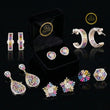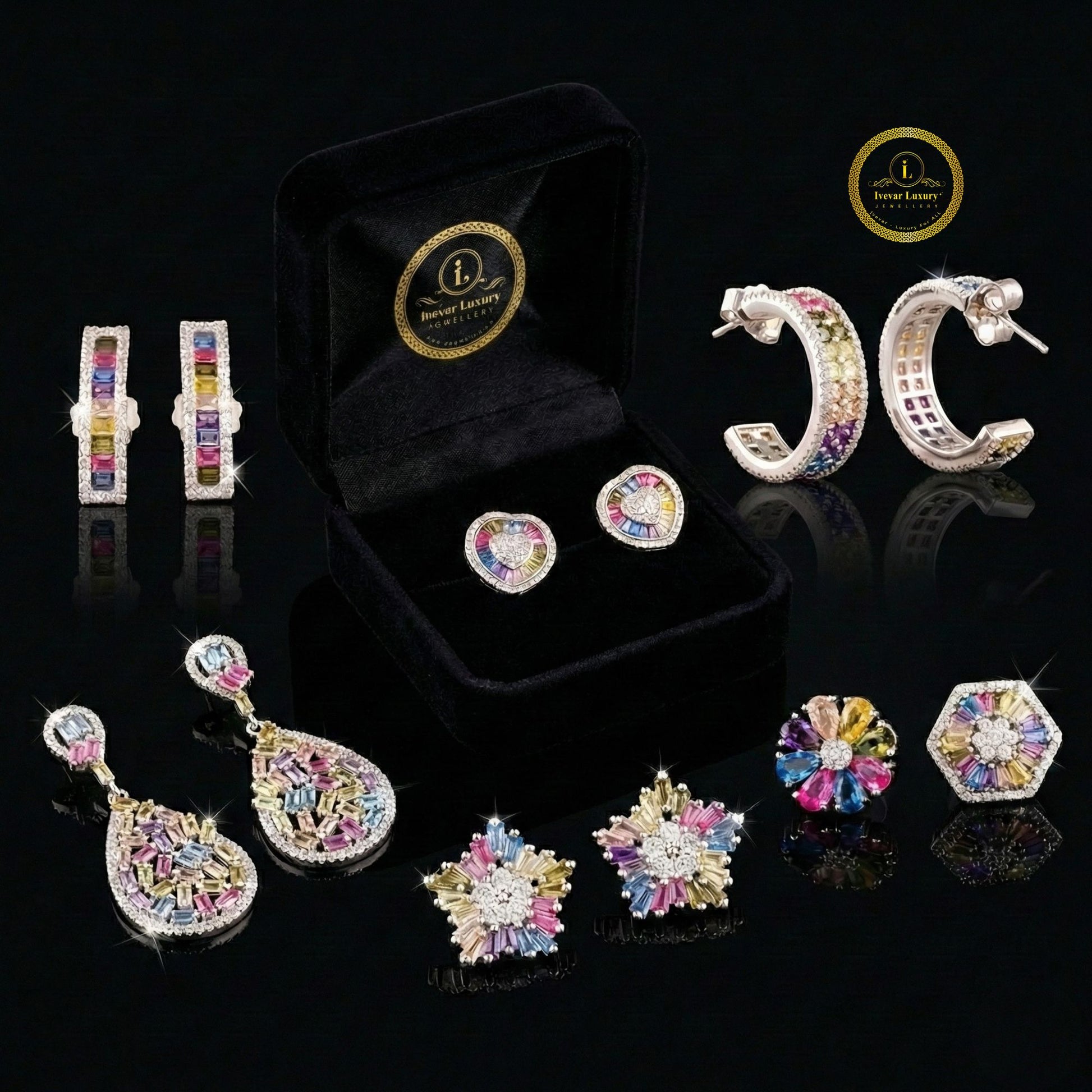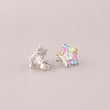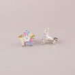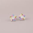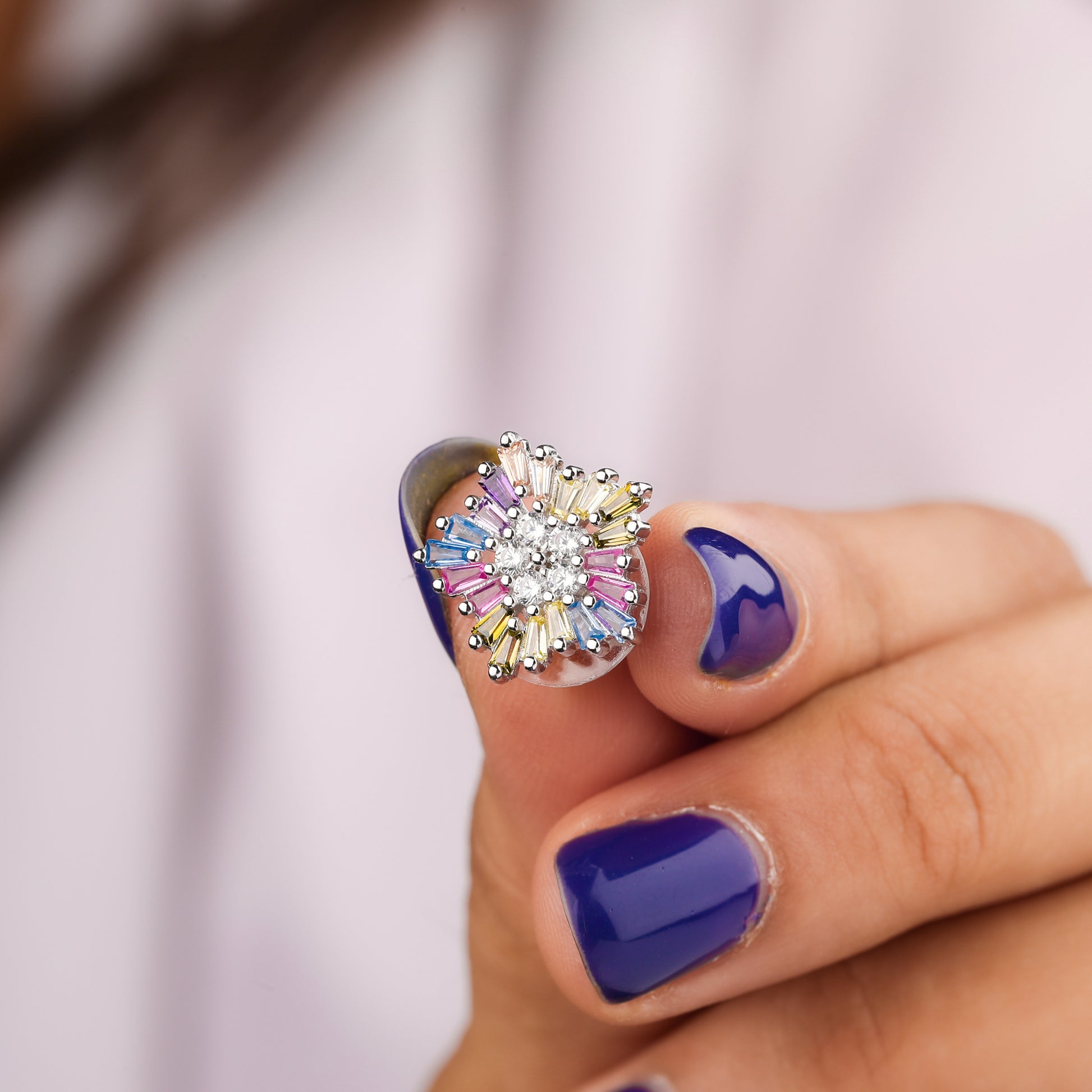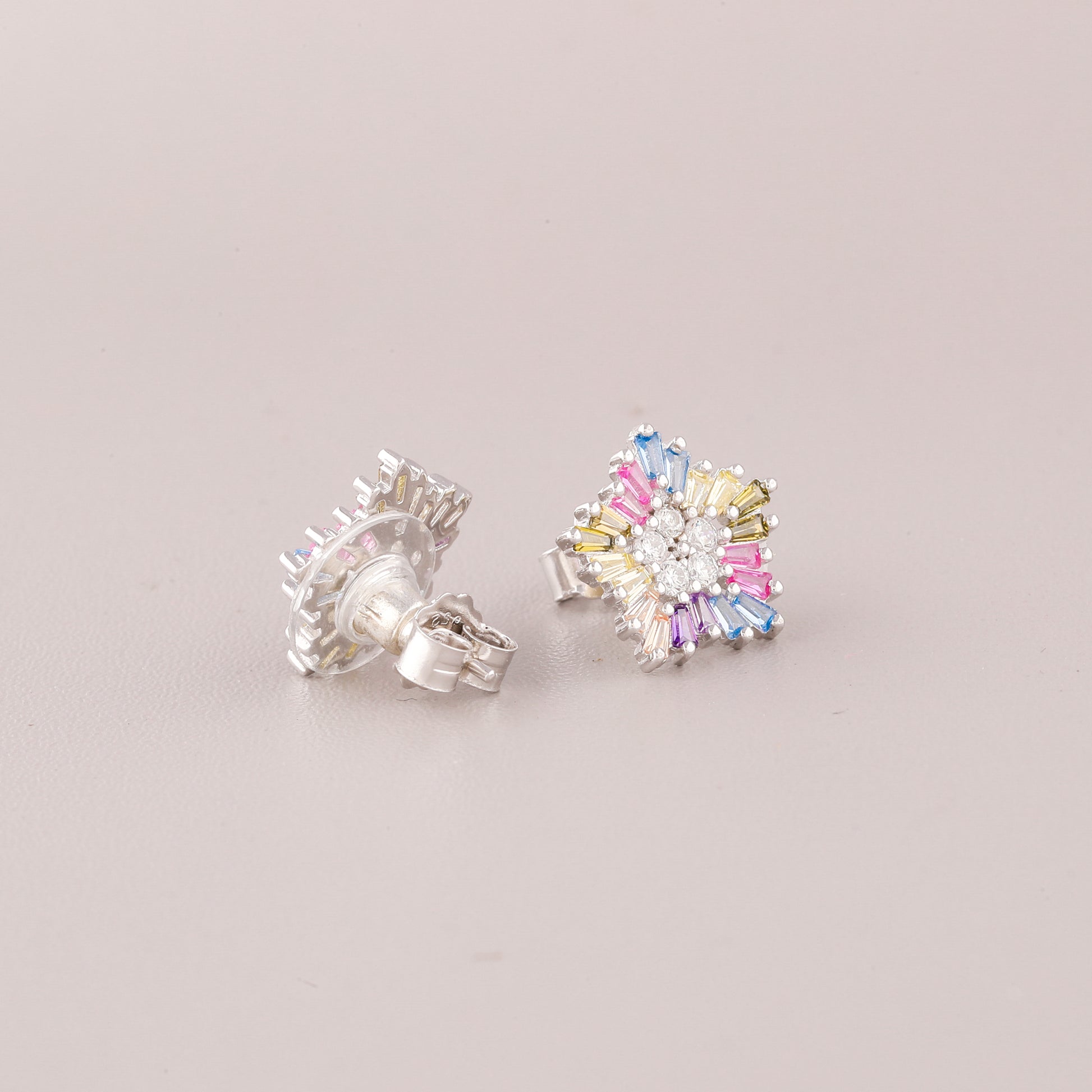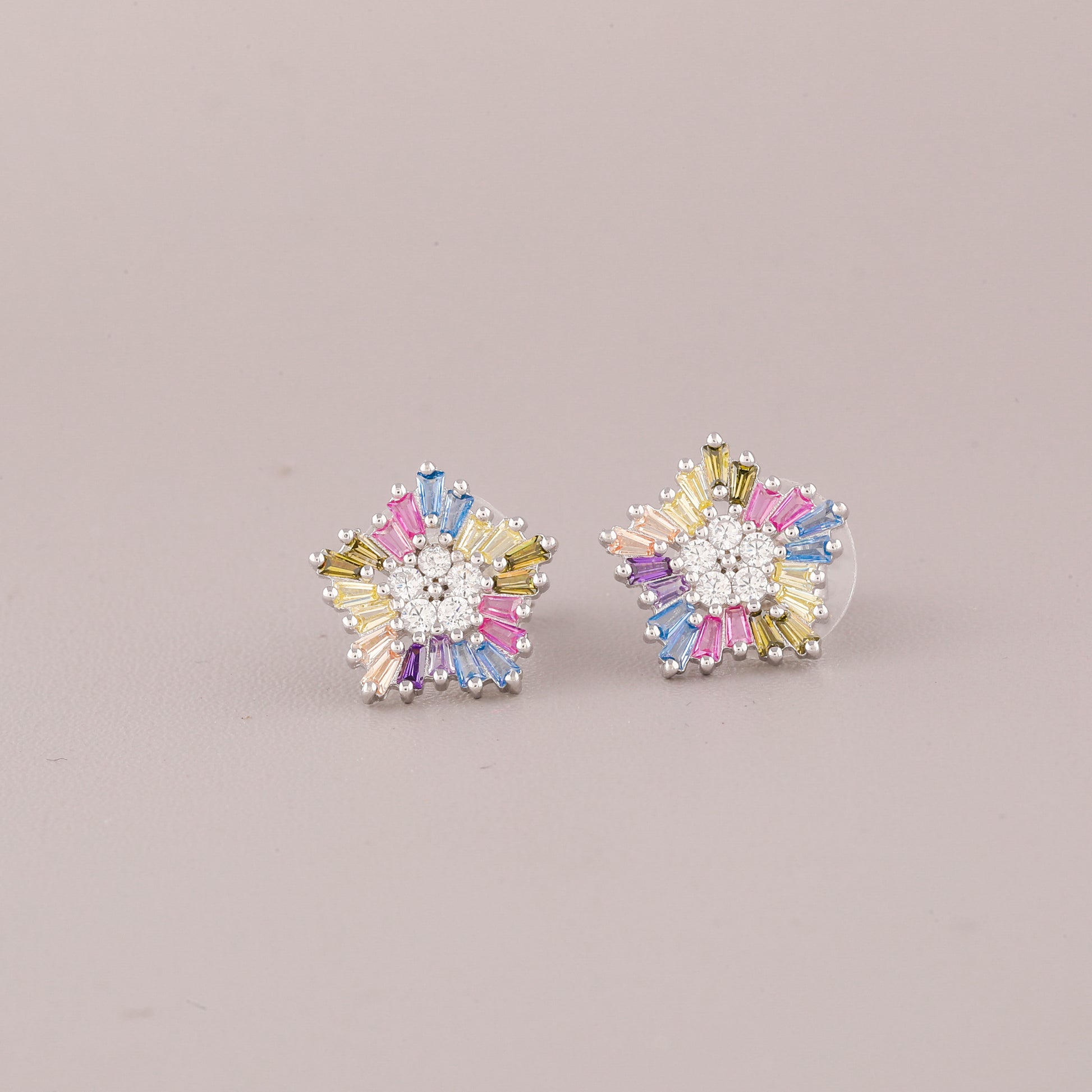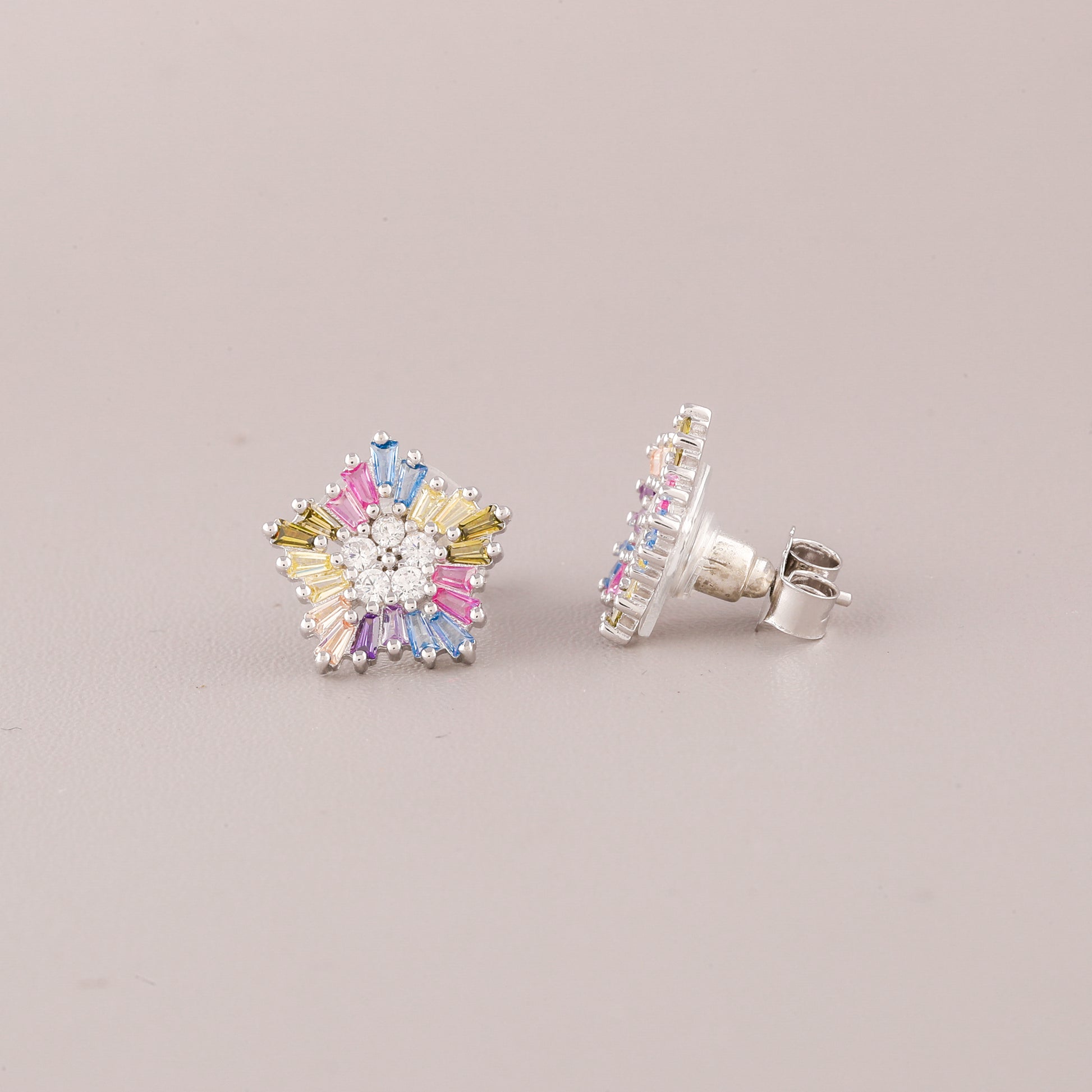 This image showcases a dazzling pair of Silver-Tone Rainbow Star Flower Stud Earrings. The earrings feature a distinctive five-pointed design, resembling both a star and a stylized flower. The center of each stud is adorned with a cluster of small, round, clear stones (likely diamonds or cubic zirconia). Forming the "petals" or "points" are baguette-cut stones in a vibrant, scattered "natural rainbow" color scheme, including pink, blue, yellow, and purple. Set in a cool, bright silver-tone metal, the radial arrangement of the colorful baguettes creates a dynamic, explosive look, making these studs a cheerful, eye-catching accessory perfect for a playful statement.