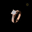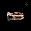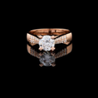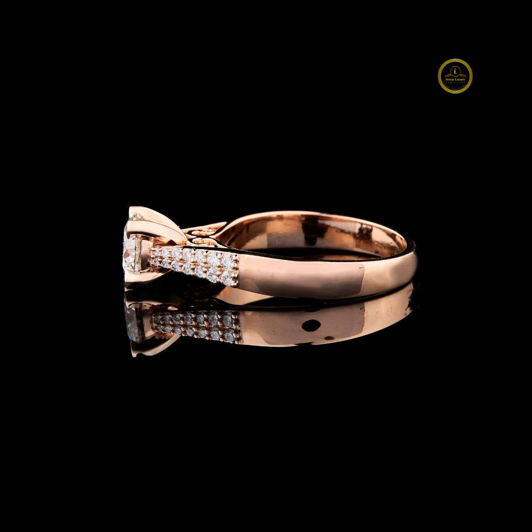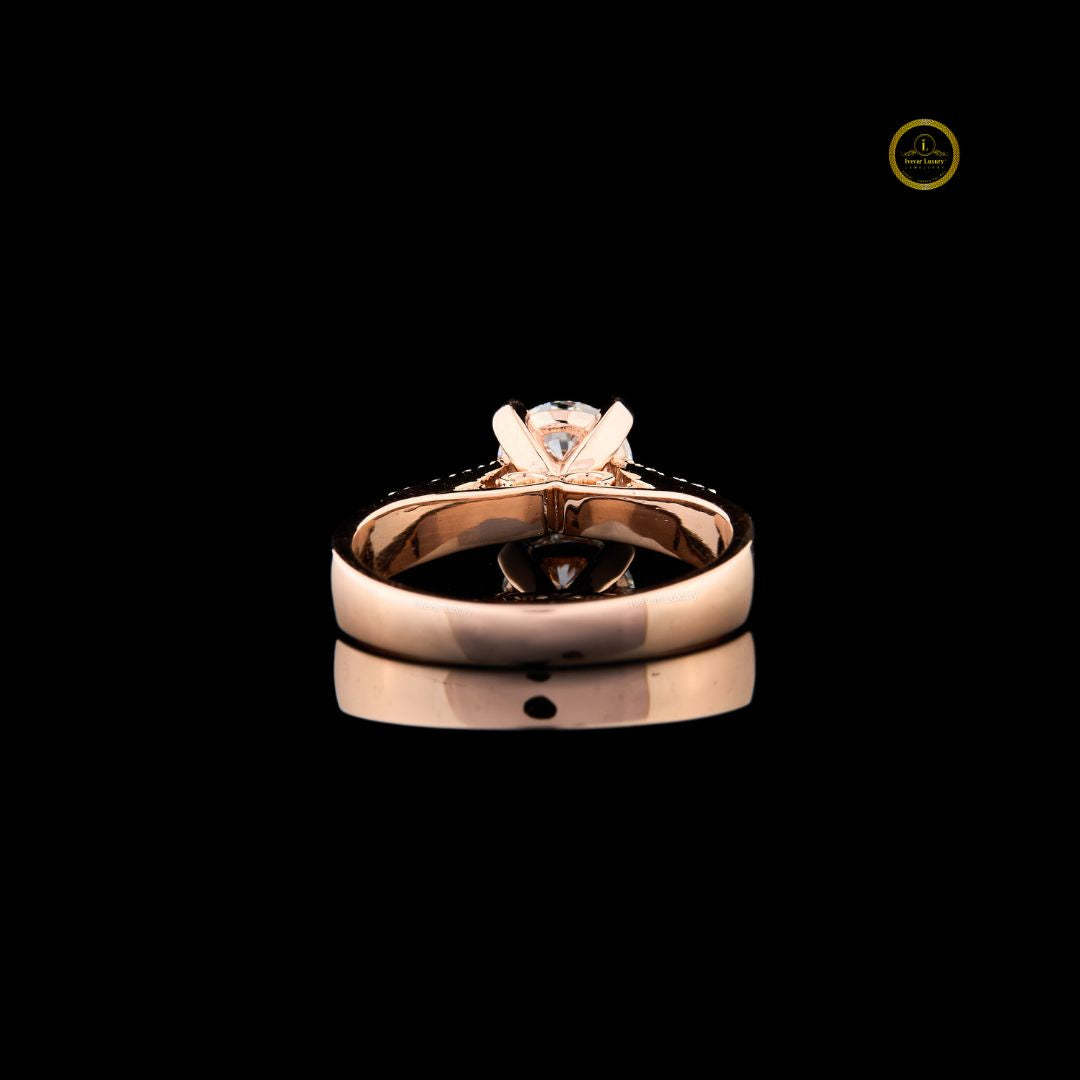This stunning engagement ring features a magnificent round-cut diamond held securely in a classic four-prong setting, allowing maximum light to enhance its brilliance. The band is crafted from warm rose gold, offering a contemporary and romantic aesthetic. The shoulders of the band are elegantly split and pave-set with smaller diamonds, creating a sparkling frame for the center stone. The highly polished band reflects the stone beautifully, completing a look that is both bold and sophisticated. It's an ideal piece for celebrating timeless love and commitment.