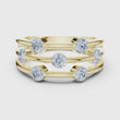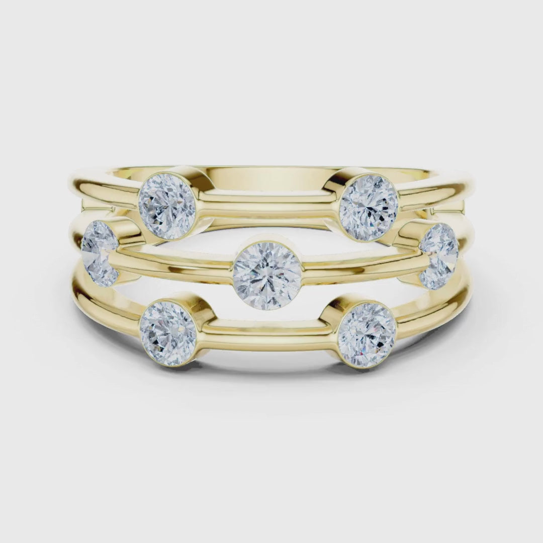 This stunning three-row gold ring features a modern, airy design accented by seven bezel-set round diamonds that seem to float effortlessly along each slender band. The layered structure creates the look of perfectly stacked rings while offering the comfort and unity of a single piece. Crafted in warm gold, the ring balances clean lines with brilliant sparkle, making it an elegant statement for everyday wear or a refined addition to any special occasion ensemble.