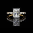 This stunning ring showcases a brilliant Radiant-cut diamond at its center, secured by four elegant prongs that highlight its sharp, radiant facets. The gold or silver band adds warmth and contrast, while a row of sparkling marquise and round diamonds on each side enhances the overall brilliance and sophistication. With its luxurious combination of modern geometry and timeless craftsmanship, this piece exudes elegance and makes a breathtaking statement from every angle.
