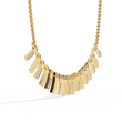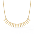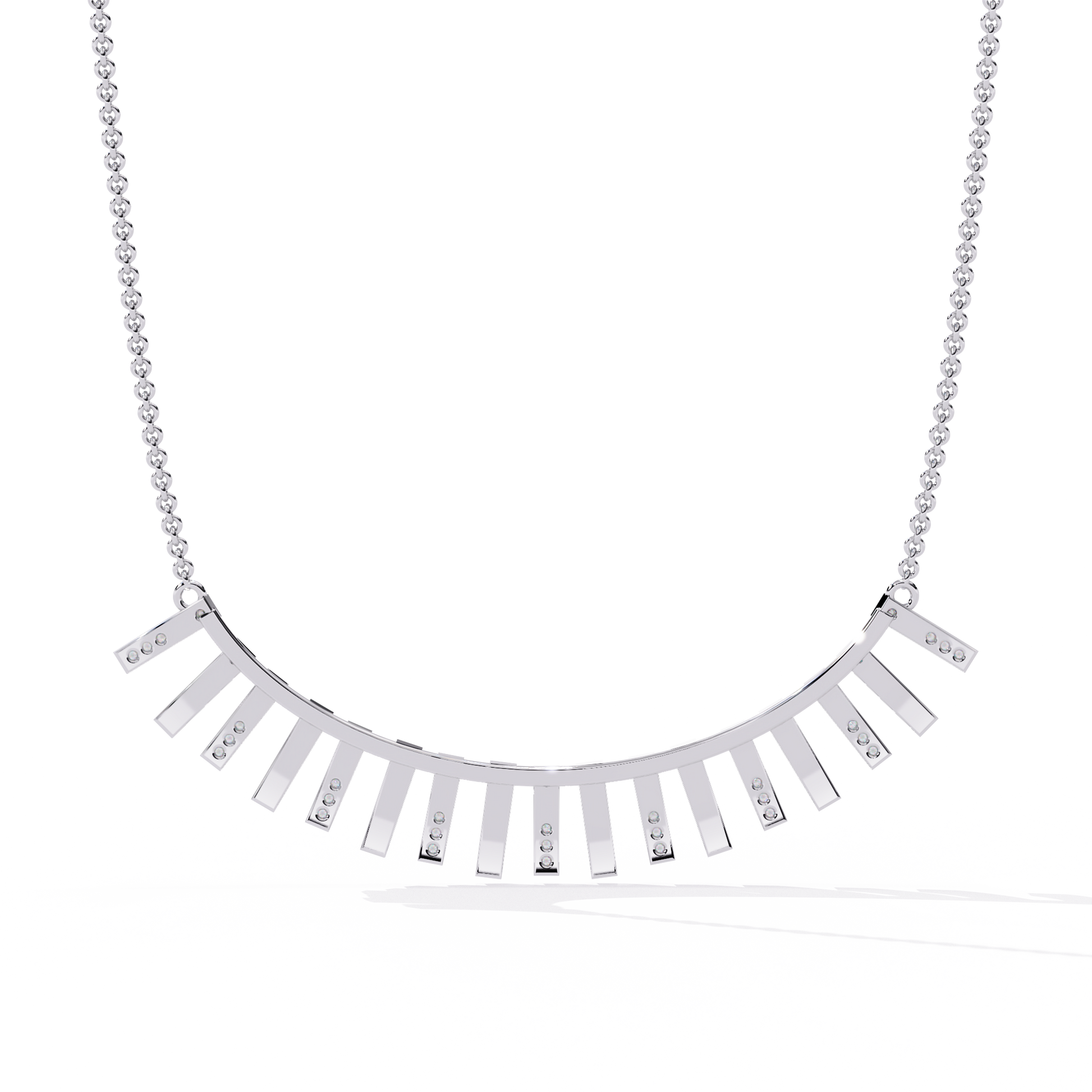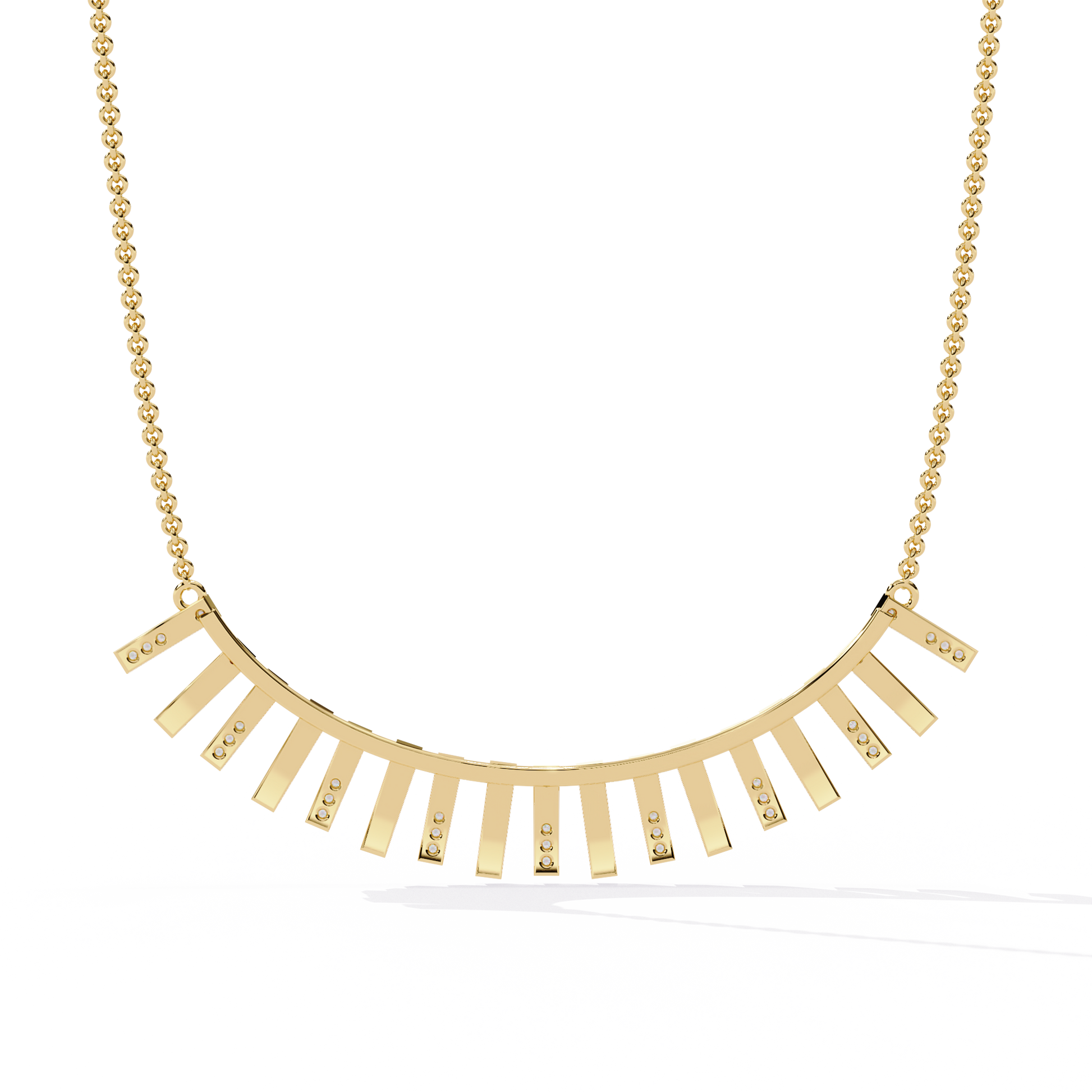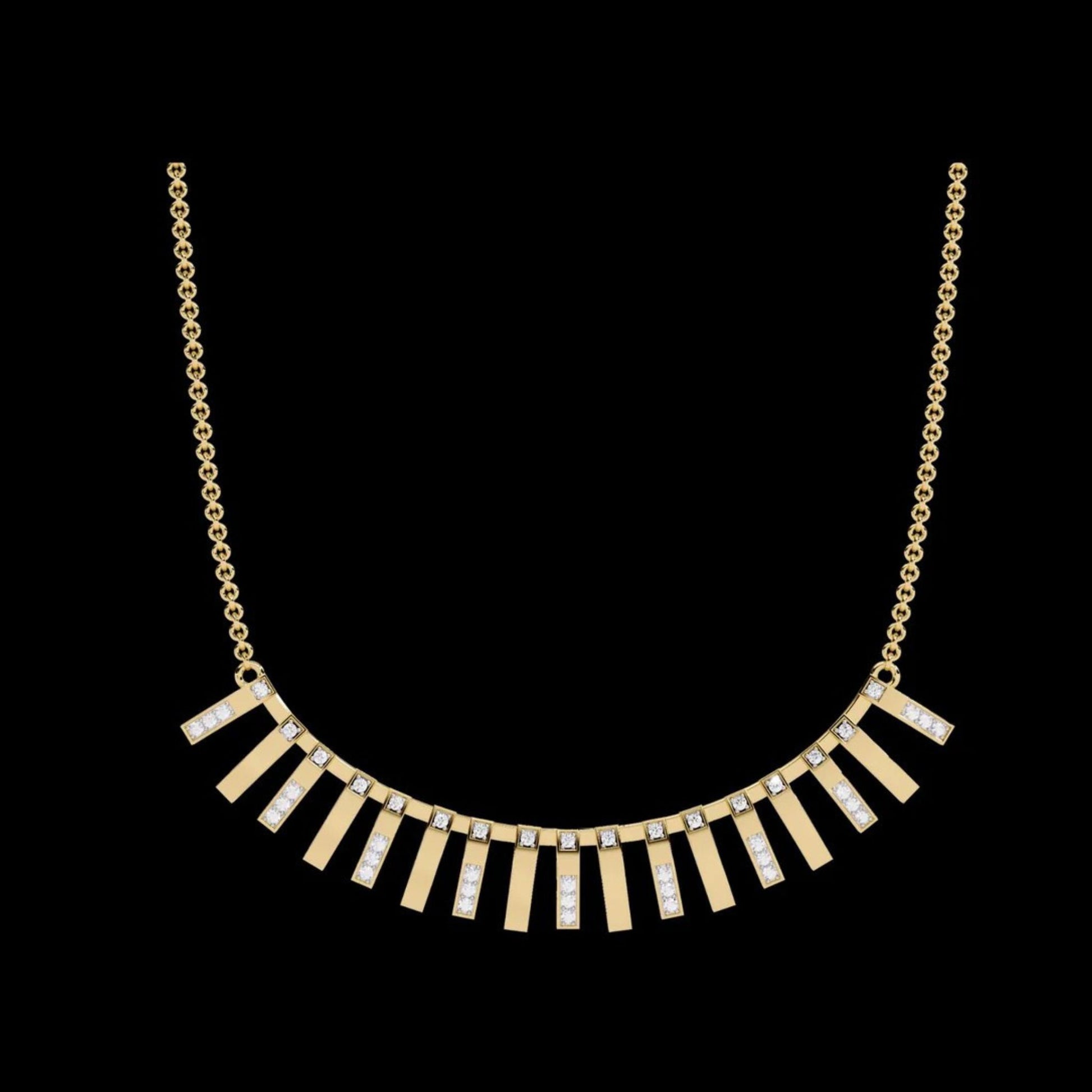 This striking necklace showcases a Modern Geometric Design with alternating gold bars and Round Cut Diamond-accented segments, creating a captivating play of light and symmetry. The precise arrangement of rectangular elements adds a bold, contemporary flair while maintaining an air of refined luxury. Suspended gracefully from a polished gold chain, this necklace exudes confidence and sophistication—perfect for making a statement at any elegant occasion by Ivevar.