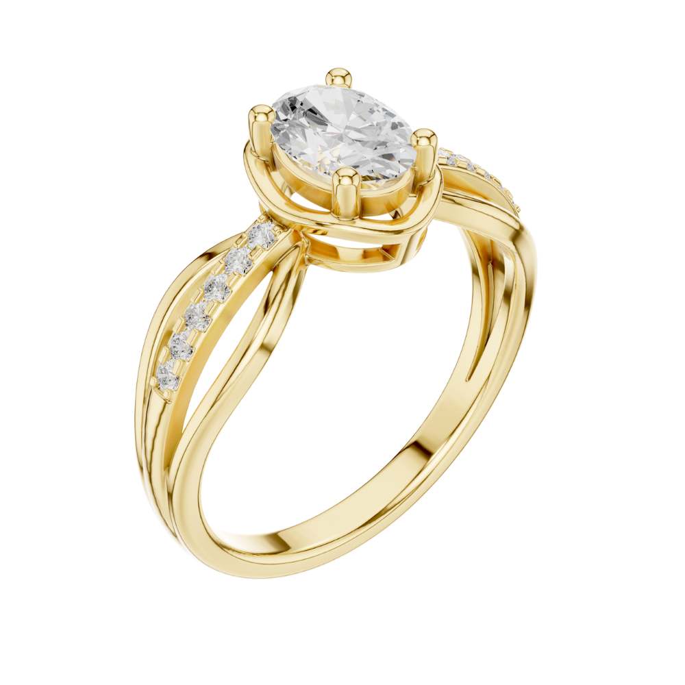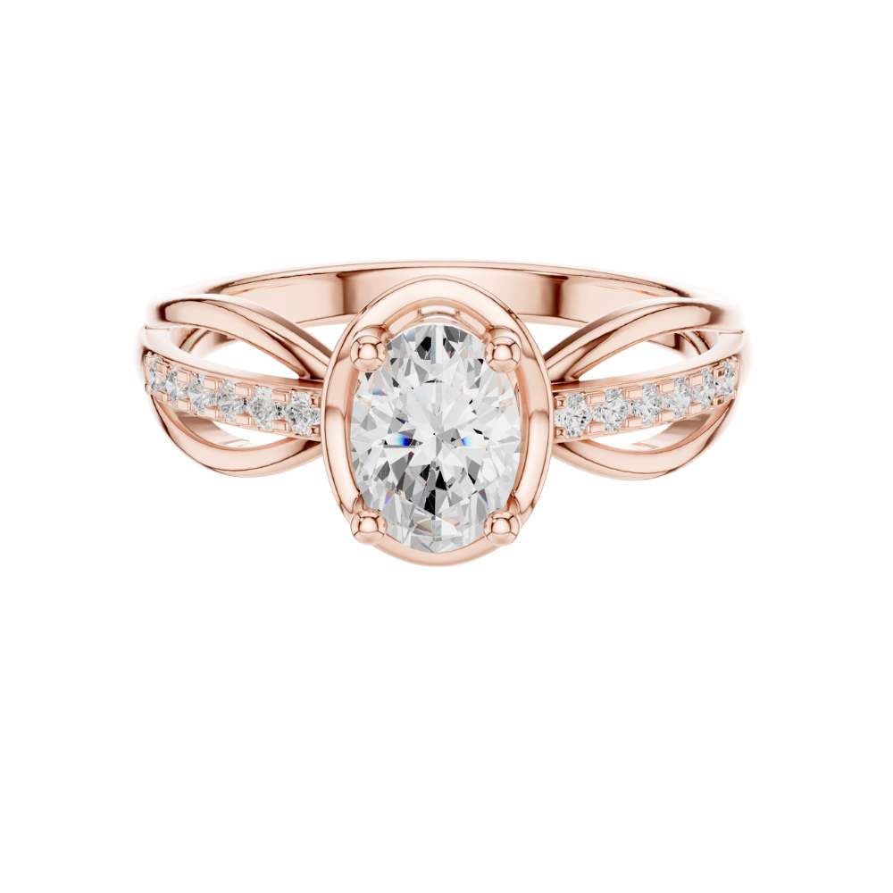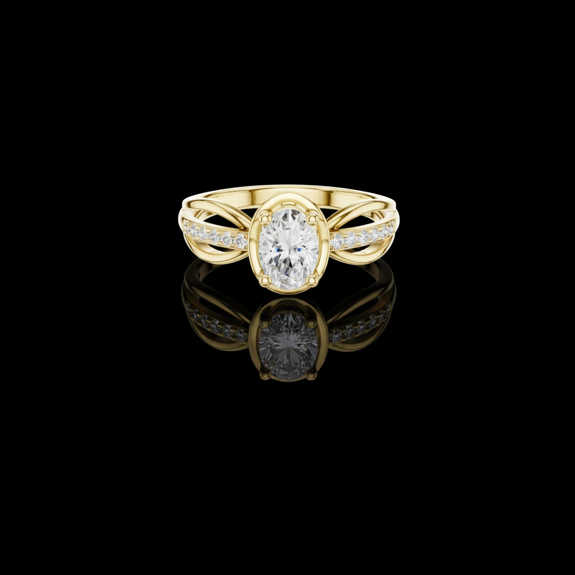 This elegant engagement ring features a brilliant oval-cut center stone set in warm gold, accented by a gracefully twisted band that blends modern sophistication with timeless charm. Pave-set diamonds line the split shank, adding extra sparkle that enhances the ring’s luminous centerpiece. The intertwining gold design creates a romantic, symbolic aesthetic—perfect for someone who appreciates both classic beauty and unique, artful details.