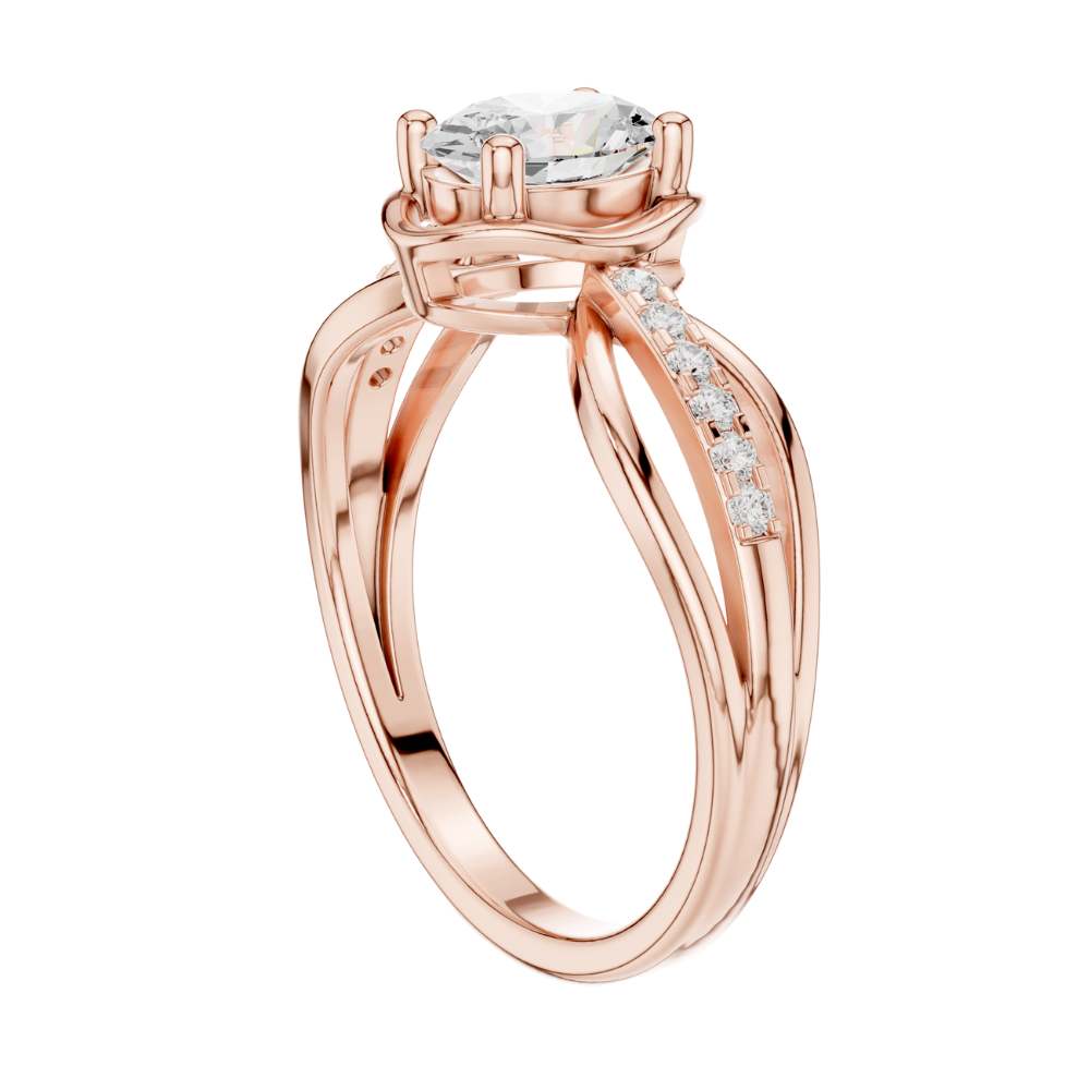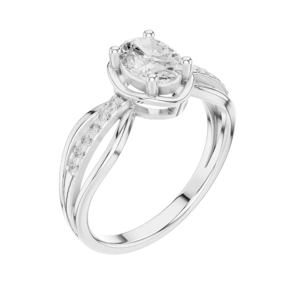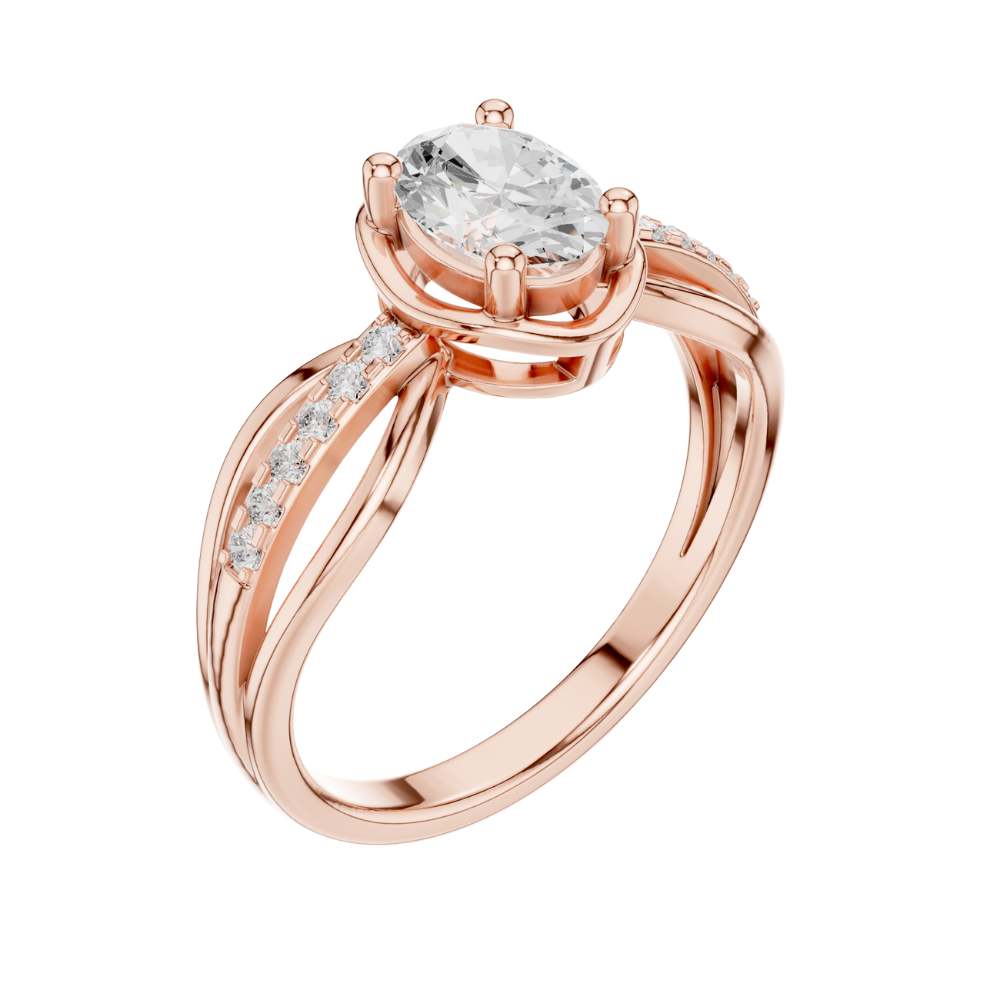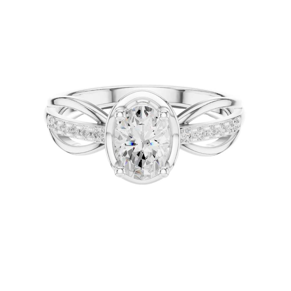This elegant engagement ring features a brilliant oval-cut center stone set in warm gold, accented by a gracefully twisted band that blends modern sophistication with timeless charm. Pave-set diamonds line the split shank, adding extra sparkle that enhances the ring’s luminous centerpiece. The intertwining gold design creates a romantic, symbolic aesthetic—perfect for someone who appreciates both classic beauty and unique, artful details.