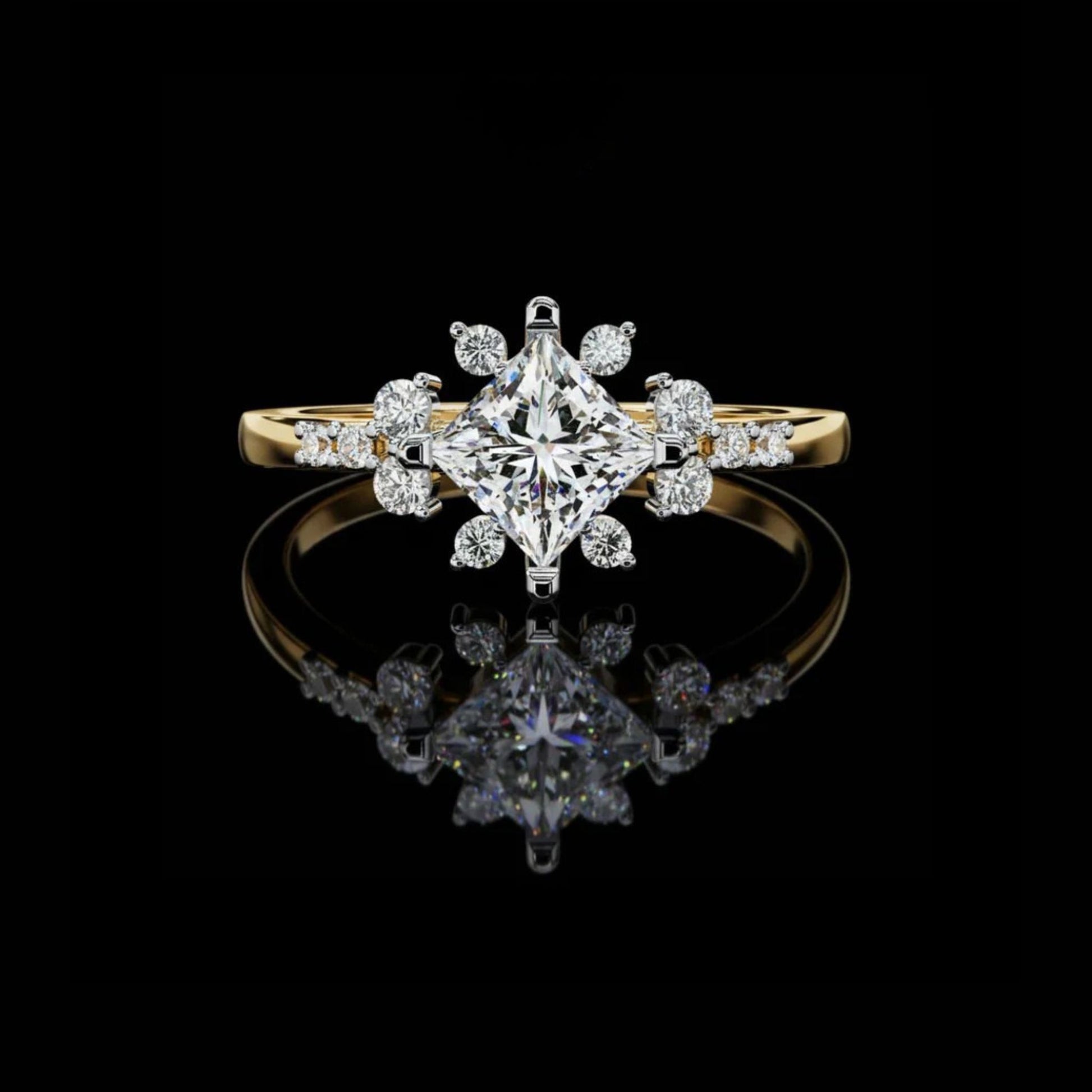 This breathtaking engagement ring from Ivevar Luxury features a radiant princess-cut center diamond framed by a beautifully arranged halo of floral inspired side stones, creating an elegant snowflake-like sparkle. The band is crafted in rich gold, offering a timeless contrast that enhances the brilliance of every facet. Designed for the woman who loves refined artistry, this piece embodies bold symmetry, excellent craftsmanship, and a sophisticated vintage charm—perfect for proposals, anniversaries, or unforgettable luxury gifting.