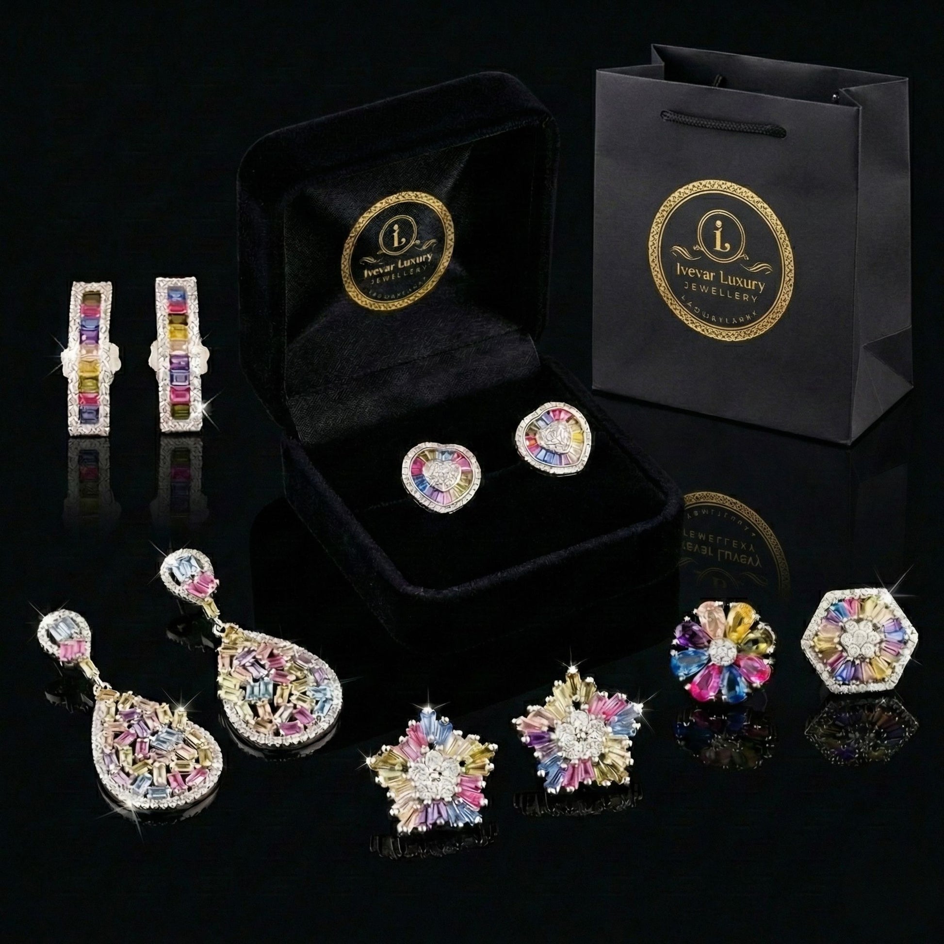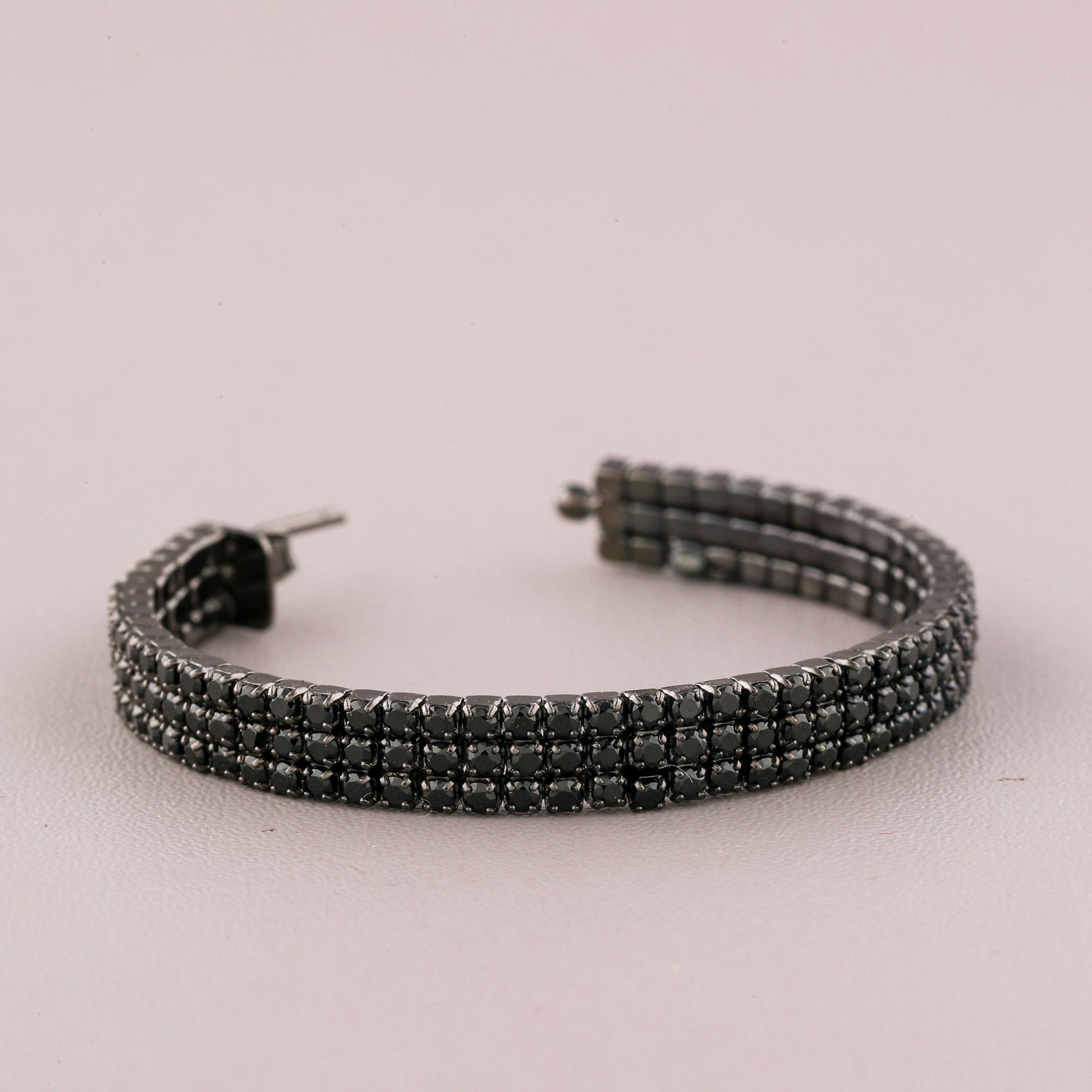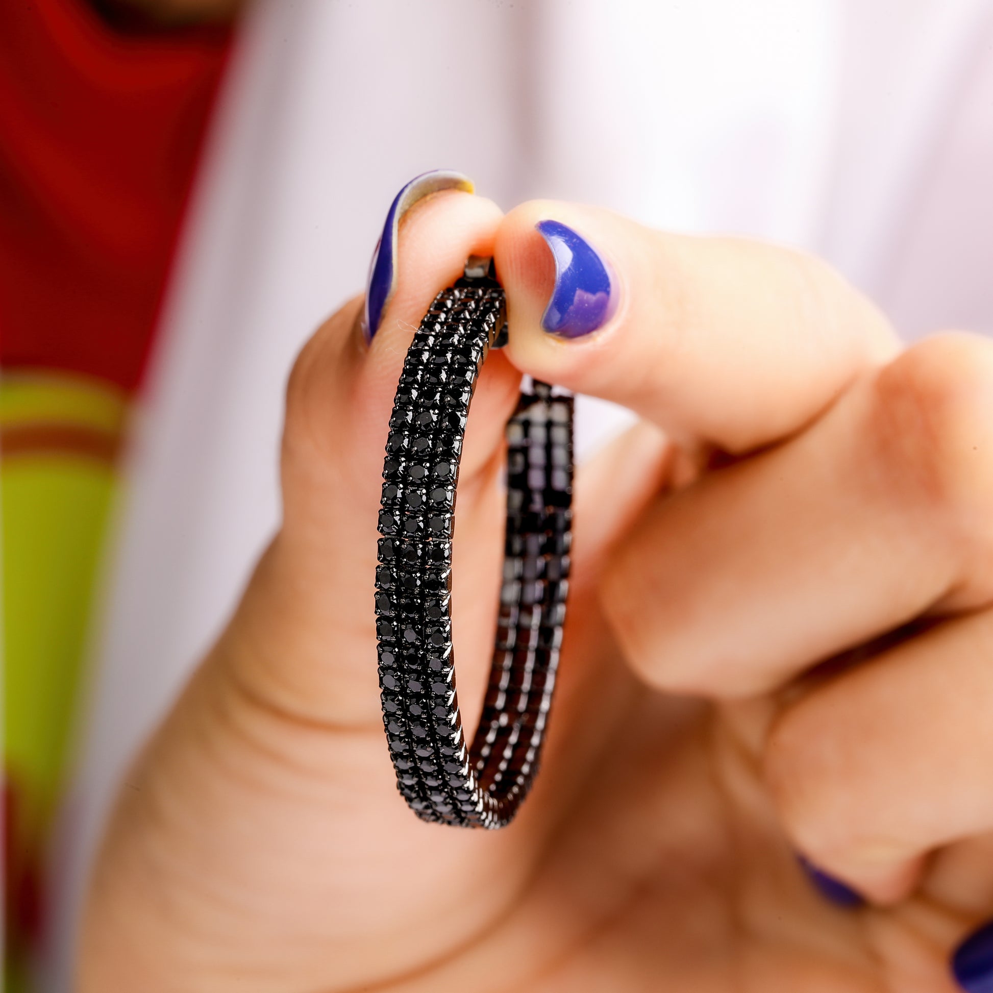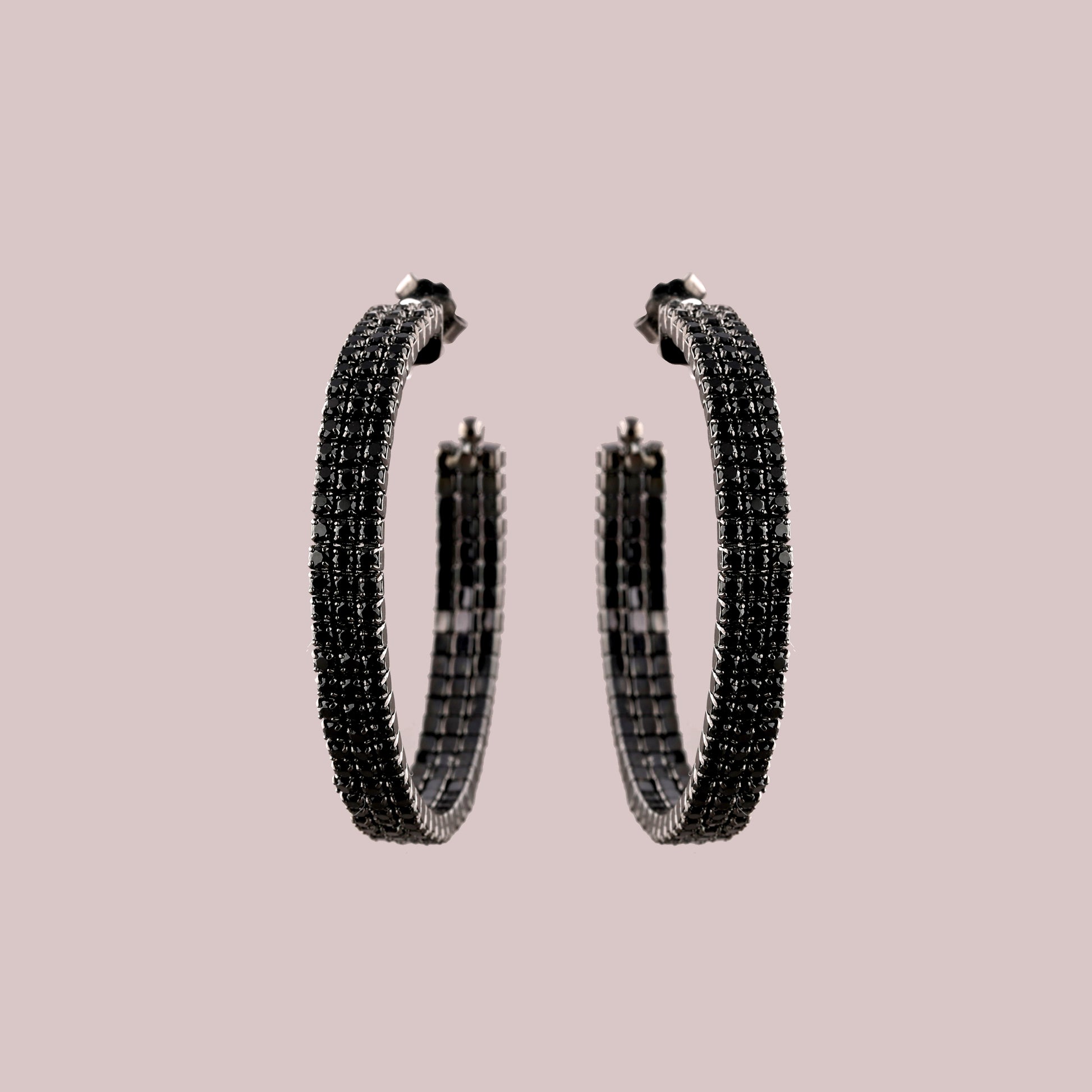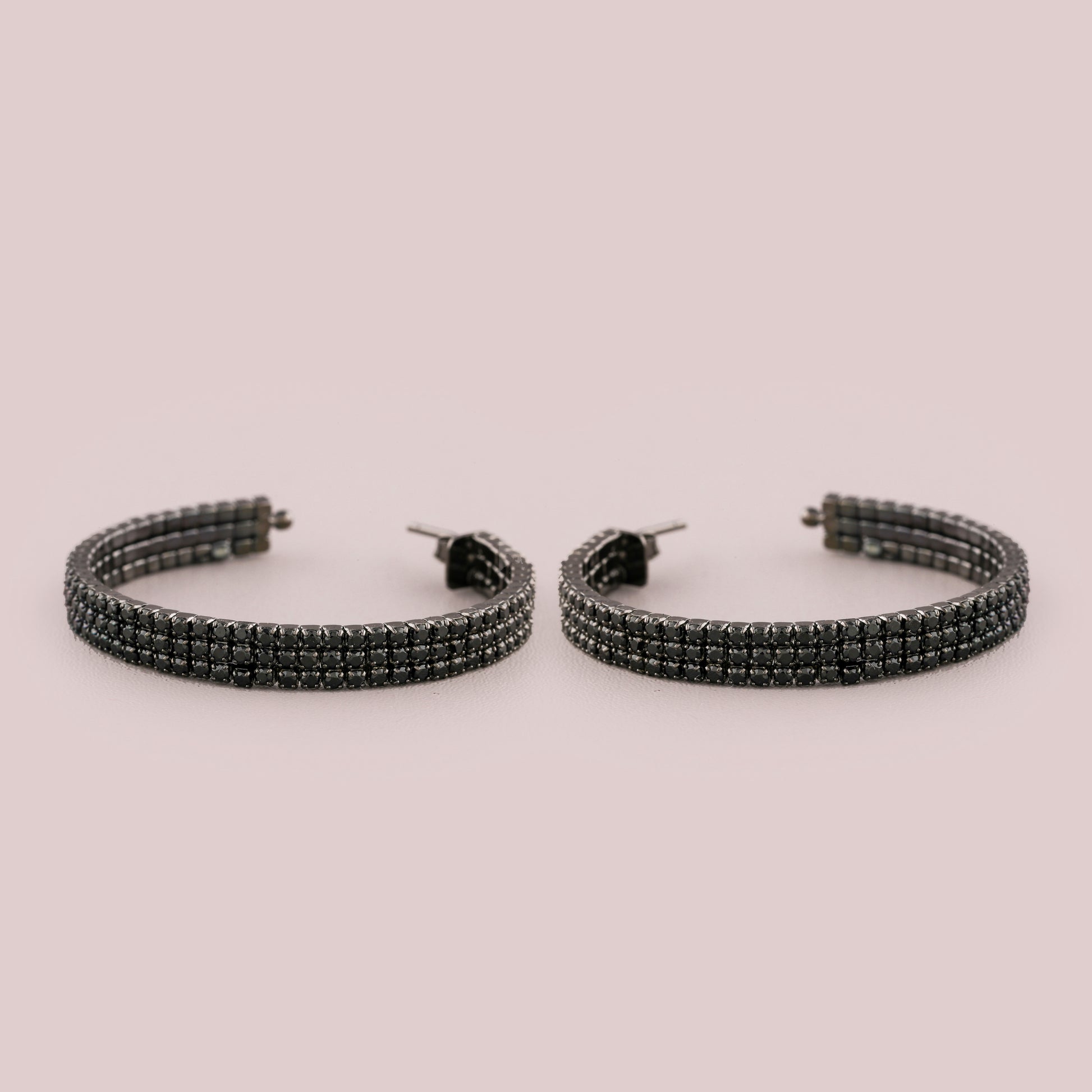 This image features a striking pair of Triple-Row Black Diamond Pave Hoop Earrings. Unlike the previous "rainbow" earrings, these hoops offer a dramatic, monochromatic look. The medium-to-large hoops are crafted in a dark metal setting (likely black rhodium-plated silver or gunmetal) and are completely covered in three parallel rows of small, pave-set black stones (likely black diamonds or black cubic zirconia). The continuous setting ensures maximum sparkle and texture, creating an intense, sophisticated depth. This bold design is perfect for adding a touch of edgy glamour and is a versatile statement piece for evening wear or a chic, dark aesthetic.
