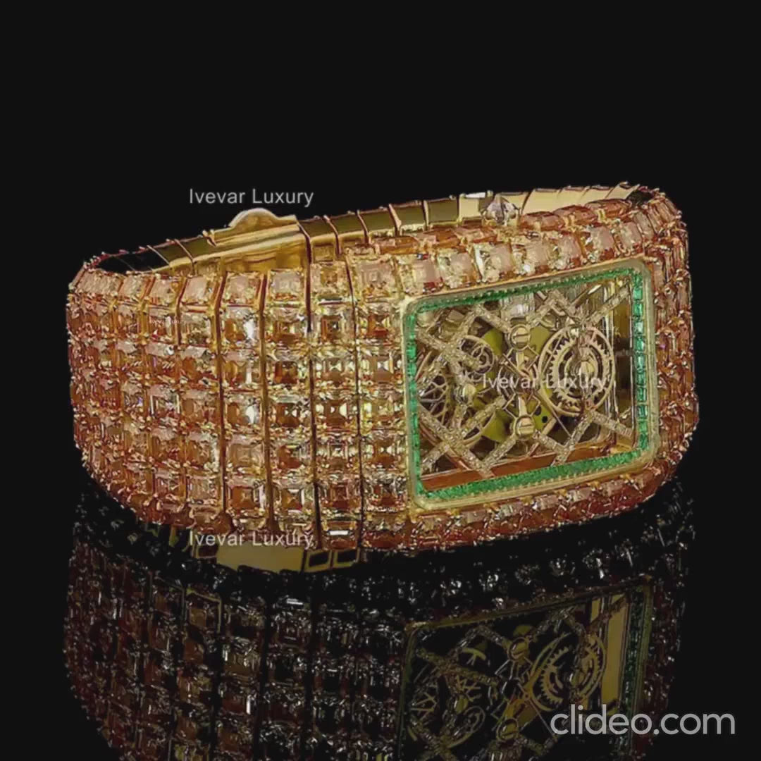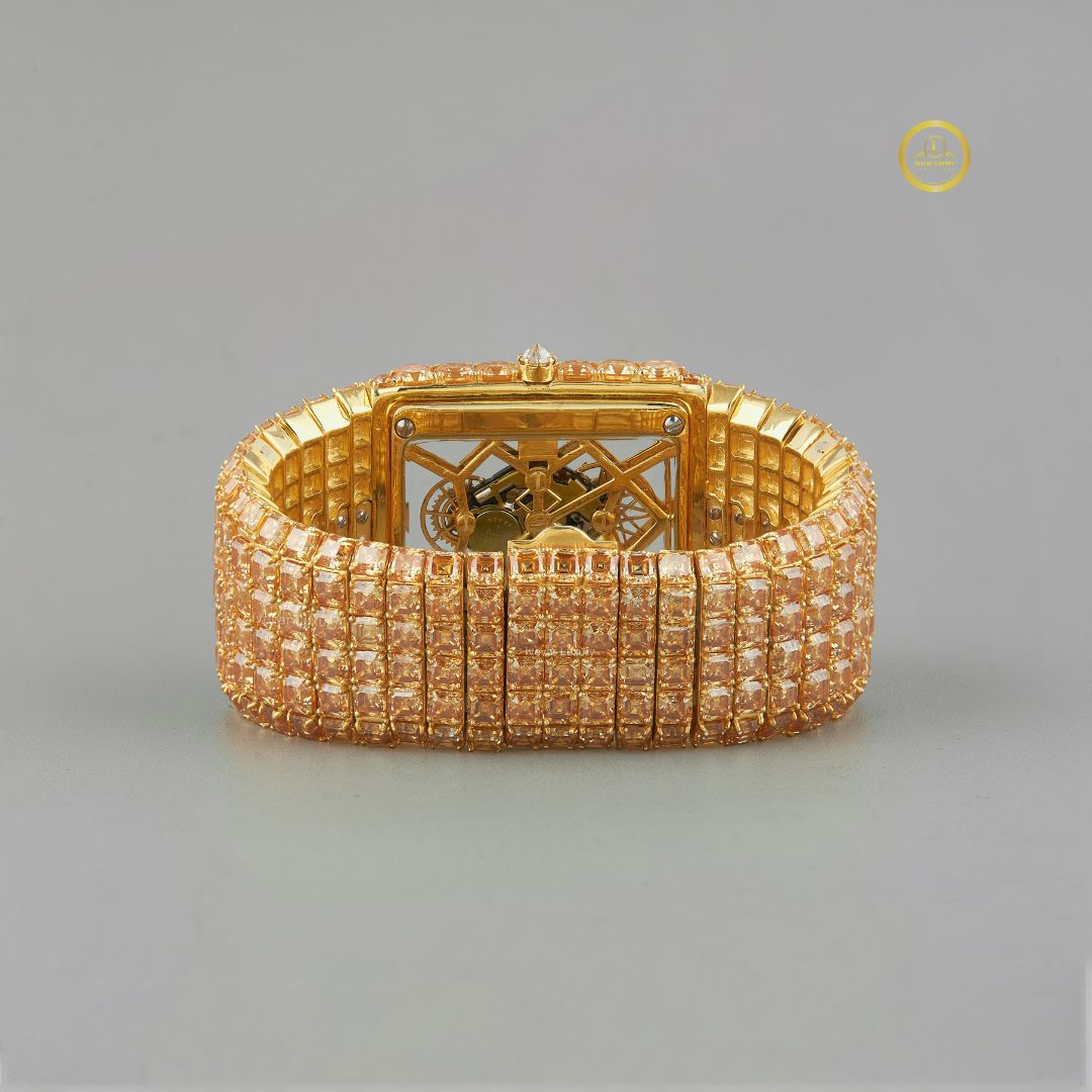 This exquisite gold lab-grown diamond watch embodies the perfect balance of artistry and grandeur. Every inch glistens with Asscher cut diamonds, meticulously arranged to reflect unmatched brilliance. The rectangular dial, adorned with fine baguette detailing, showcases a glimpse of its intricate mechanical movement, symbolizing both innovation and heritage. Crafted from sustainable, ethical materials, this piece radiates the spirit of modern luxury while honoring timeless craftsmanship. Bold yet refined, it is designed for those who wear elegance as an expression of power, prestige, and purpose.