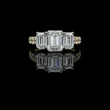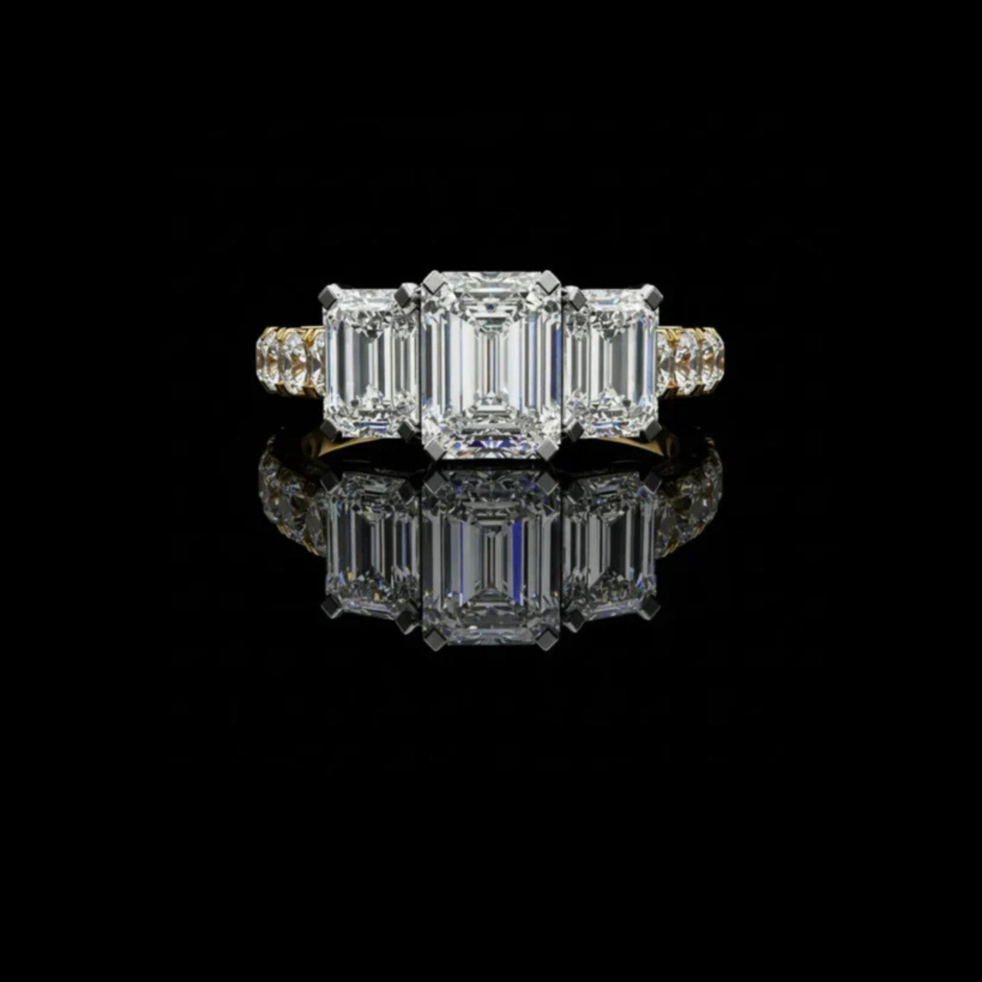 This exquisite three-stone ring showcases a row of emerald-cut diamonds, with the largest diamond at the center. The sparkling stones are set in a classic gold ring, with accent round  diamonds adding extra brilliance to the design. Perfect for those seeking a timeless, sophisticated piece of jewelry that combines elegance and luxury. This ring is a symbol of enduring love and sophistication, ideal for marking life's most cherished moments.