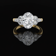 This stunning engagement ring features a brilliant oval-cut diamond as its captivating centerpiece, flanked by sparkling round side stones that enhance its radiance. The diamonds are set on a beautifully crafted band, adding a touch of timeless luxury and elegance. Designed for those who appreciate exceptional craftsmanship and refined beauty, this ring is a perfect symbol of enduring love and sophistication.