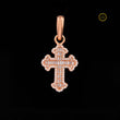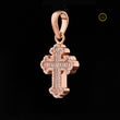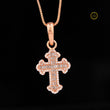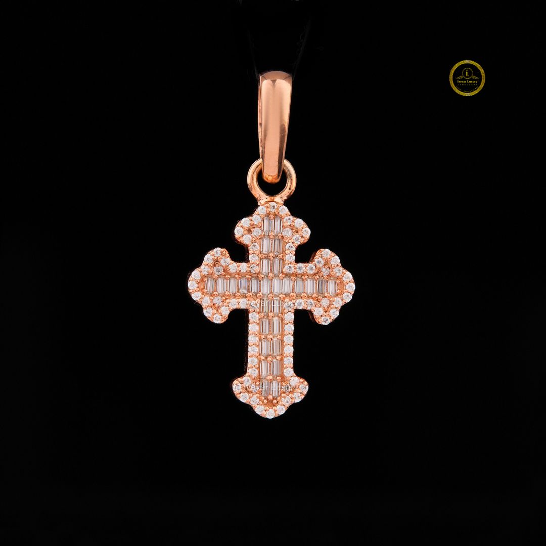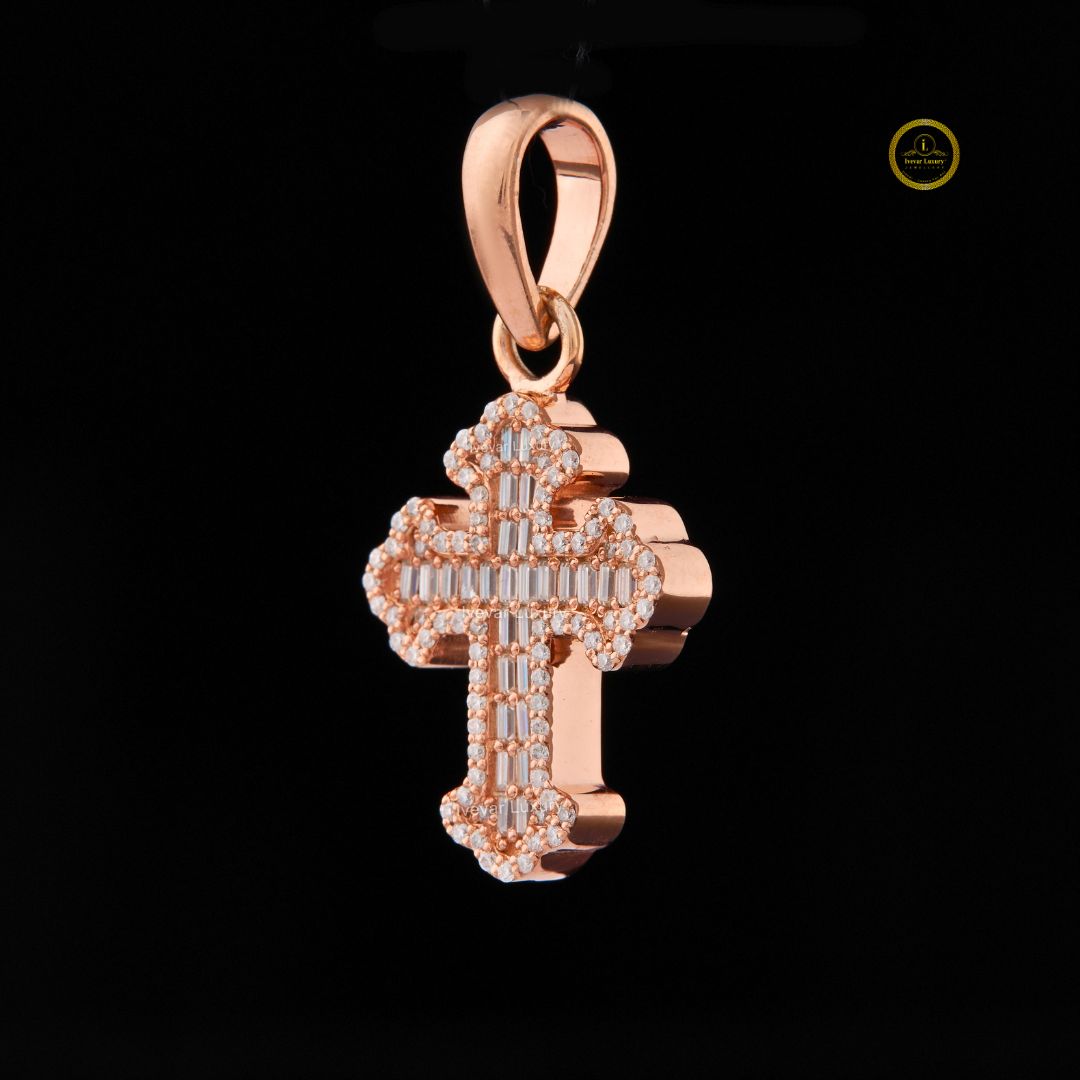 This exquisite custom pendant is a rose gold-toned cross design, featuring a striking combination of gemstones. The body of the cross is set with baguette-cut moissanite stones arranged in straight rows, creating a bold, continuous sparkle.