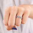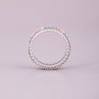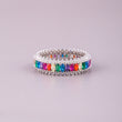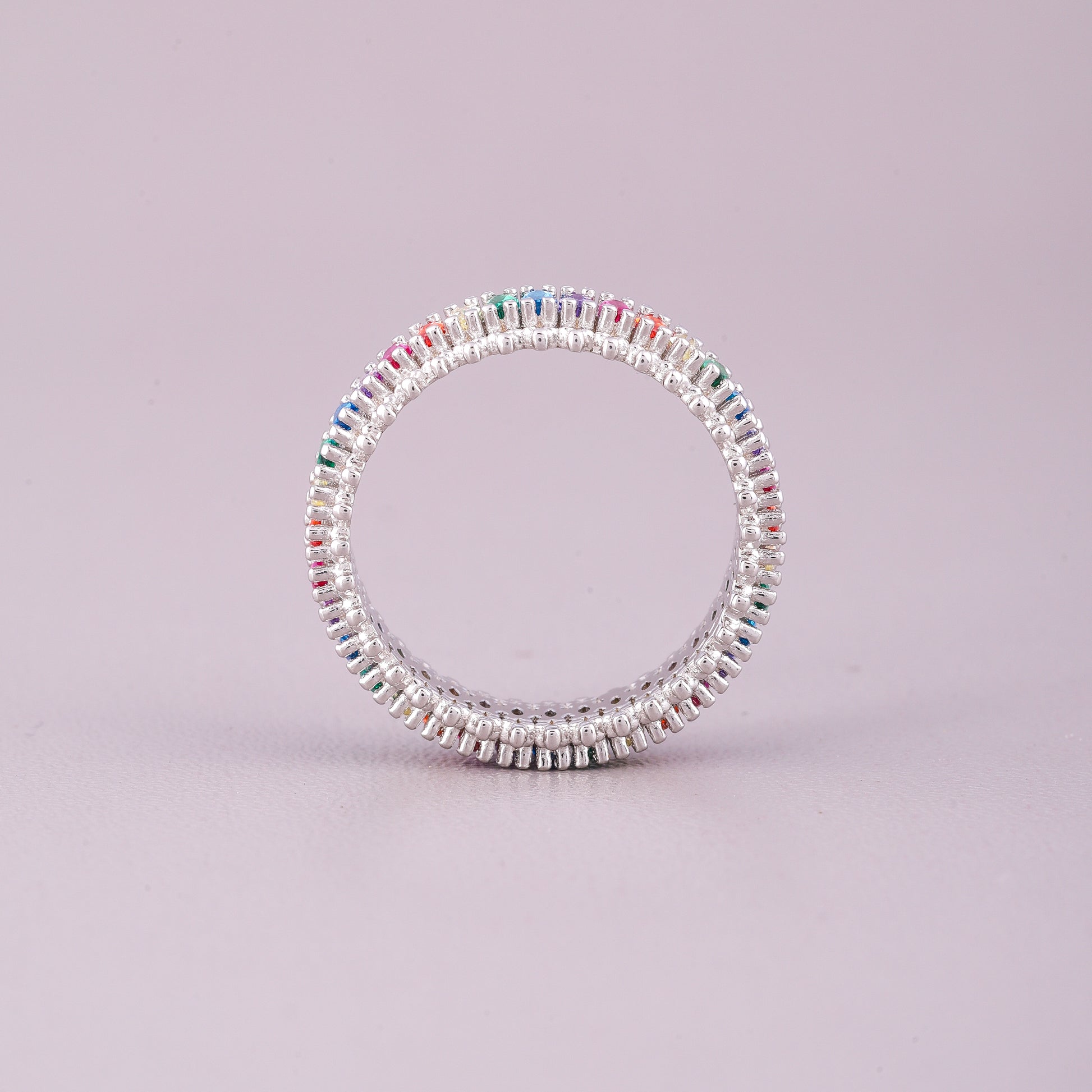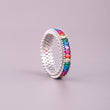 This striking ring features natural, multi-colored sapphires cut into geometric marquise, creating a vibrant "rainbow" effect. The sapphires, which may include pink, yellow, orange, and blue hues, are often set side-by-side and contrasted beautifully by surrounding or accenting natural diamonds. The white metal setting (likely white gold or platinum) ensures the colorful stones are the focal point. This is a bold, modern, and eye-catching eternity or half-eternity band, perfect for adding a vivid splash of color to any collection.