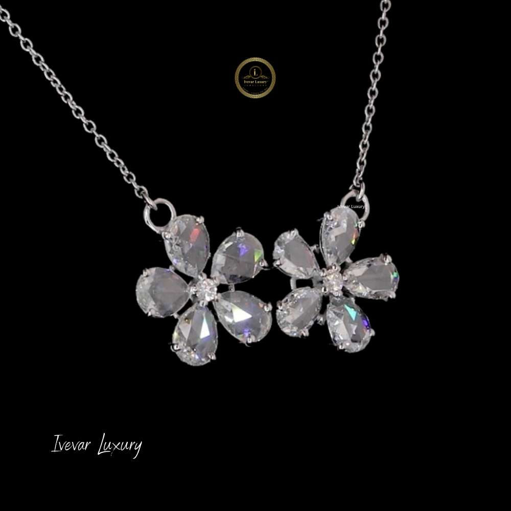This luxurious 14k white gold necklace features an antique-inspired design with two interconnected, diamond-encrusted floral pendants. The larger and smaller blossoms are intricately crafted using rose-cut natural diamonds for the petals, which give off a soft, romantic shimmer unlike the intense sparkle of modern brilliant cuts. These main stones are beautifully framed by a pavé halo of smaller brilliant-cut diamonds, maximizing the overall glow. Suspended from a delicate white gold chain, this necklace offers a refined blend of vintage charm and contemporary elegance. The double floral motif symbolizes connection and growth, making it a meaningful and exquisite statement piece.