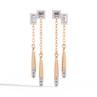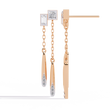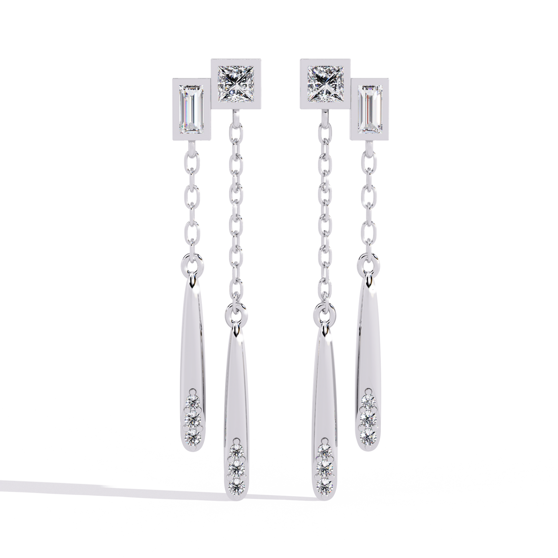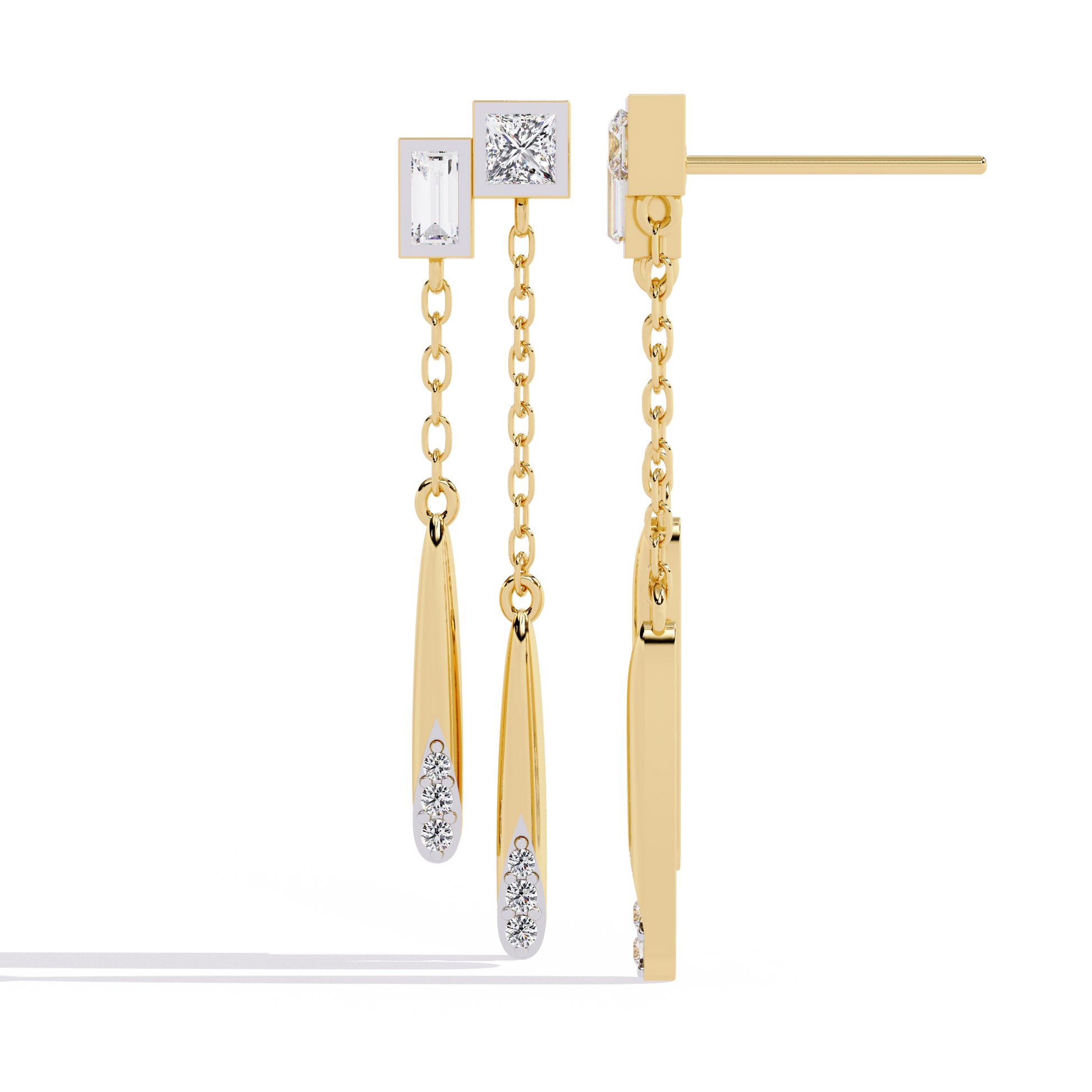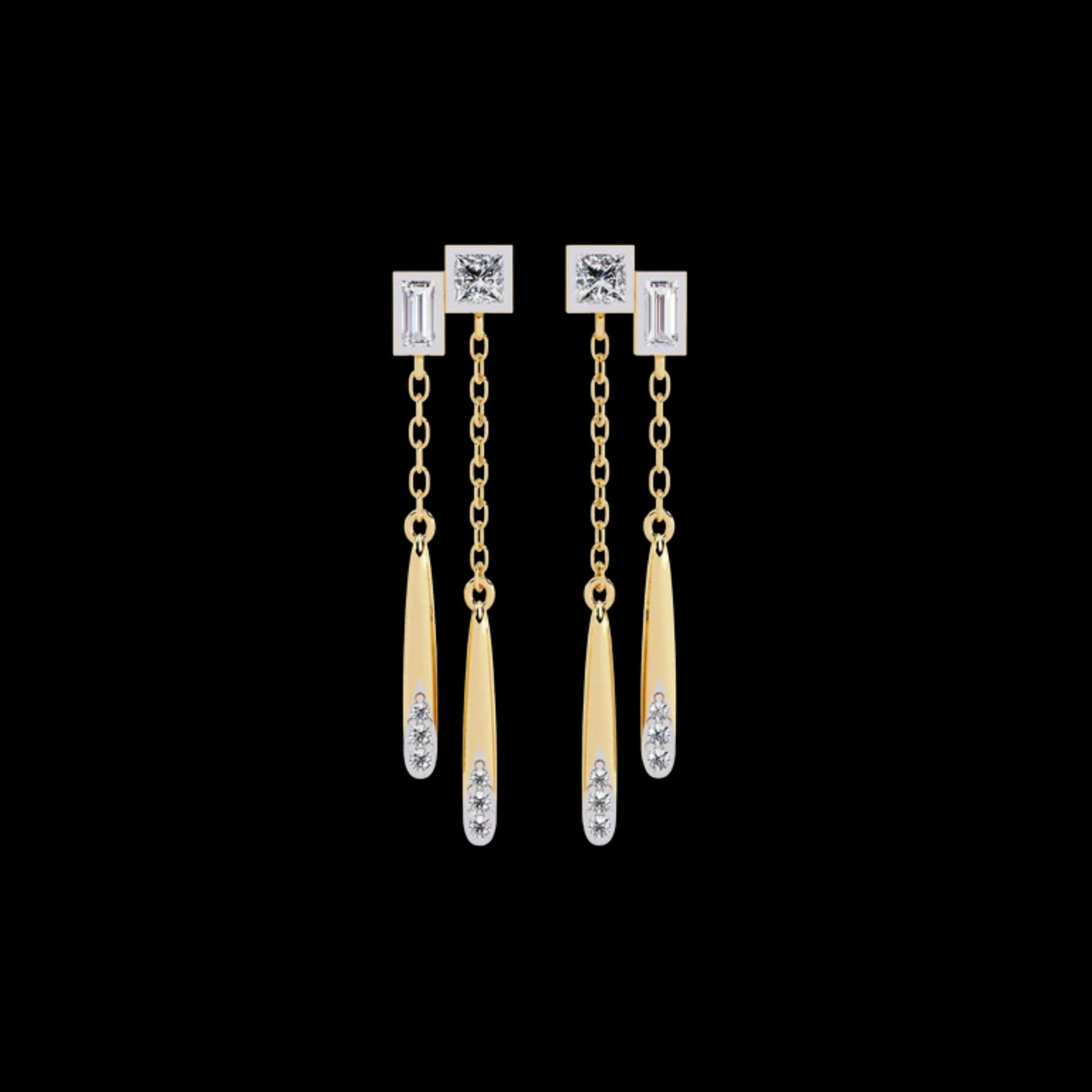 These Princess & Baguette Diamond Drop Chain Earrings by Ivevar Luxury Jewels capture modern sophistication with a touch of artistic movement. Crafted in solid gold, each earring features a striking combination of princess-cut ,baguette-cut and round-cut diamonds, connected by delicate chains that end in sleek tapered gold drops accented with round brilliant diamonds. The mix of geometric cuts and fluid design creates a statement piece that is both bold and elegant. Perfect for evening glamour or modern-day luxury, these earrings redefine refined artistry with an innovative silhouette.