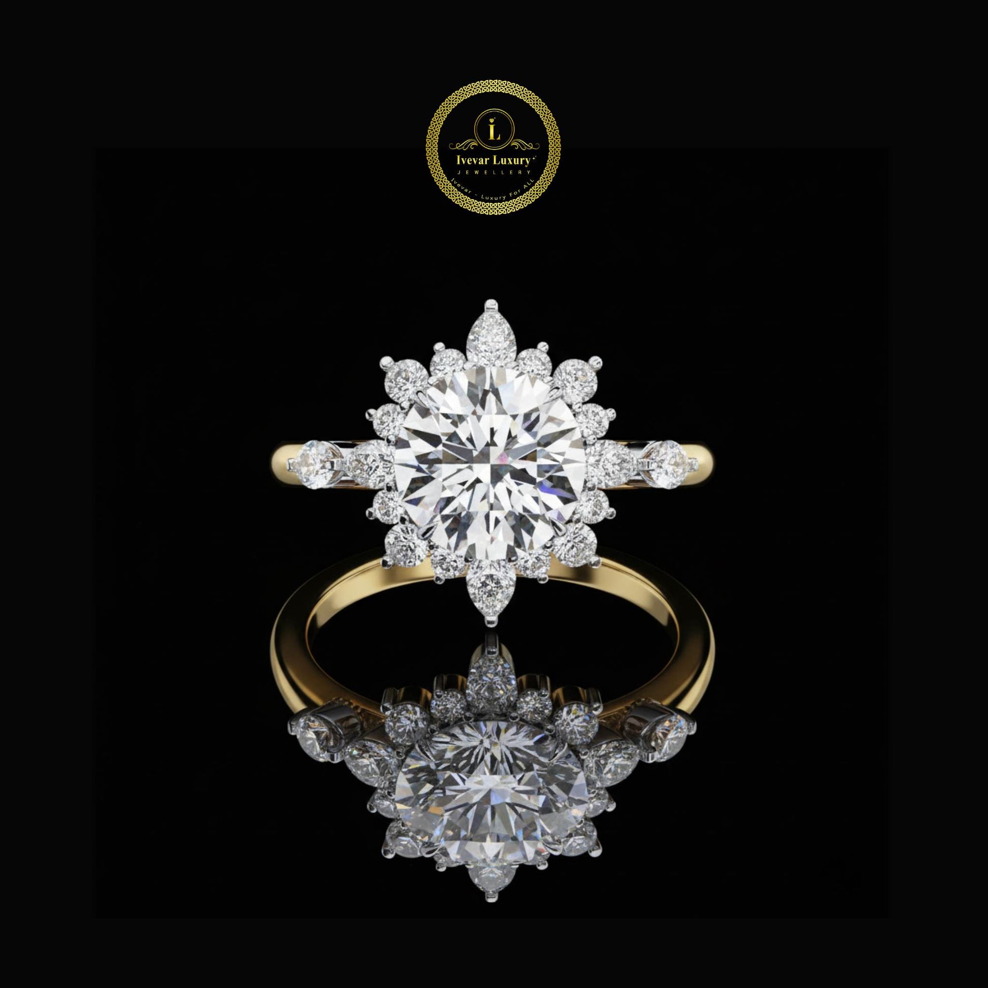 1.67 CT Lab Grown Diamond Round Cut Sunburst Halo Engagement Ring with Brilliant Center and Gold Band Luxury Statement Bridal Jewelry