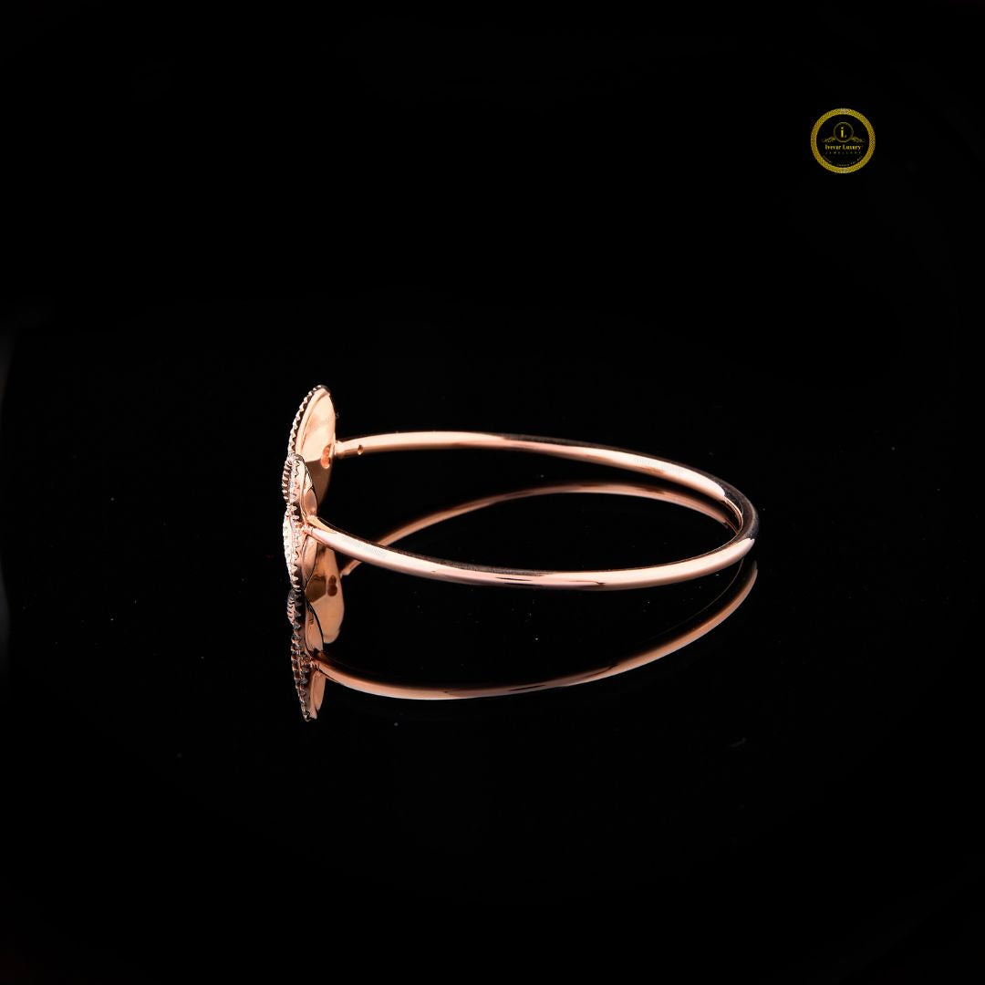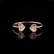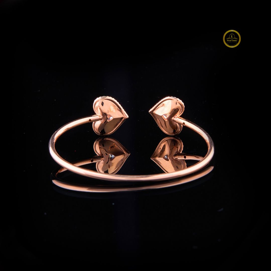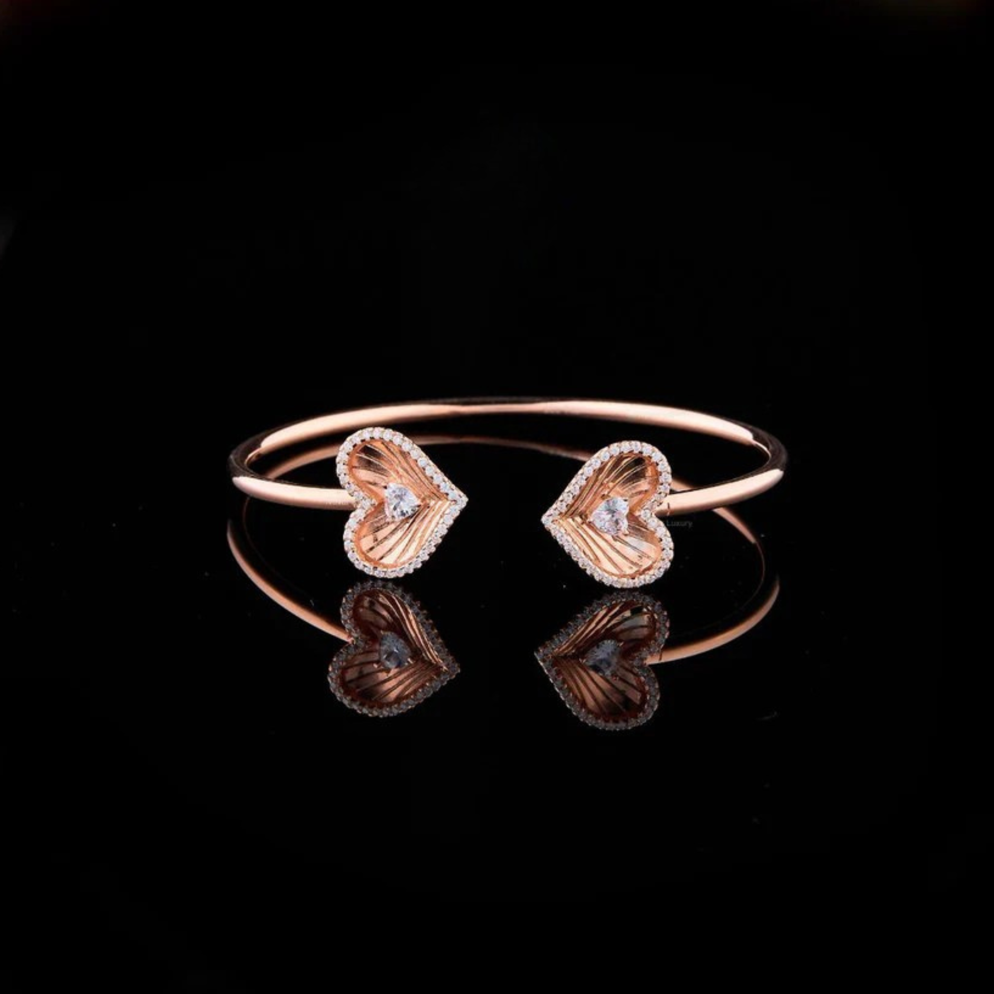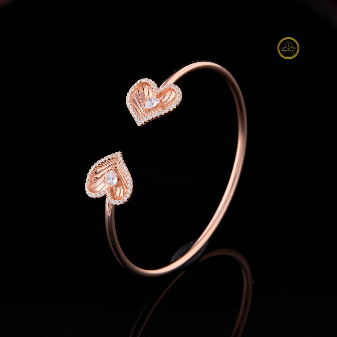 This elegant open-ended bracelet features two beautifully crafted heart-shaped accents, each adorned with a textured rose-gold finish and framed by a delicate border of shimmering round diamonds. At the center of each heart sits a small, sparkling gem that adds a refined touch of brilliance. The slender, polished band enhances the bracelet’s modern, romantic aesthetic, while the heart accents highlights its luxurious shine and intricate detailing from Ivevar Collection.