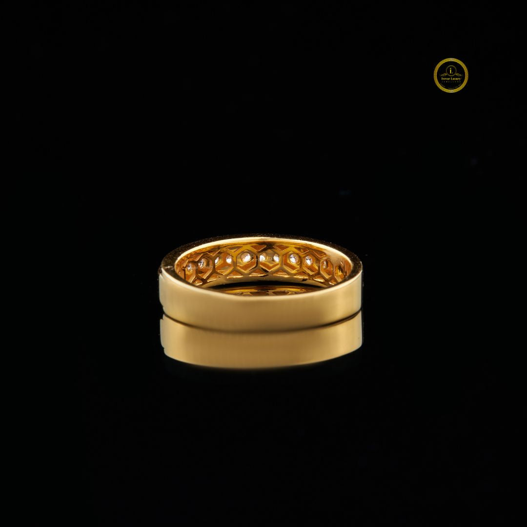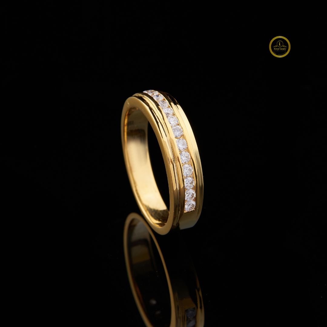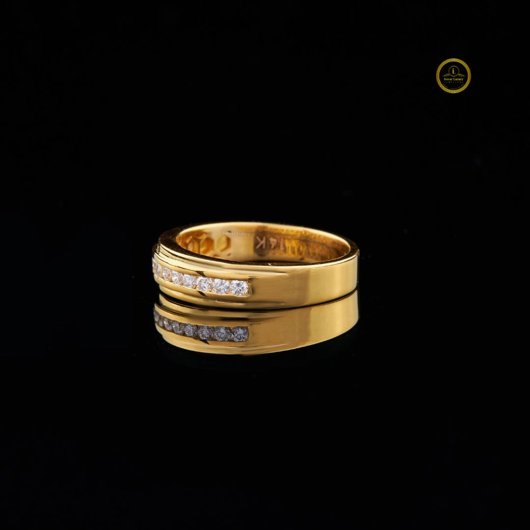This uniquely crafted ring features a warm, lustrous gold band that frames a striking horizontal line of Round-set diamonds, creating a seamless ribbon of light that reflects beautifully against the polished metal; its refined contours, mirror-like shine, and meticulous detailing give it a distinctive character that blends modern artistry with timeless luxury, making it an unforgettable statement piece for any jewelry collection.