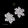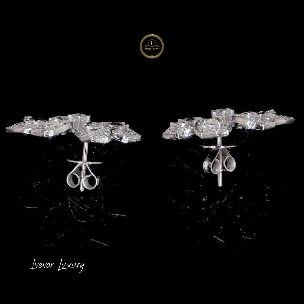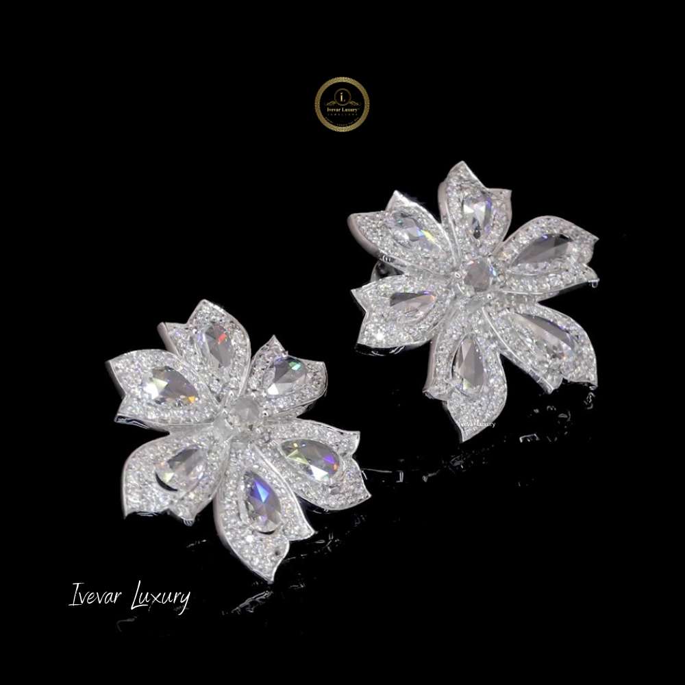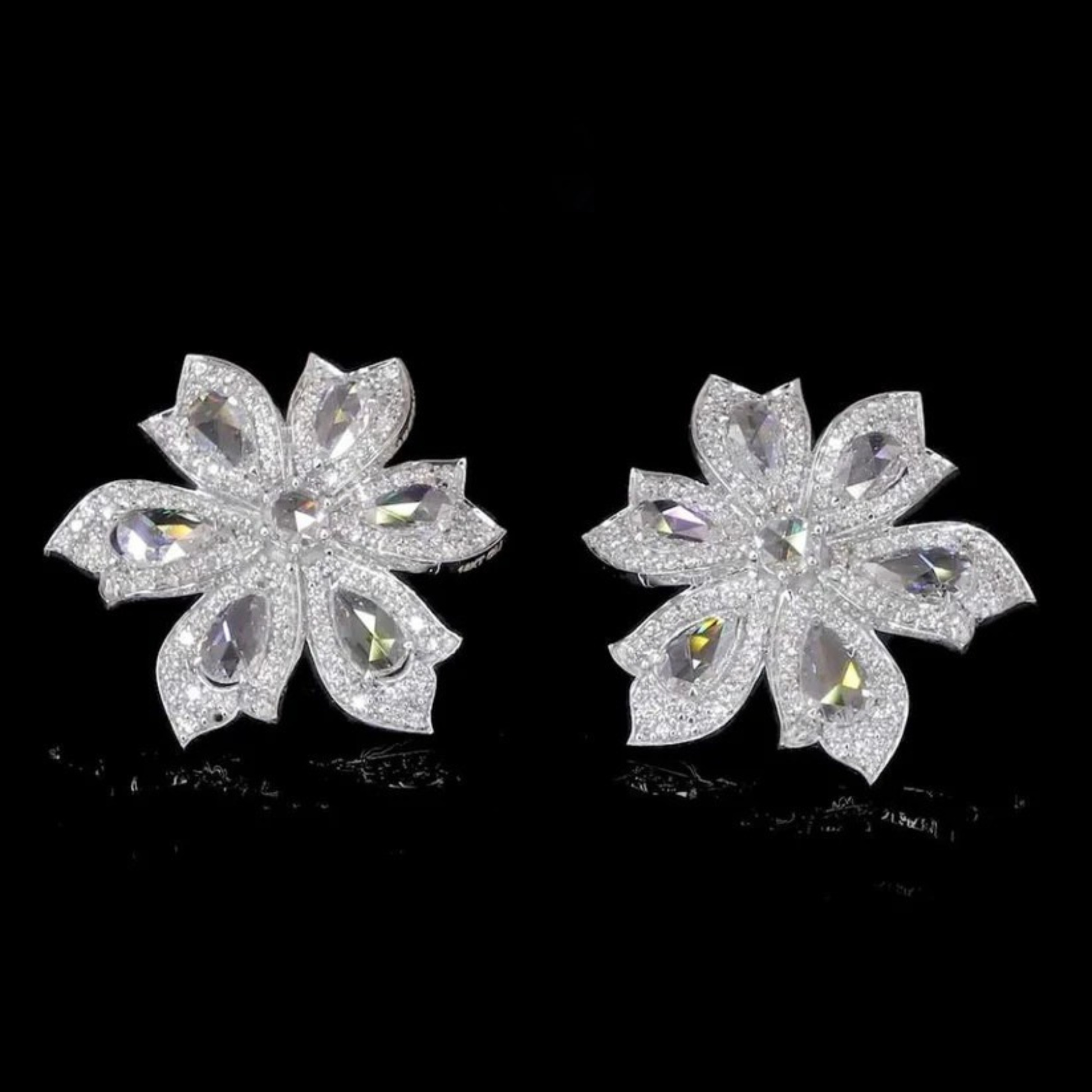 This pair of exquisite 14k white gold earrings is designed in a striking floral motif, embodying luxurious nature-inspired elegance. Each earring features petals formed by dazzling, pear-shaped rose-cut natural diamonds, offering a soft, romantic shimmer distinct from modern brilliant cuts. The center of the flower and the borders of the petals are likely paved with smaller, brilliant-cut diamonds, maximizing the overall sparkle. This combination of different diamond cuts creates incredible depth and texture. The substantial size makes them a bold, yet sophisticated statement piece, perfect for adding high glamour to an evening look or wedding attire. They are a testament to fine craftsmanship and timeless style.