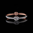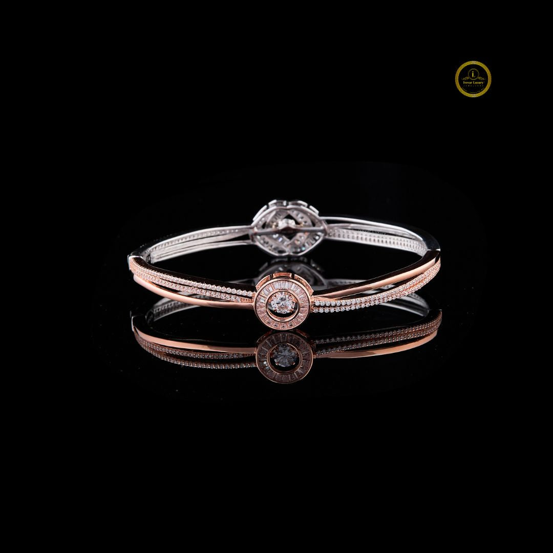 This elegant two-tone bracelet features a sleek blend of white and rose metal tones, highlighted by a striking geometric diamond centerpiece. Its refined double-band structure and pavé detailing create a perfect balance of sparkle and sophistication. Lightweight, modern, and versatile, this bracelet adds a touch of luxury to both everyday looks and special occasions.