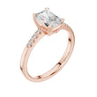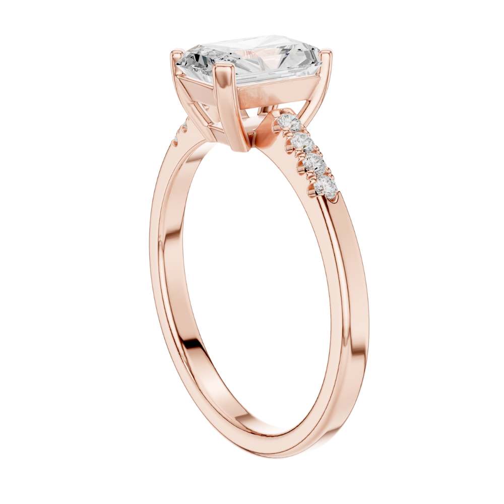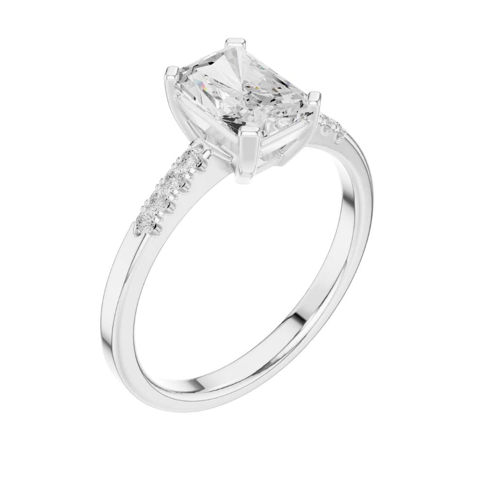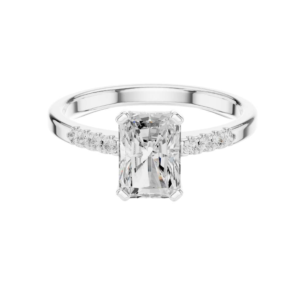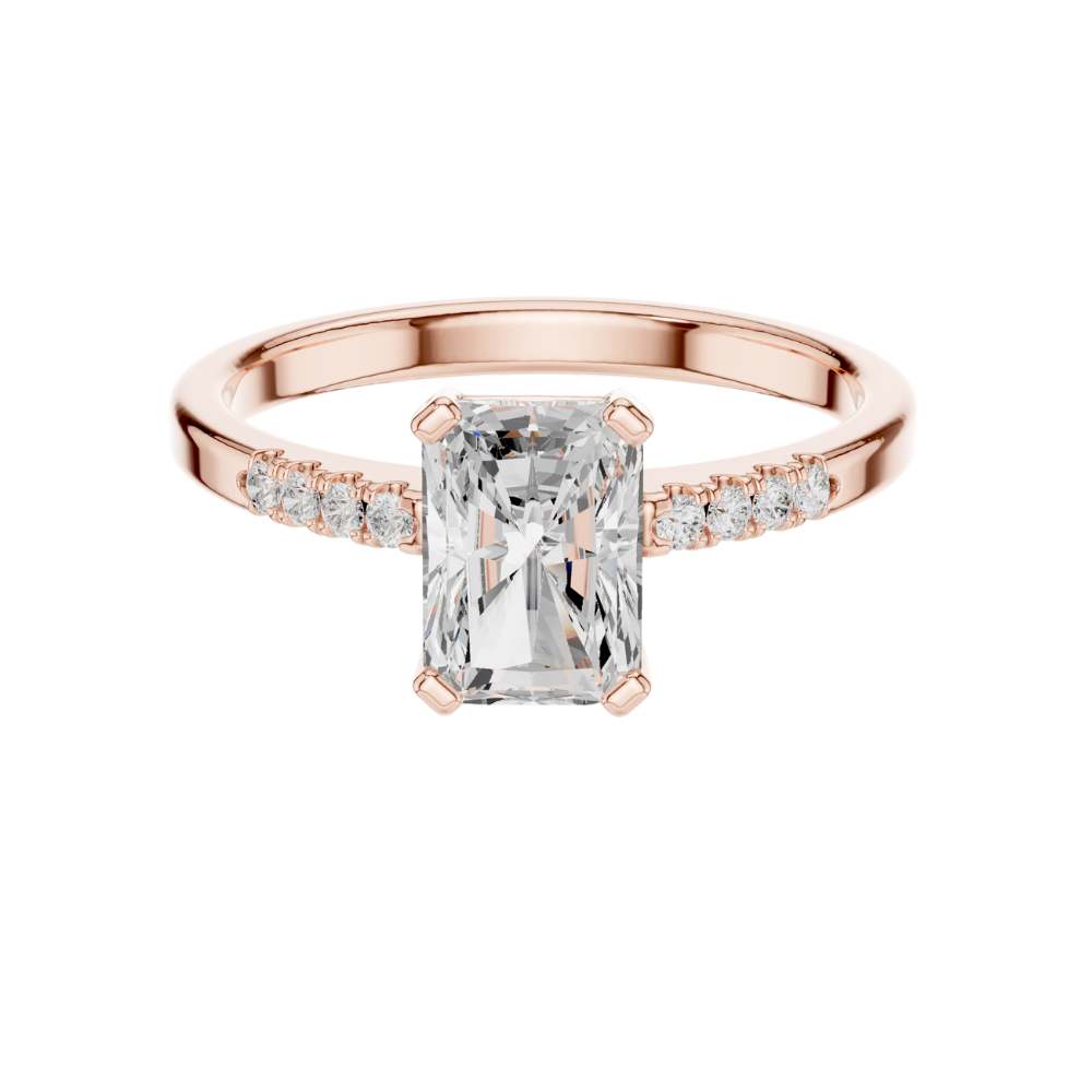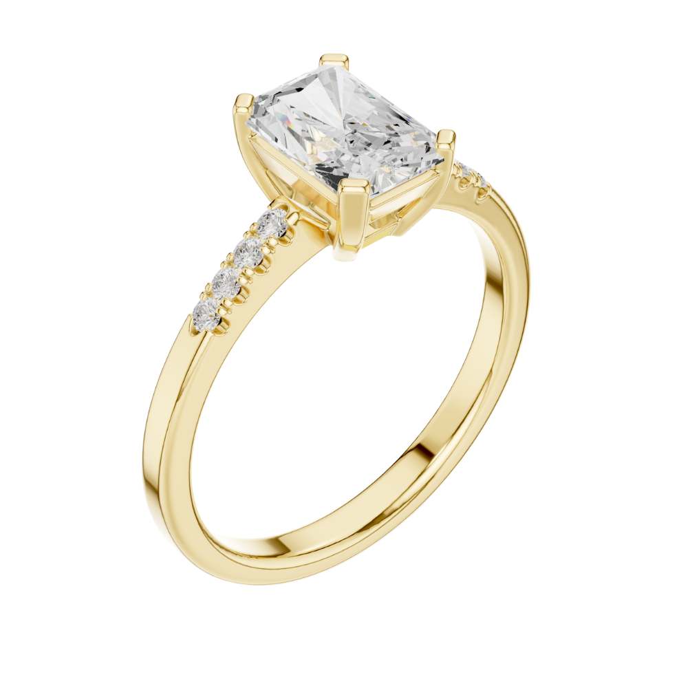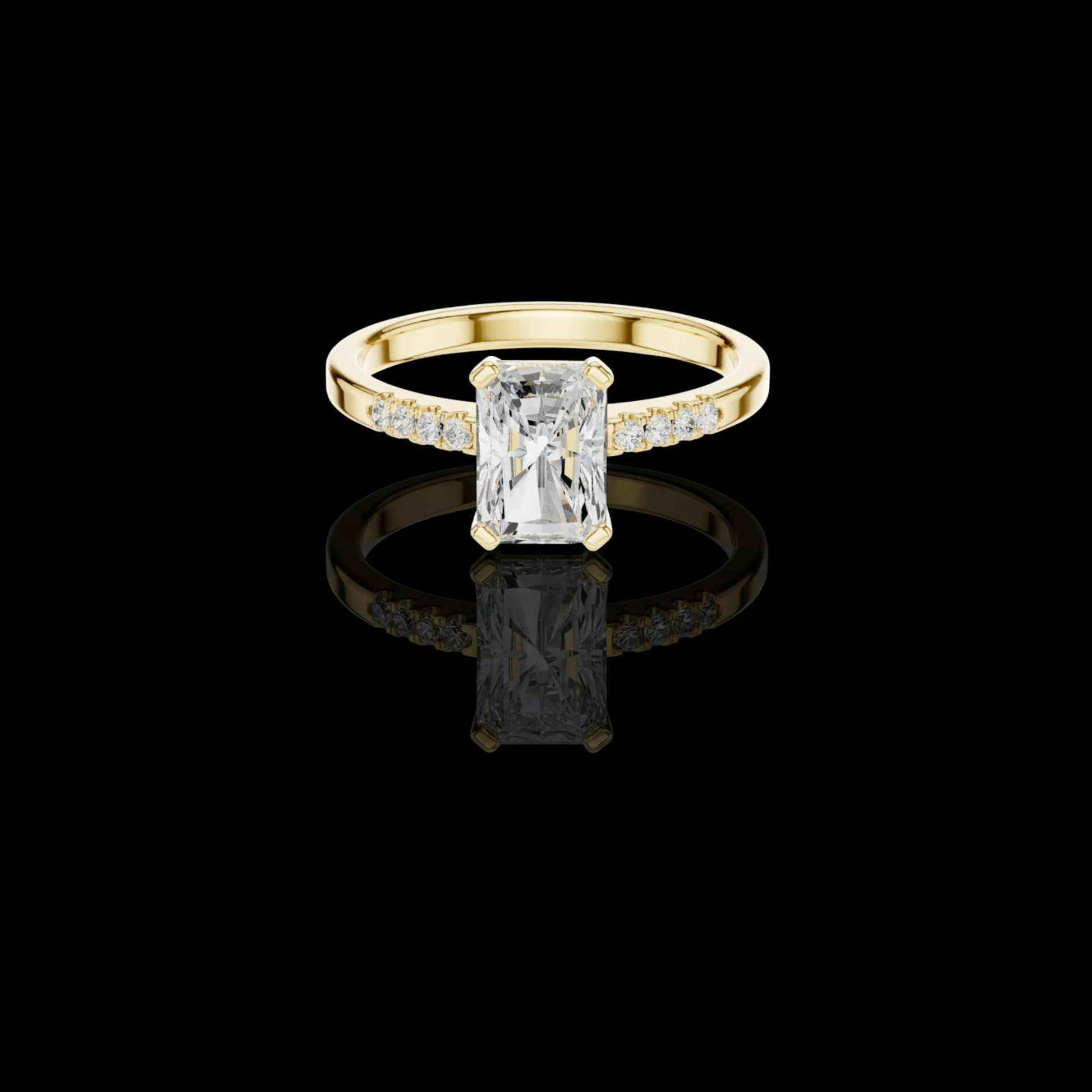 This elegant engagement ring features a stunning radiant-cut center diamond set in polished gold, secured by four refined prongs that highlight its brilliance. The band is adorned with sparkling pave-set round diamonds on each side, adding a graceful touch of shimmer without overpowering the centerpiece. Its clean lines, modern silhouette, and timeless materials create a sophisticated design that balances luxury and simplicity—perfect for someone who appreciates both classic beauty and contemporary flair.