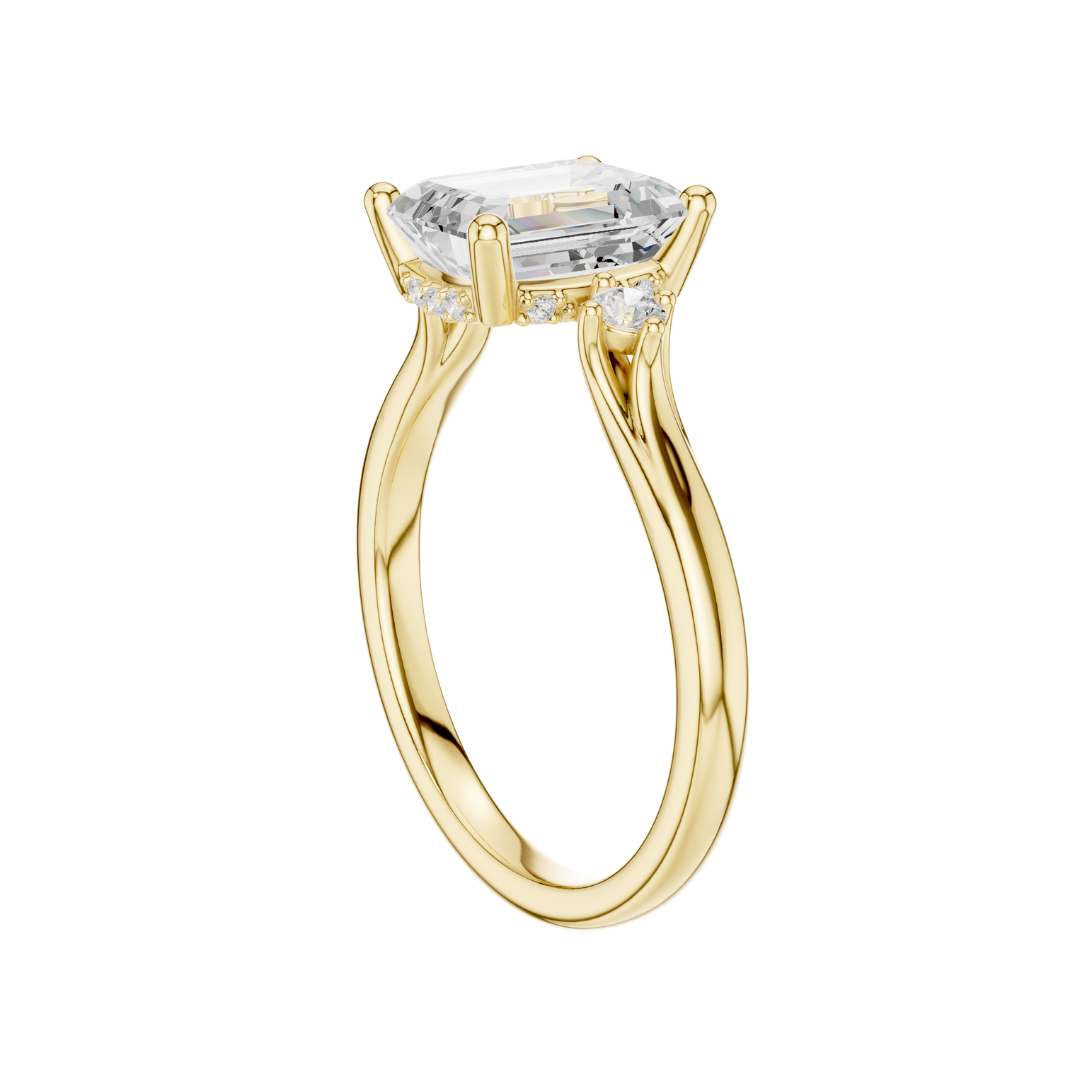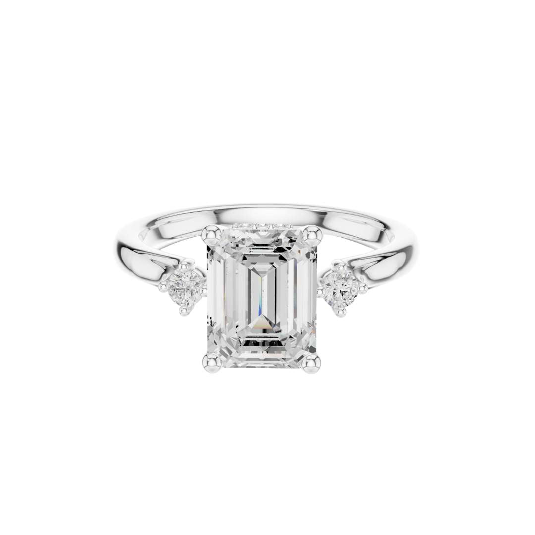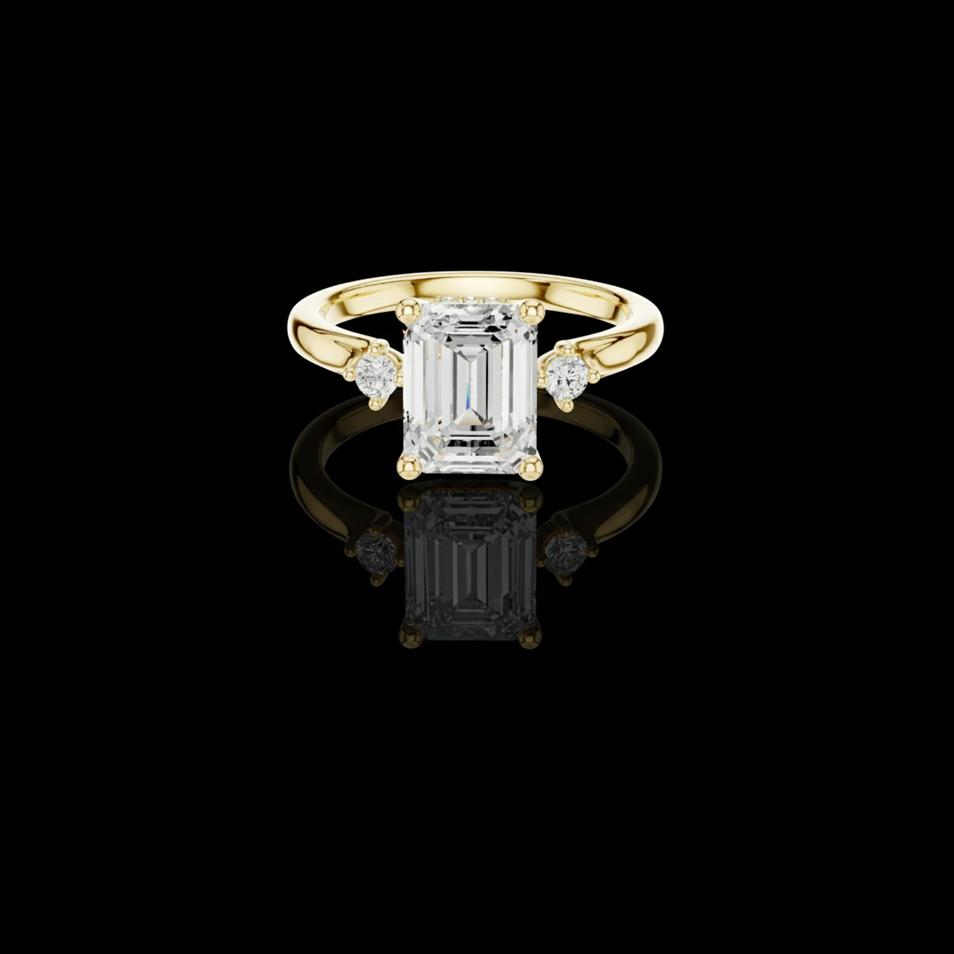 This sophisticated engagement ring showcases a stunning emerald-cut diamond as its centerpiece, held securely in a four-prong gold setting that enhances its clean lines and captivating depth. Two brilliant round side stones add a graceful touch of sparkle, creating a balanced and refined three-stone design. With its sleek geometry and timeless elegance, this ring blends modern luxury with classic romance by Ivevar.