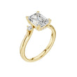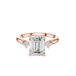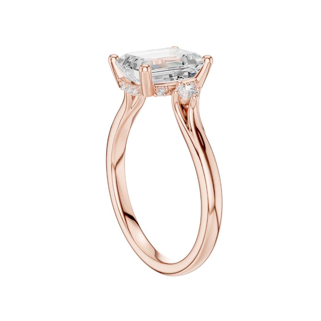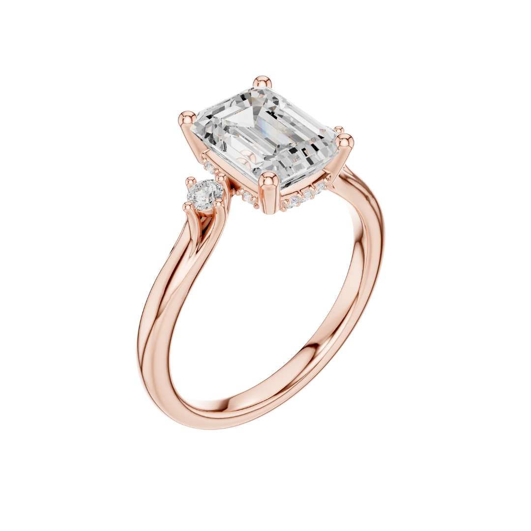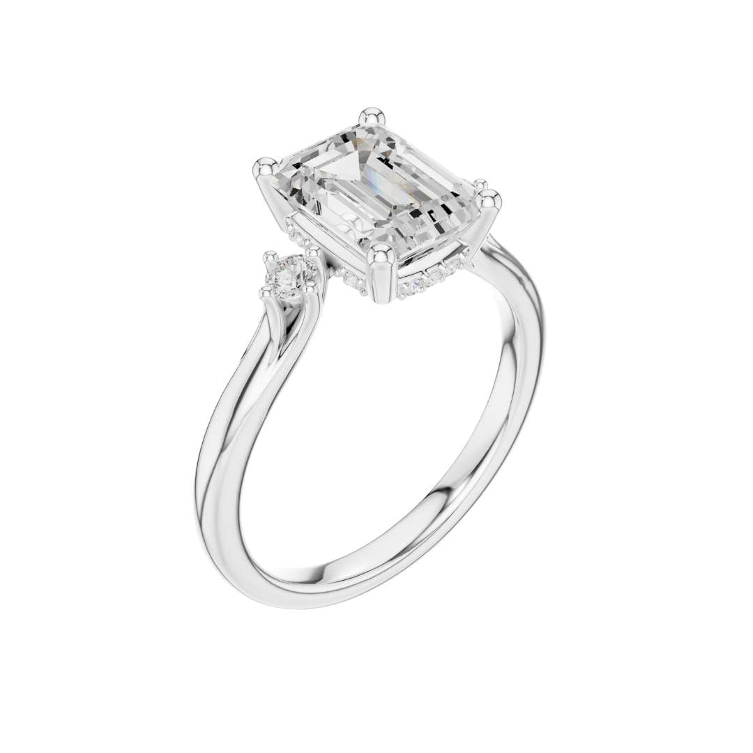 This sophisticated engagement ring showcases a stunning emerald-cut diamond as its centerpiece, held securely in a four-prong gold setting that enhances its clean lines and captivating depth. Two brilliant round side stones add a graceful touch of sparkle, creating a balanced and refined three-stone design. With its sleek geometry and timeless elegance, this ring blends modern luxury with classic romance by Ivevar.