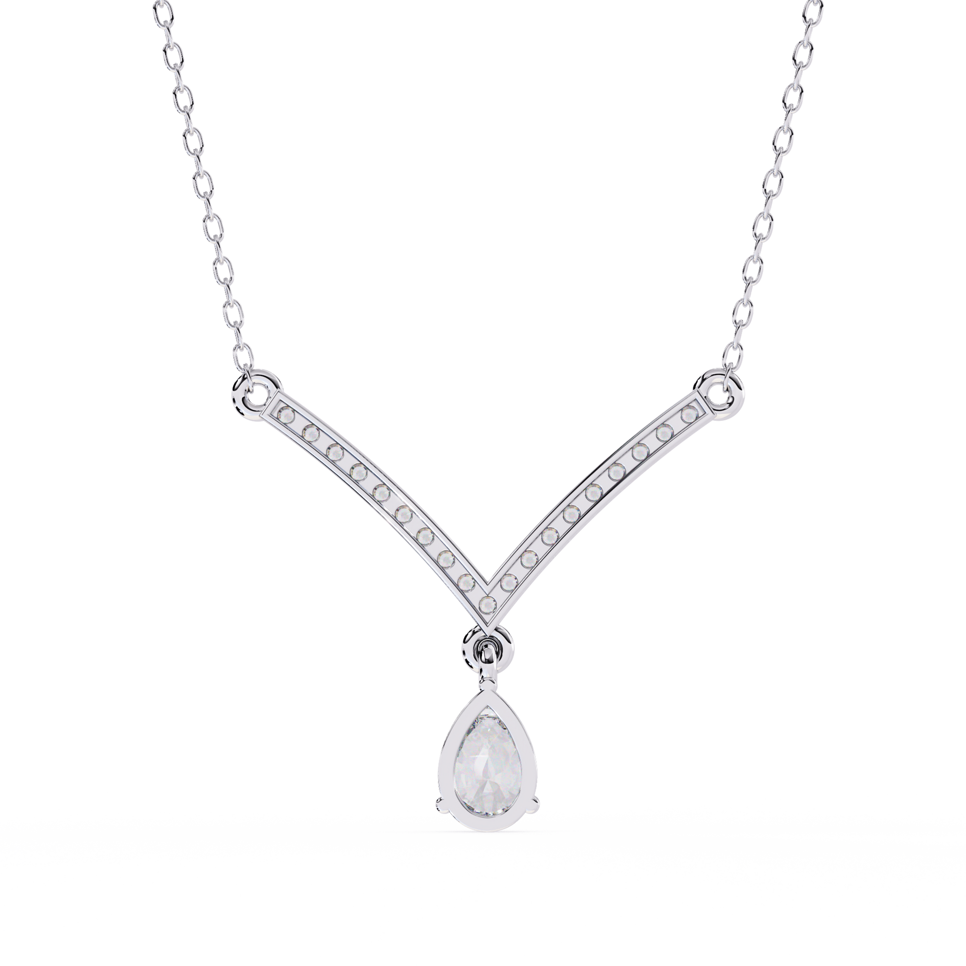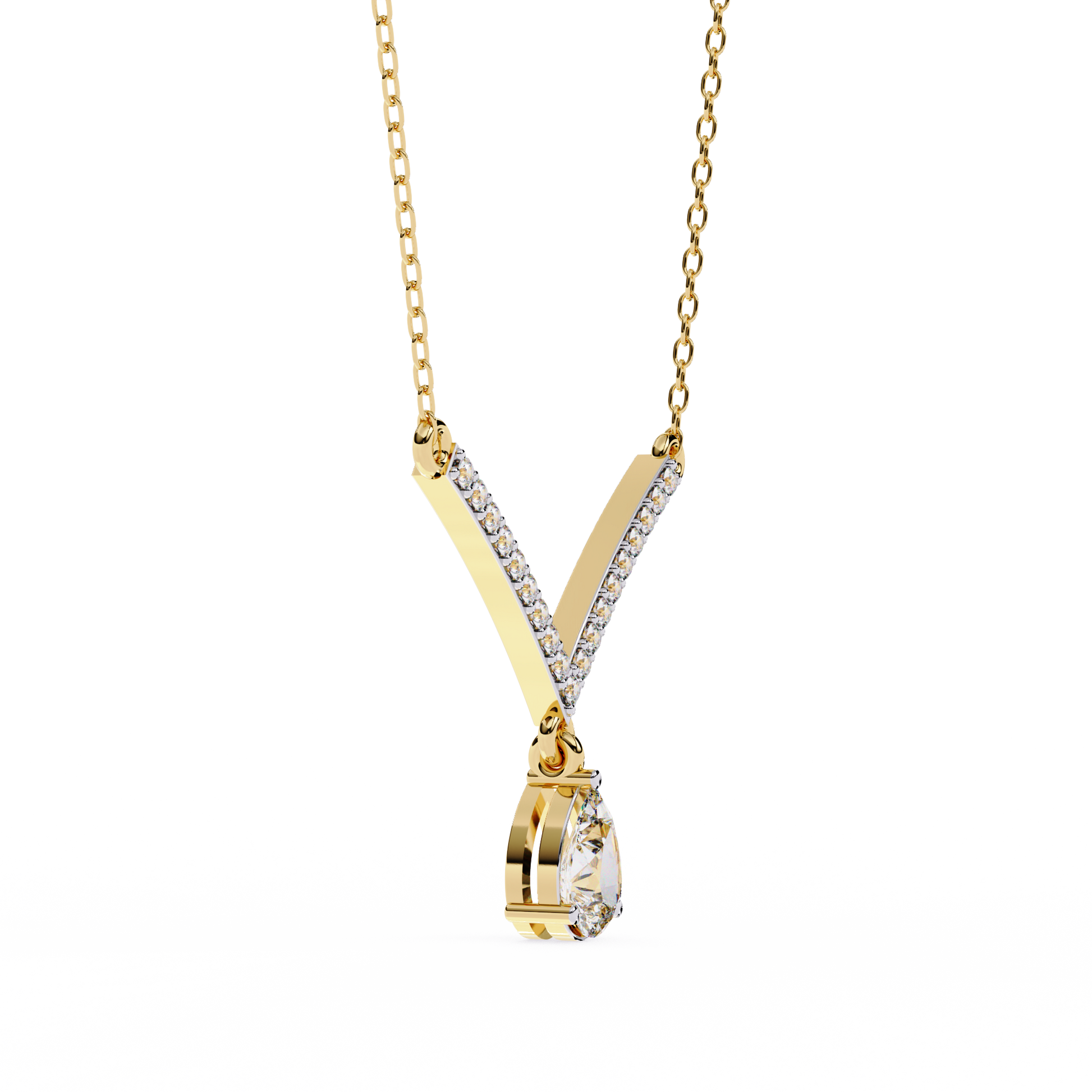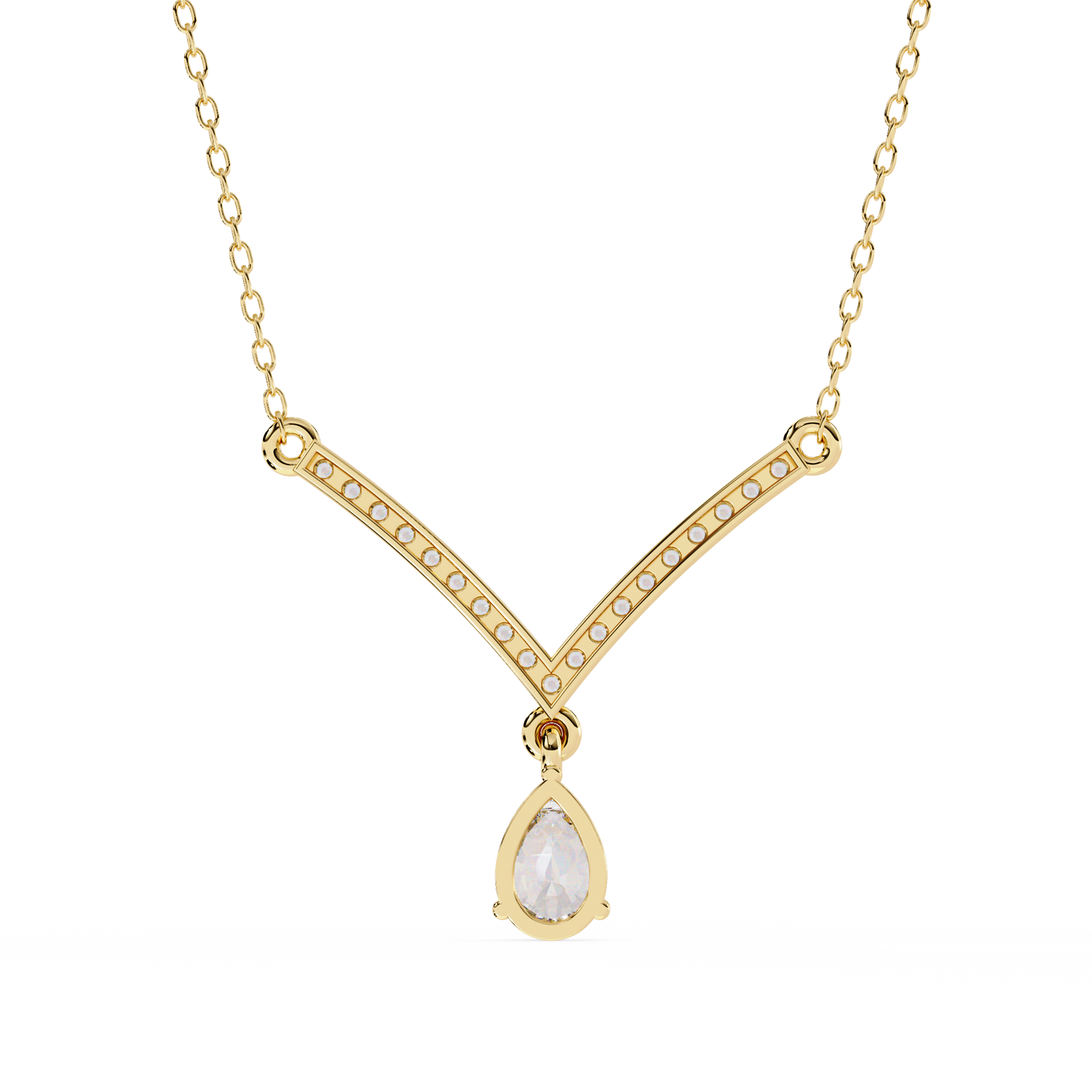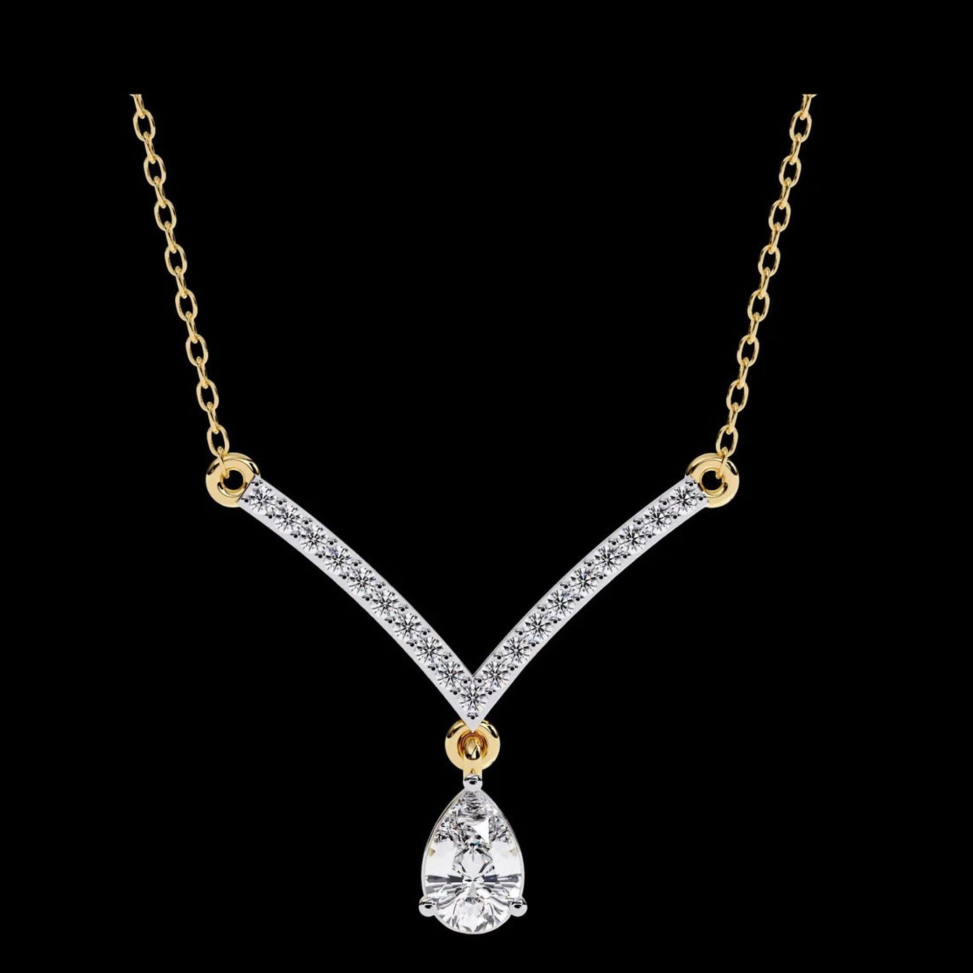 Experience the brilliance of Ivevar Luxury with this breathtaking V-shaped diamond necklace, masterfully designed to capture elegance and sophistication. The radiant V-curve is adorned with a line of meticulously set round diamonds, gracefully meeting at a stunning pear-cut centerpiece that glistens with every movement. Crafted in lustrous gold, this necklace combines timeless artistry with contemporary charm. Perfect for bridal wear, anniversaries, or special celebrations, it embodies the essence of luxury and refinement.