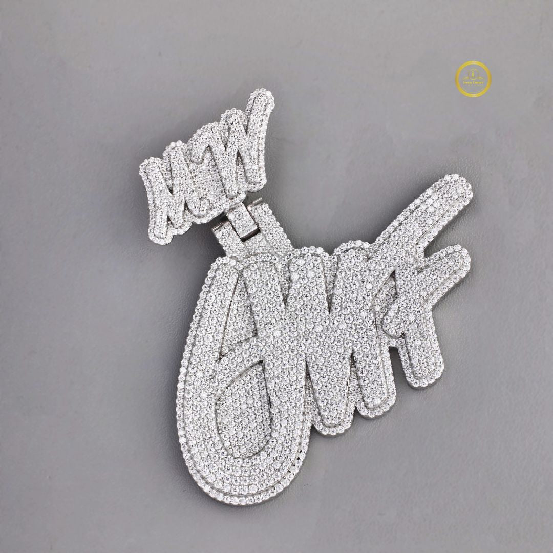 This striking piece is a custom lab-grown diamond pendant, characteristic of luxury hip-hop jewelry. The piece showcases meticulous pave setting, where numerous small, brilliant-cut lab diamonds cover the entire surface, maximizing sparkle and brilliance. The design is a bold, stylized script—appearing to be initials like "6MF" or a short word—giving it a high level of personalization. The use of lab-grown diamonds provides a sustainable and cost-effective alternative to natural diamonds, offering exceptional quality and fire. It is a substantial statement piece meant to be worn on a thick chain.