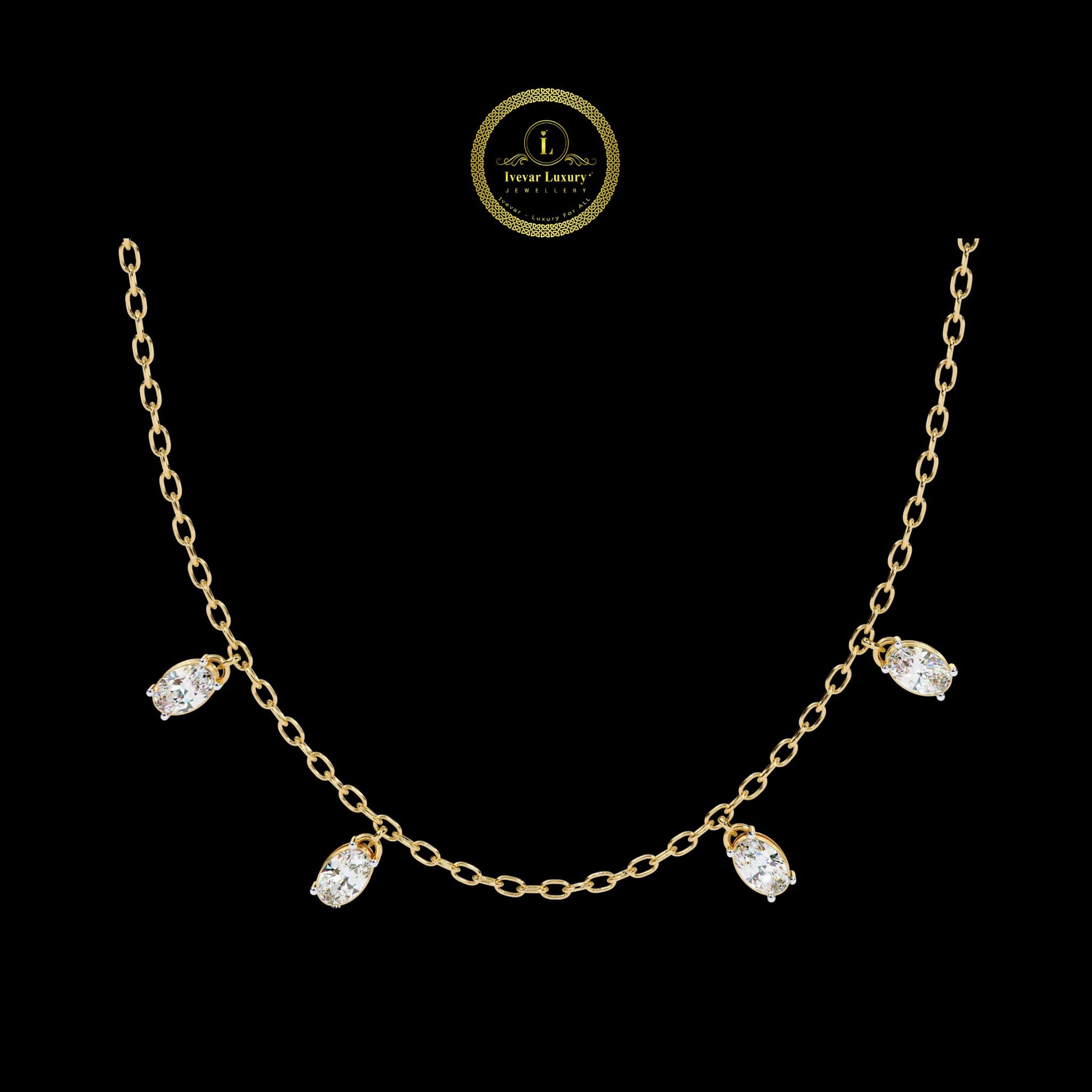 This exquisite gold chain necklace showcases timeless elegance with its delicate design and sparkling accents. Featuring four beautifully cut teardrop-shaped diamond that dangle gracefully along a fine gold chain, the necklace adds a subtle touch of sophistication to any outfit. Perfect for both everyday wear and special occasions, this piece captures the essence of understated ivevar luxury. Whether worn alone or layered with other necklaces, it makes a stunning statement of style and refinement.