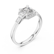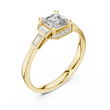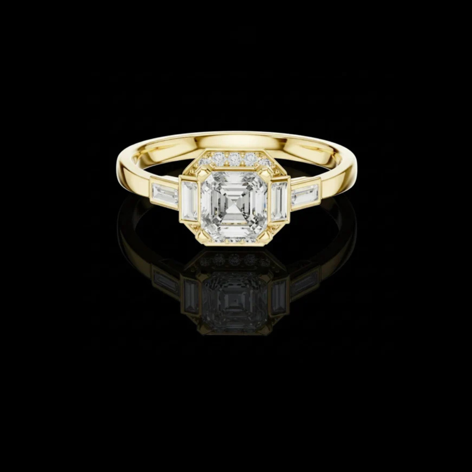 This stunning ring features a brilliant center-cut Asscher diamond, known for its unique stepped facets and hypnotic 'hall of mirrors' effect. The geometric center stone is framed by a delicate halo of round pavé-set diamonds on the top and bottom. On each side, sparkling straight baguette-cut diamonds extend the design, creating a classic three-stone style with a distinct Art Deco sensibility. Crafted in lustrous yellow gold, this ring is an elegant choice for an engagement or a significant anniversary gift. Its blend of vintage design and modern craftsmanship makes it a truly timeless piece of fine jewelry.