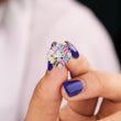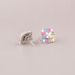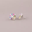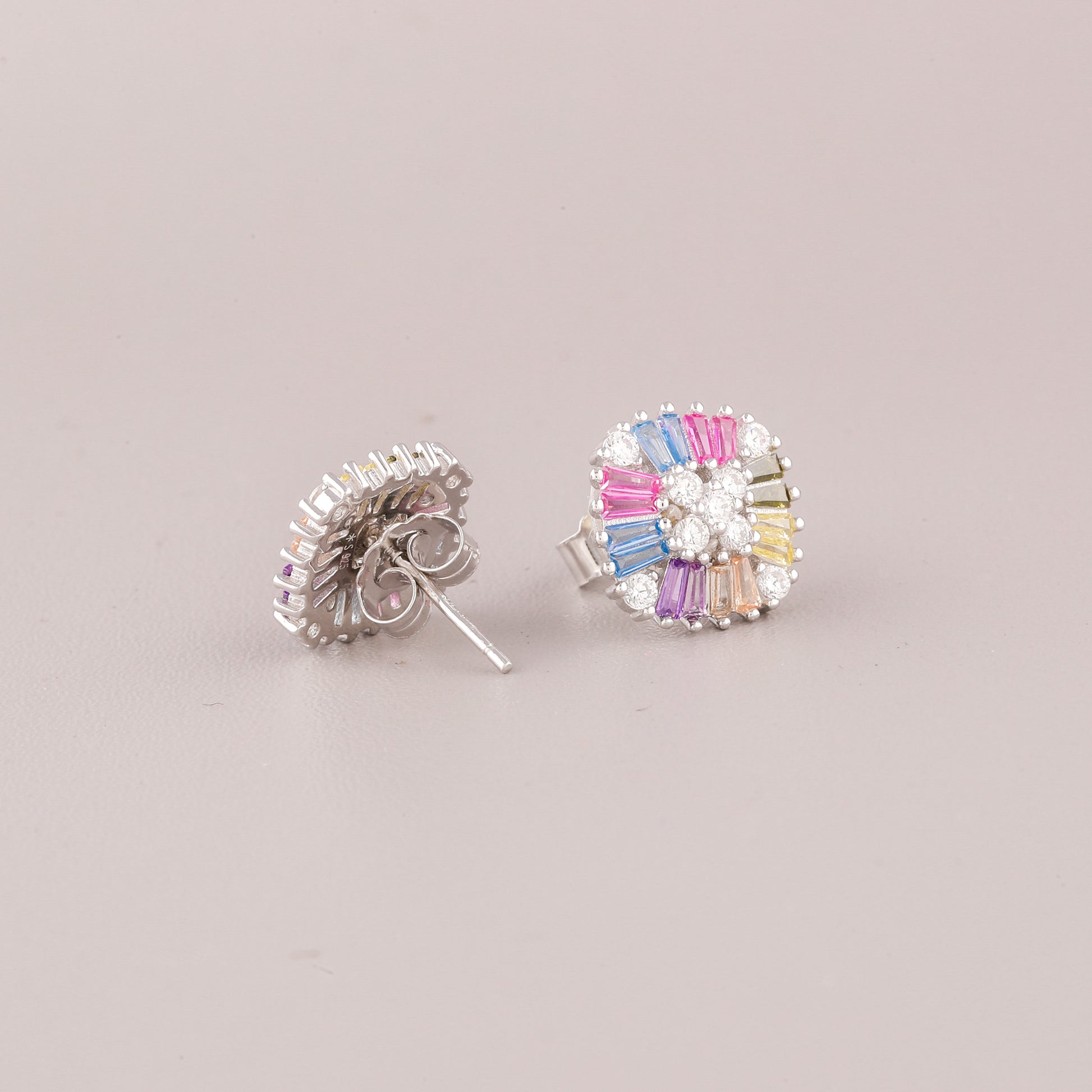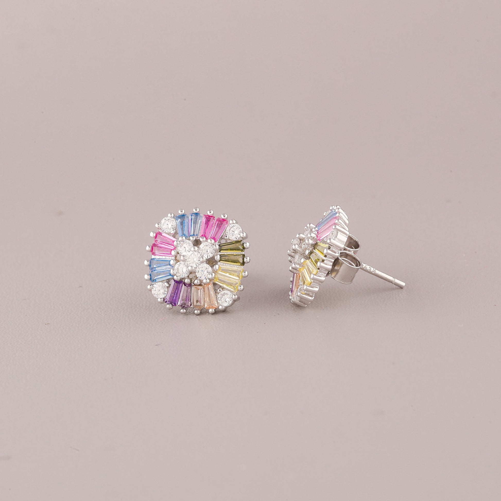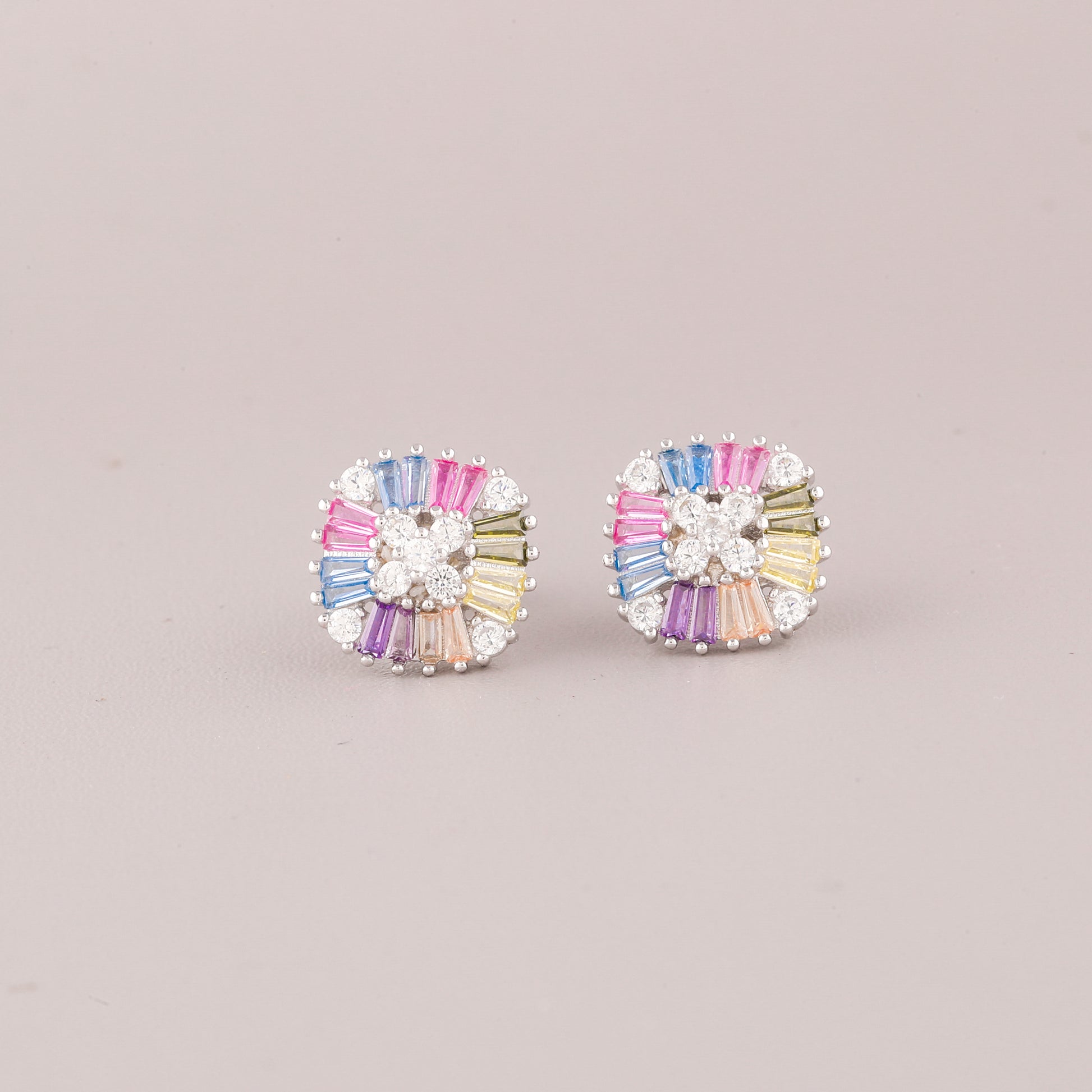 This image showcases a vibrant pair of Silver-Tone Rainbow Baguette Cluster Stud Earrings. The design presents a striking, modern cluster with a slightly square outline. At the center, a delicate cross of clear, round stones (likely diamonds or cubic zirconia) acts as a focal point. Radiating outwards are short, tapered baguette-cut stones in a cheerful array of soft "natural rainbow" colors, including pink, blue, yellow, purple, and green. The colorful baguettes are interspersed with small clusters of clear stones, and the entire piece is set in a bright silver-tone metal. These studs are a beautiful blend of geometric style and playful, wearable color.