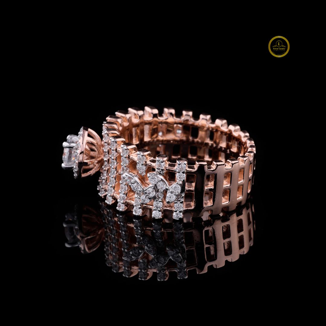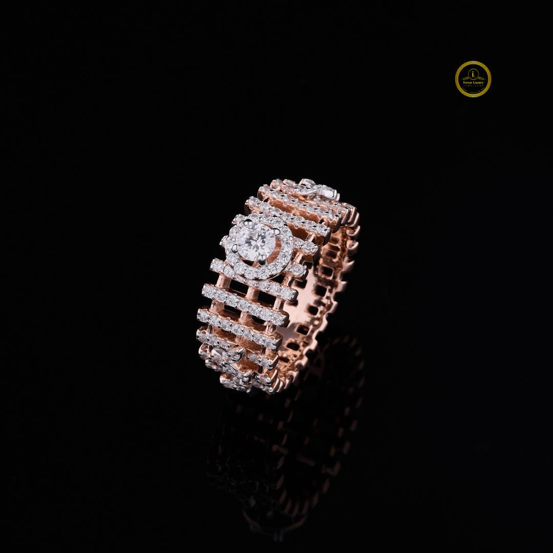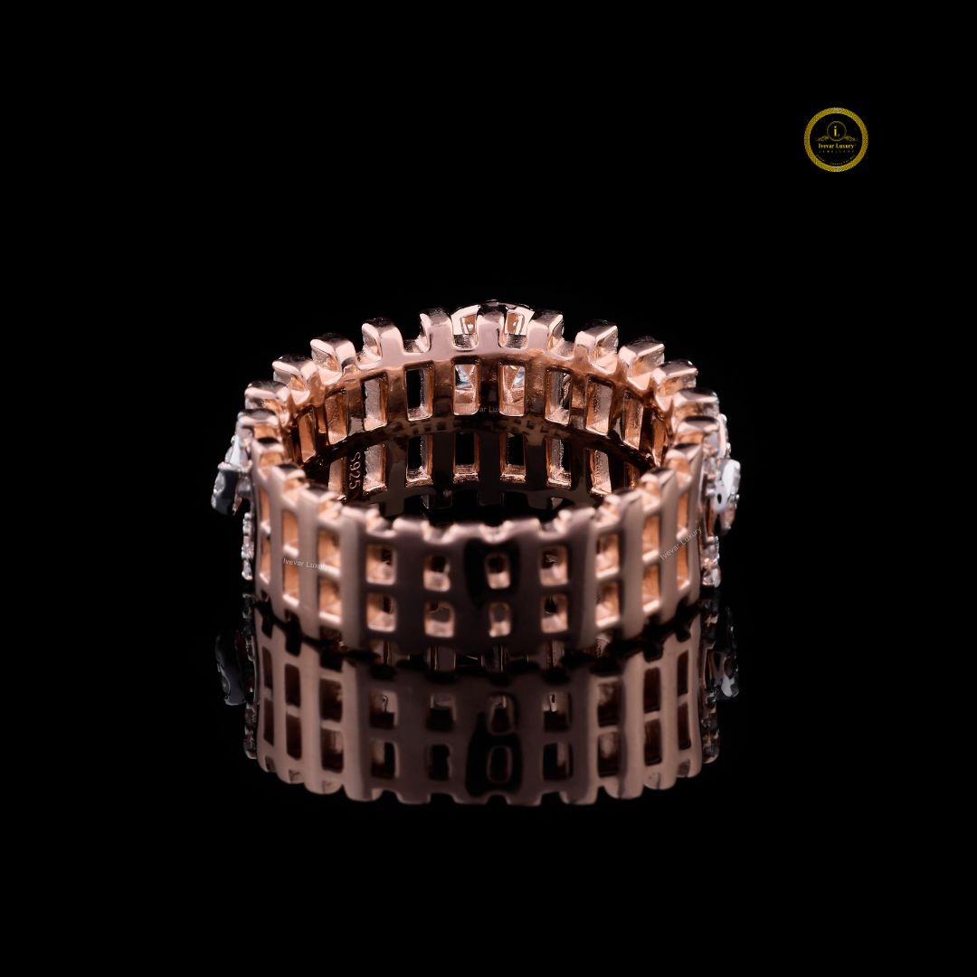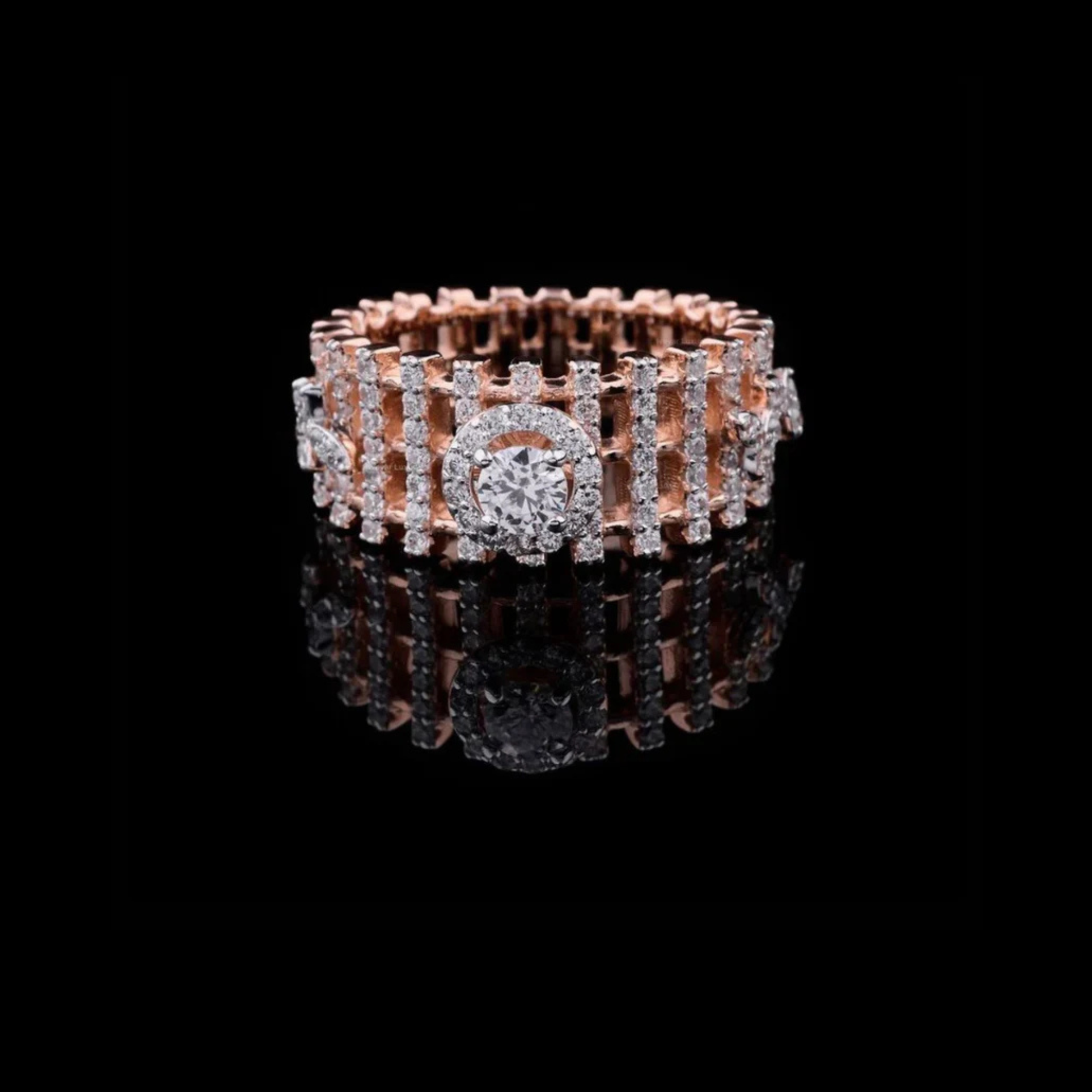 This elegant rose-gold ring features a sophisticated pattern of vertical pavé-set links, each adorned with a brilliant round diamond encircled by a shimmering halo, creating a striking balance of modern structure and timeless luxury. Its architectural design reflects light beautifully from every angle, making the band both eye-catching and refined. Crafted for comfort and durability, this piece serves as a standout statement ring or a luxurious addition to any jewelry collection, offering a perfect blend of artistry, sparkle, and elevated style.