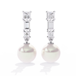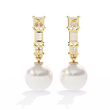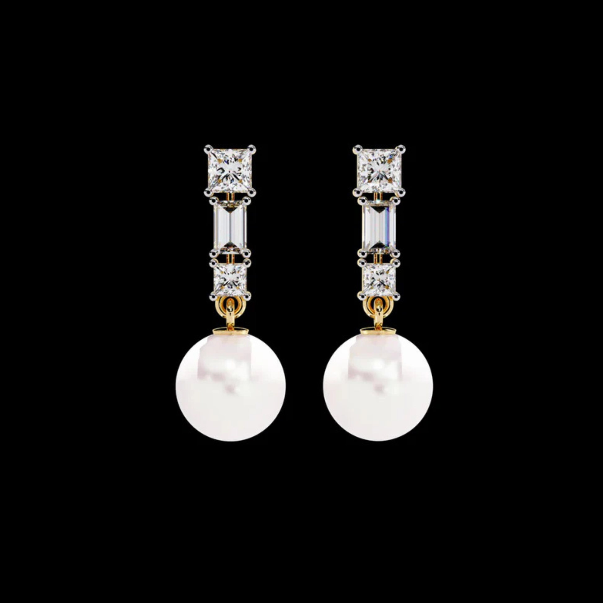 Refined elegance meets timeless charm in these Princess-Cut Diamond and Pearl Drop Earrings. Handcrafted in radiant gold, each earring showcases a vertical arrangement of sparkling princess and baguette-cut diamonds, gracefully leading to a luminous round pearl drop. The geometric brilliance of the diamonds contrasts beautifully with the soft luster of the pearls, creating a perfect harmony of modern sophistication and classic grace. Ideal for evening soirées or elegant celebrations, these earrings embody the essence of enduring luxury.