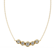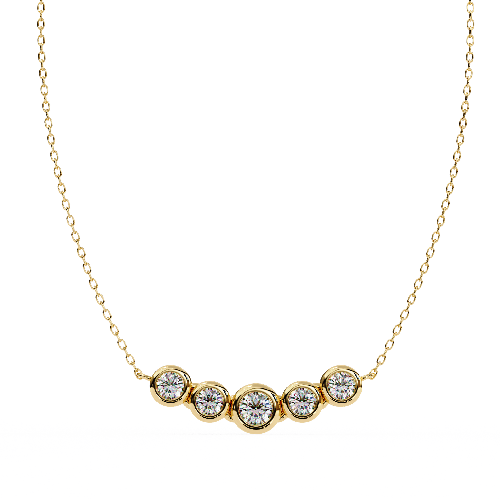 This elegant pendant features five brilliant round diamonds set in smooth, polished gold bezels, arranged in a graceful curved bar that adds subtle sparkle and refined symmetry to the neckline. Suspended from a delicate matching gold chain, the design blends modern minimalism with timeless luxury, making it a versatile piece that transitions effortlessly from everyday wear to special occasions by Ivevar.