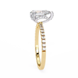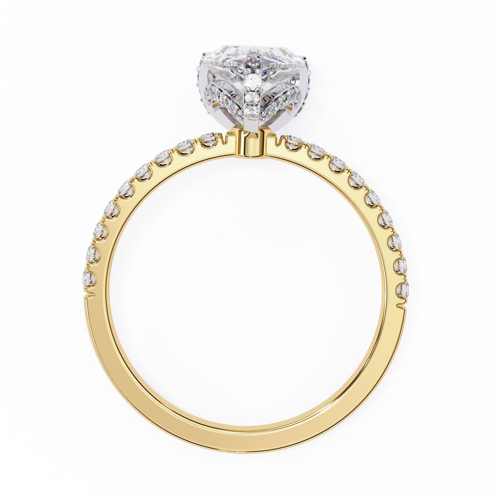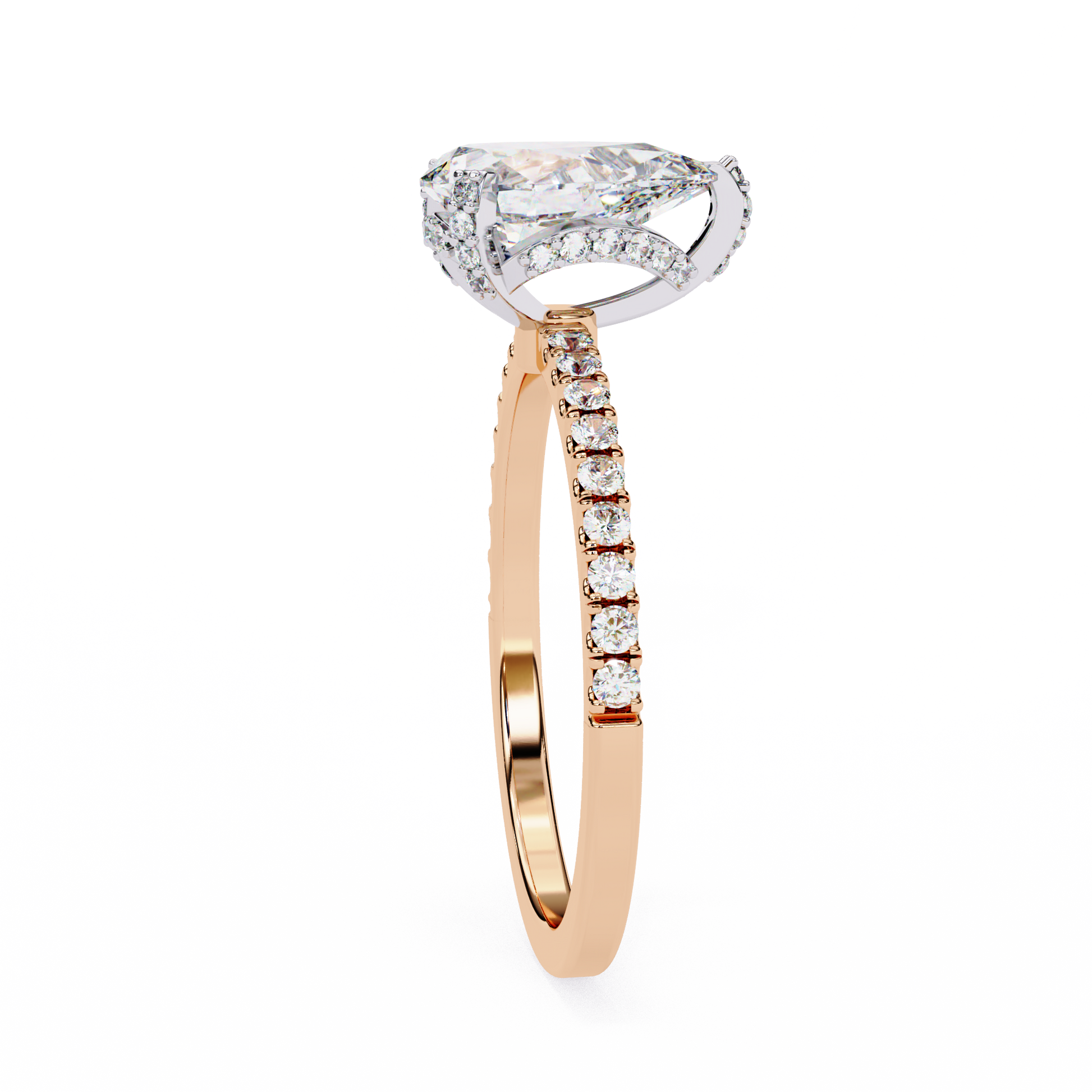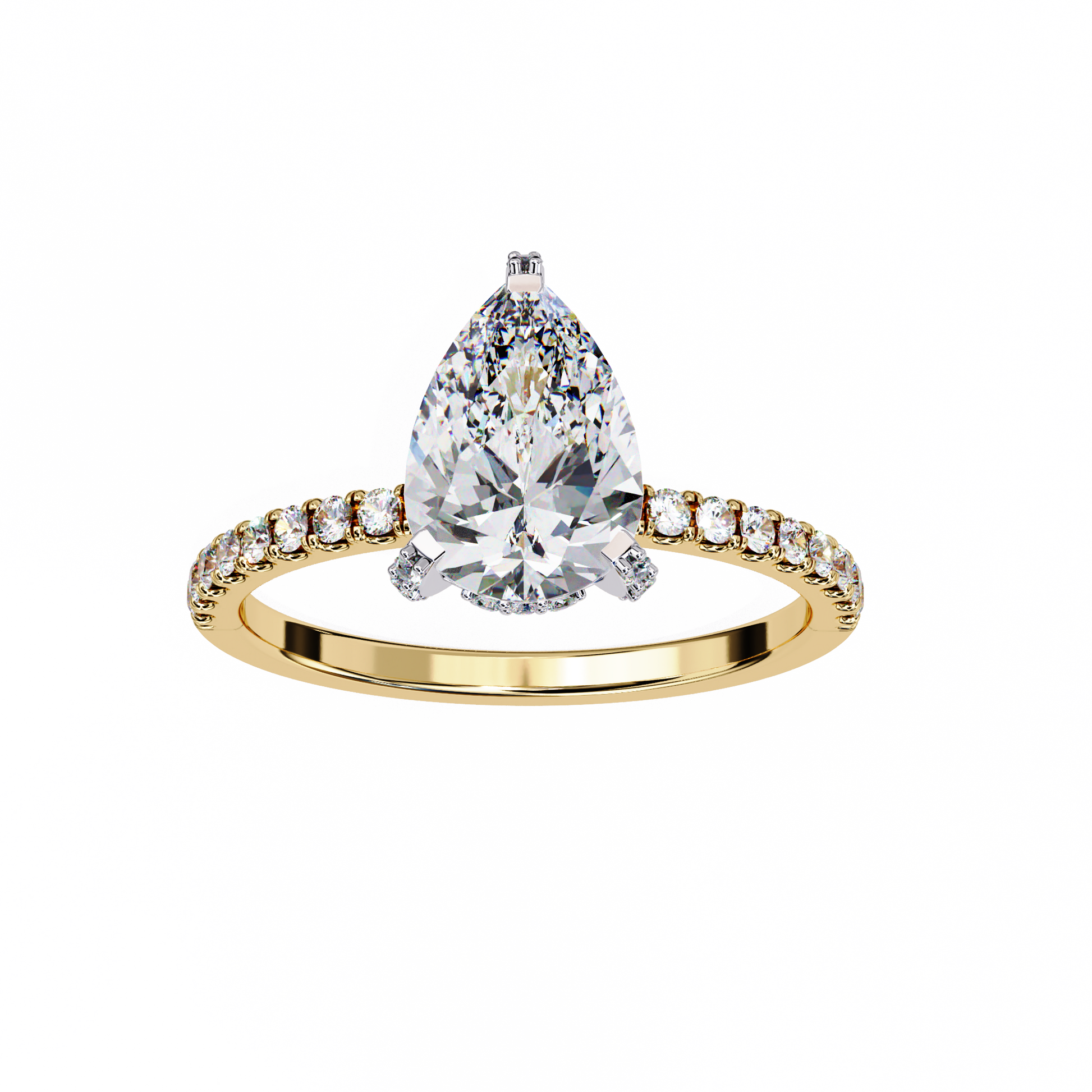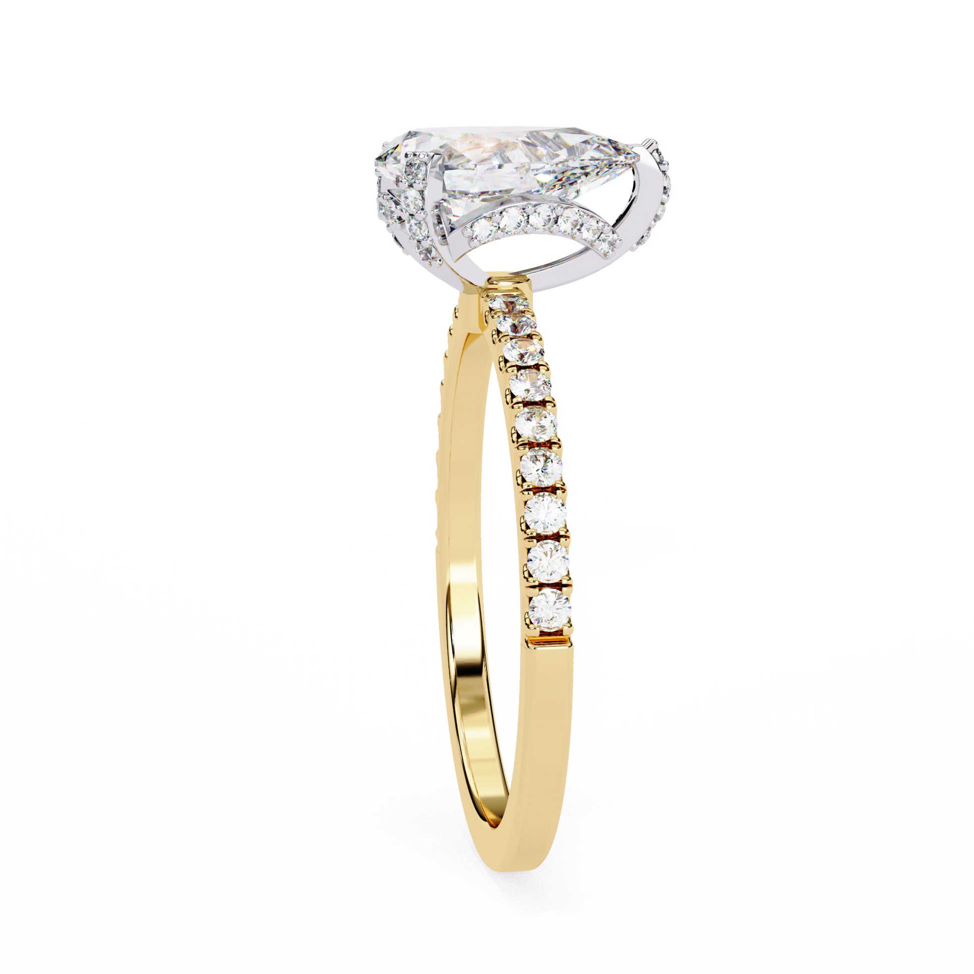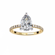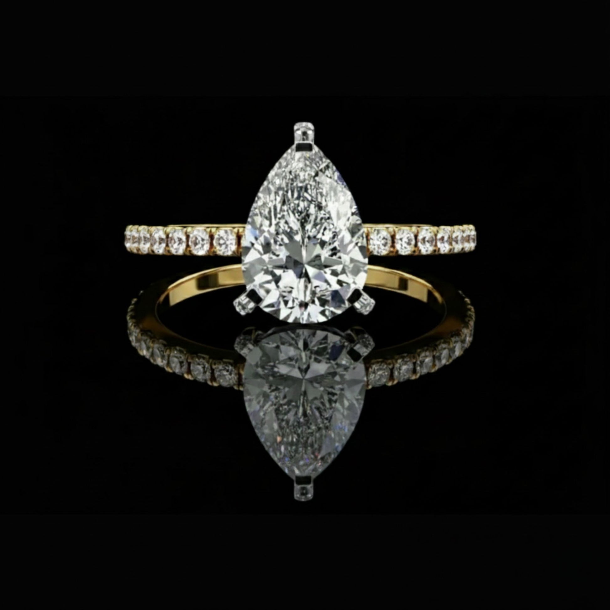 This stunning ring showcases a brilliant pear-shaped diamond as its centerpiece, set in a sleek gold band adorned with a continuous row of sparkling round pavé-set diamonds. The combination of the elongated teardrop shape and the shimmering diamond-encrusted band creates a luxurious, radiant look that catches the light from every angle. Presented against a glossy black background with its flawless reflection beneath, the ring exudes sophistication and timeless elegance, further elevated by the Ivevar Luxury emblem positioned above.