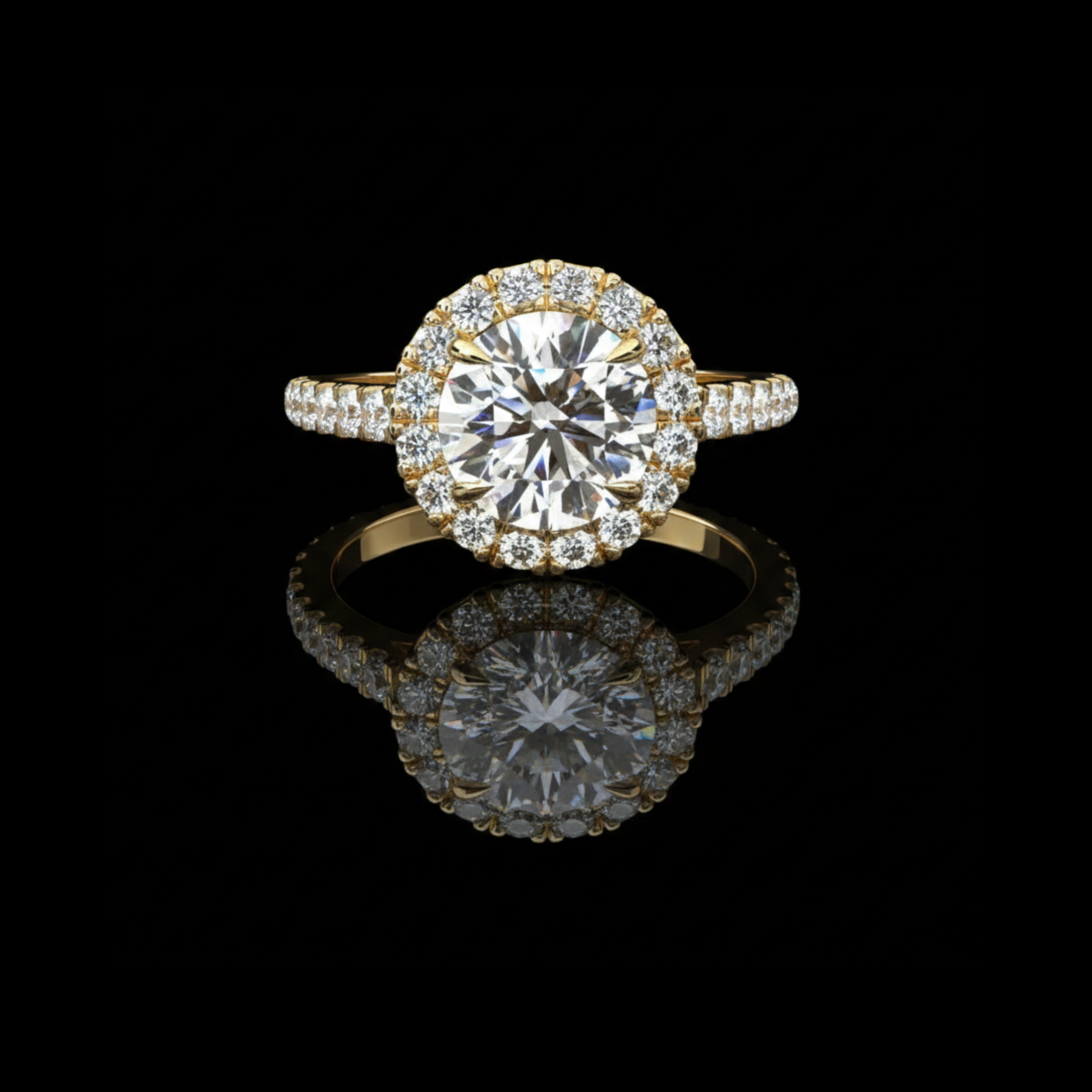 This elegant engagement ring features a brilliant round-cut center diamond surrounded by a sparkling halo of smaller diamonds, all set in luxurious gold. The band is adorned with additional pave set diamonds, enhancing the ring’s overall radiance and giving it a timeless, sophisticated look. Perfect for someone who loves classic elegance with a touch of modern glamour.